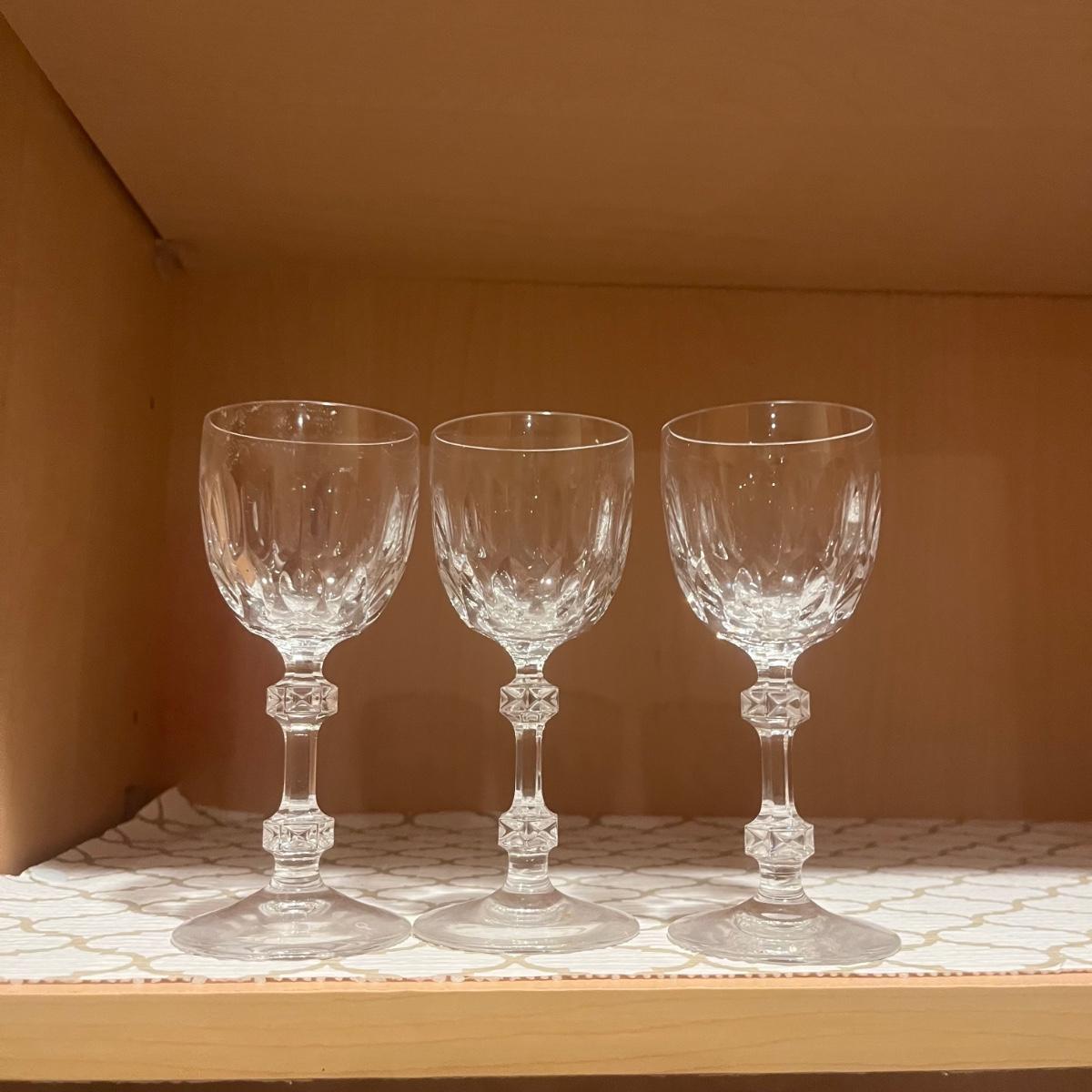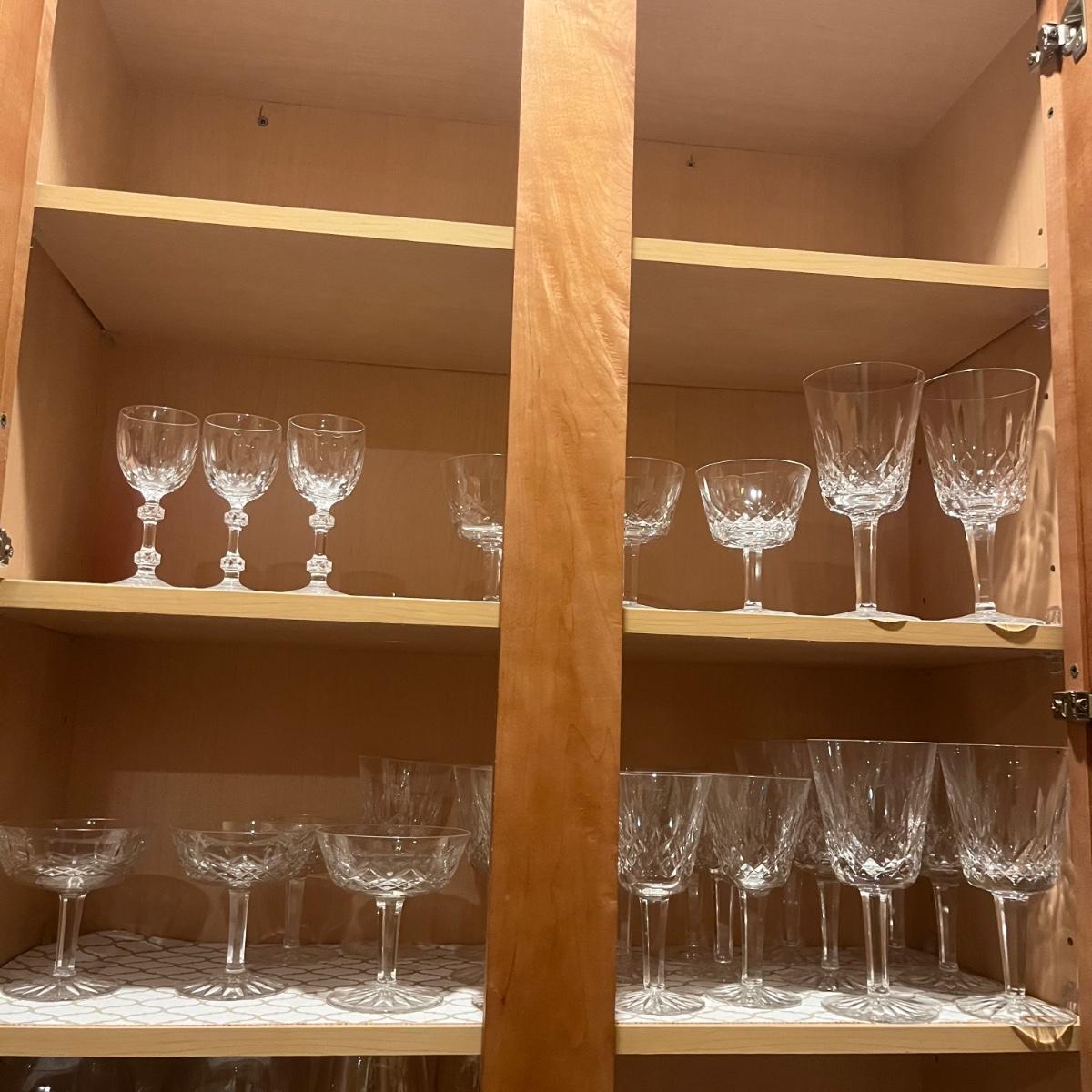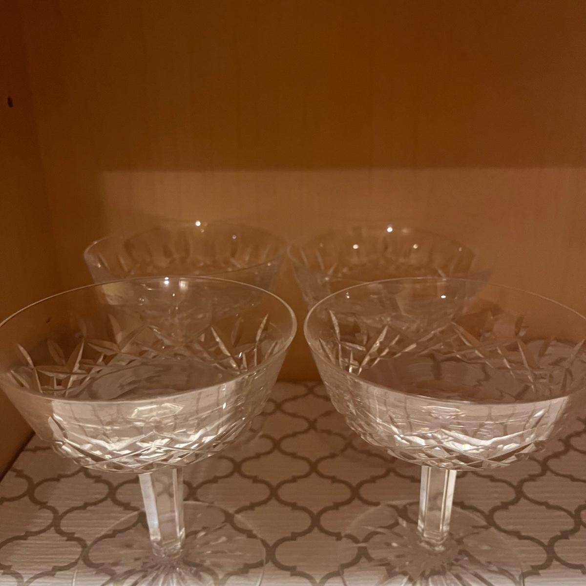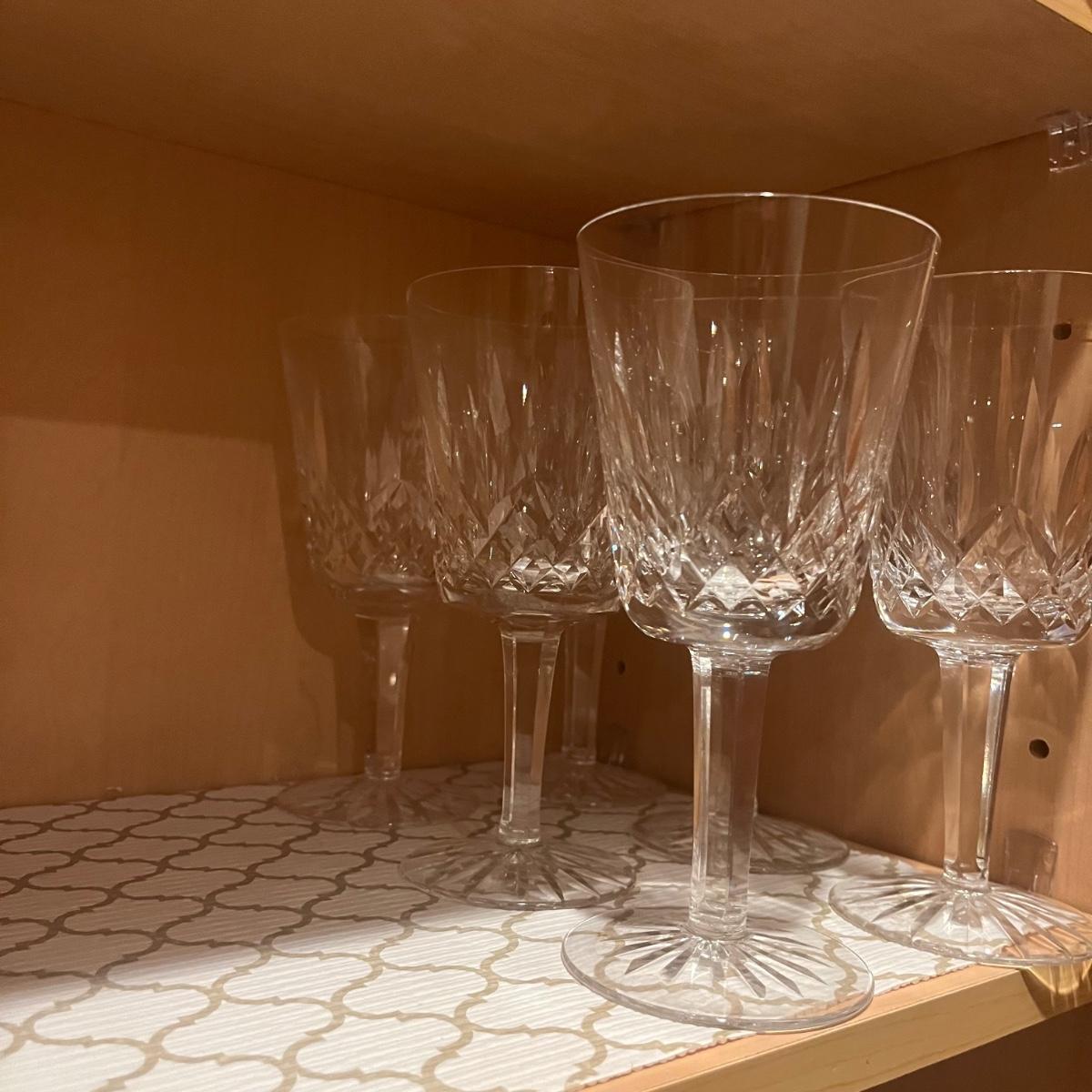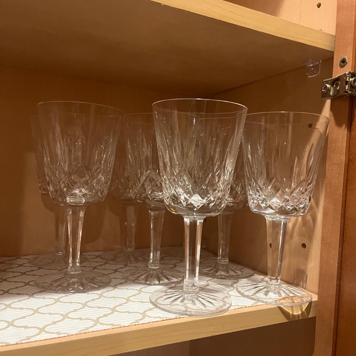 Lot contains a selection of Waterford Crystal glasses that includes ten small goblets, eight larger goblets, four champagne glasses and six smaller glasses. All glasses appear the same but not all are marked Waterford. Tallest glass measures 7”H.