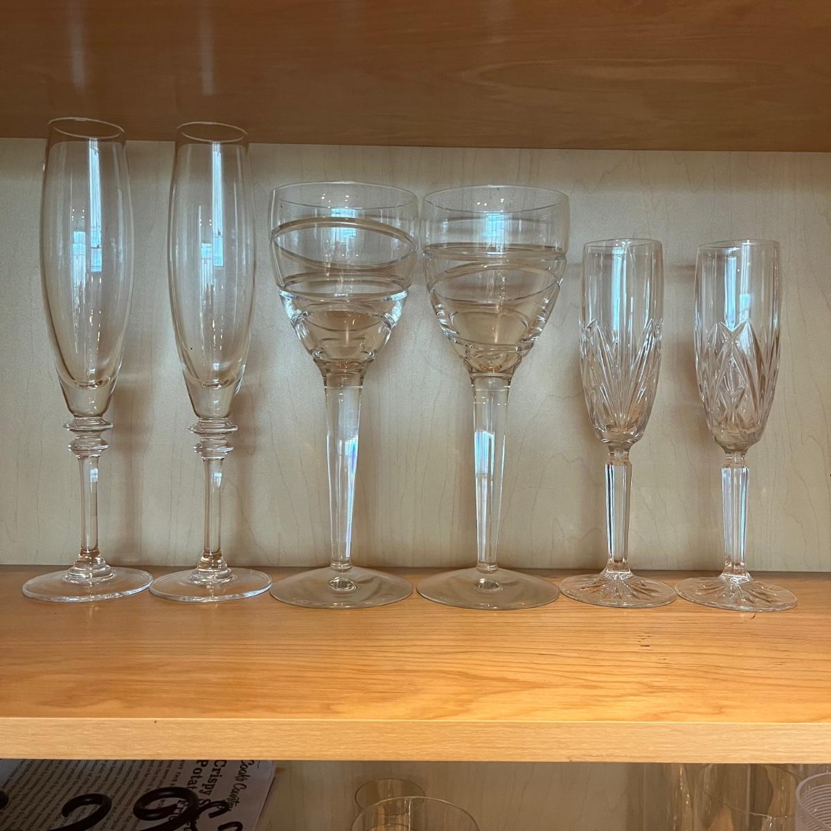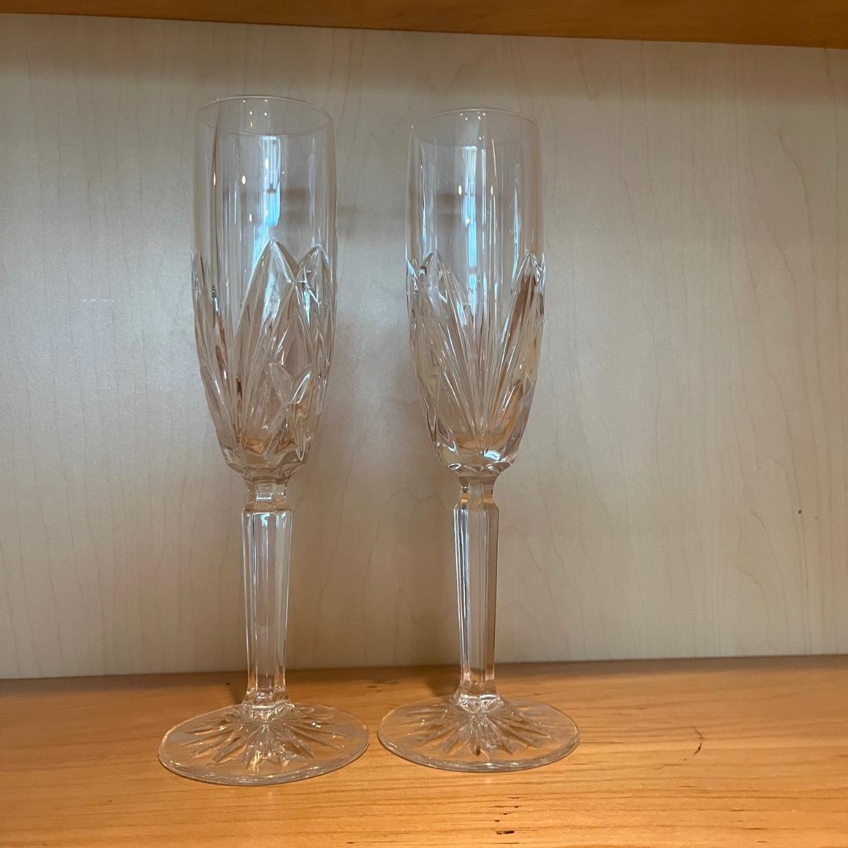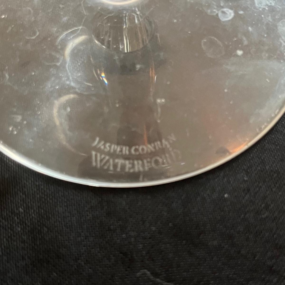 Lot includes two champagne flutes marked Marquis by Waterford, two wine glasses marked Jasper Conrad Waterford and two unmarked champagne flutes. All are in very good condition with no chips or cracks. Wine glasses measure 3.75”D x 10” tall.