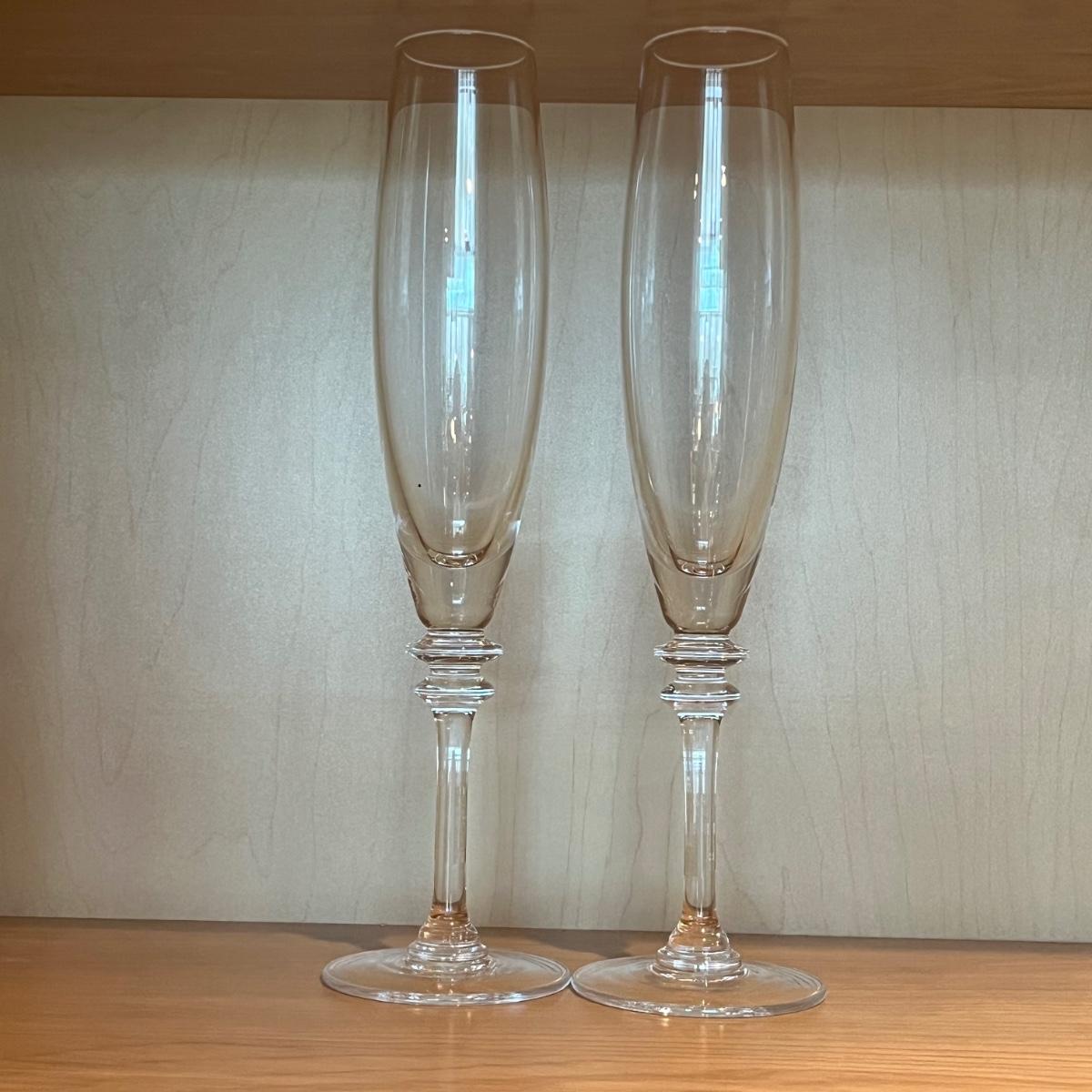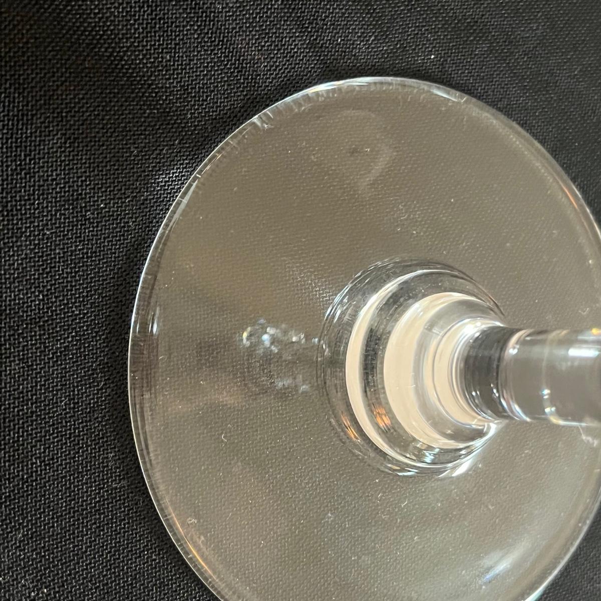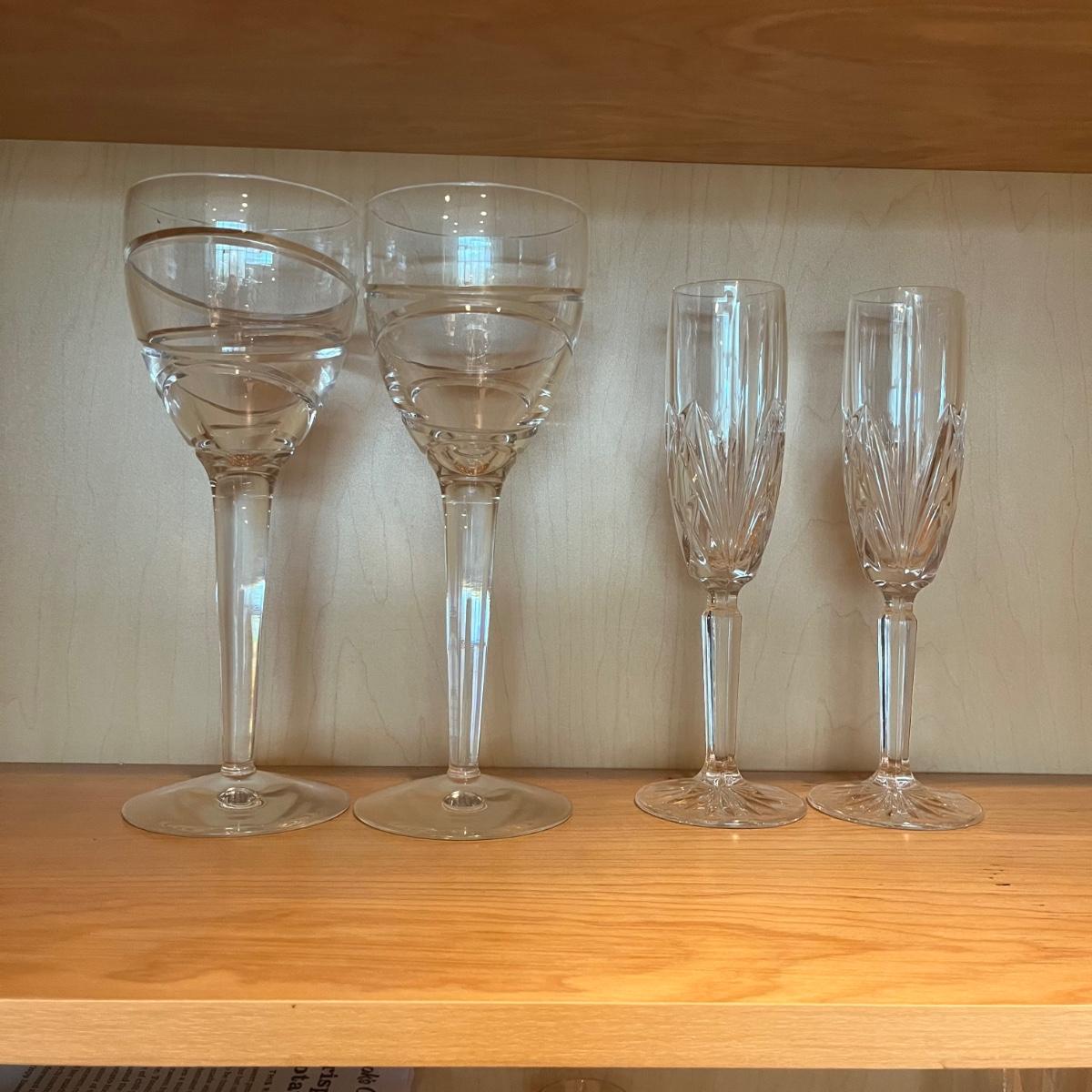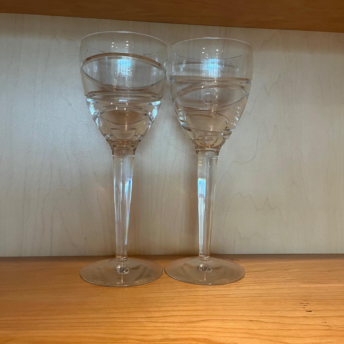 Lot includes two champagne flutes marked Marquis by Waterford, two wine glasses marked Jasper Conrad Waterford and two unmarked champagne flutes. All are in very good condition with no chips or cracks. Wine glasses measure 3.75”D x 10” tall.