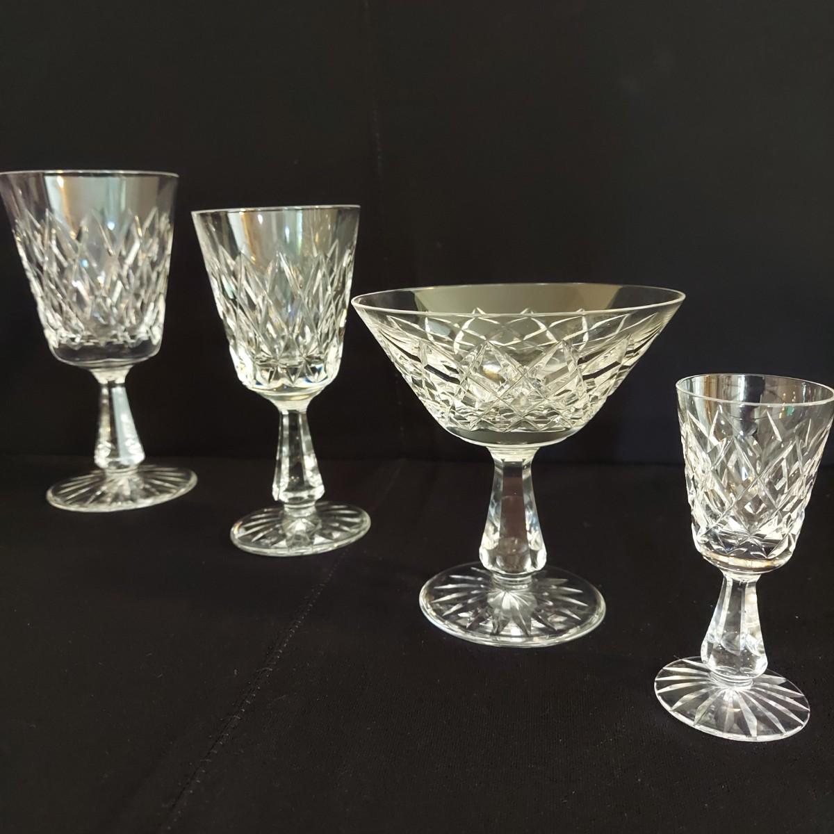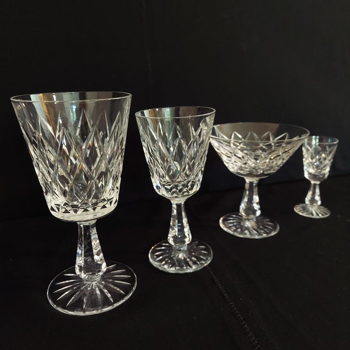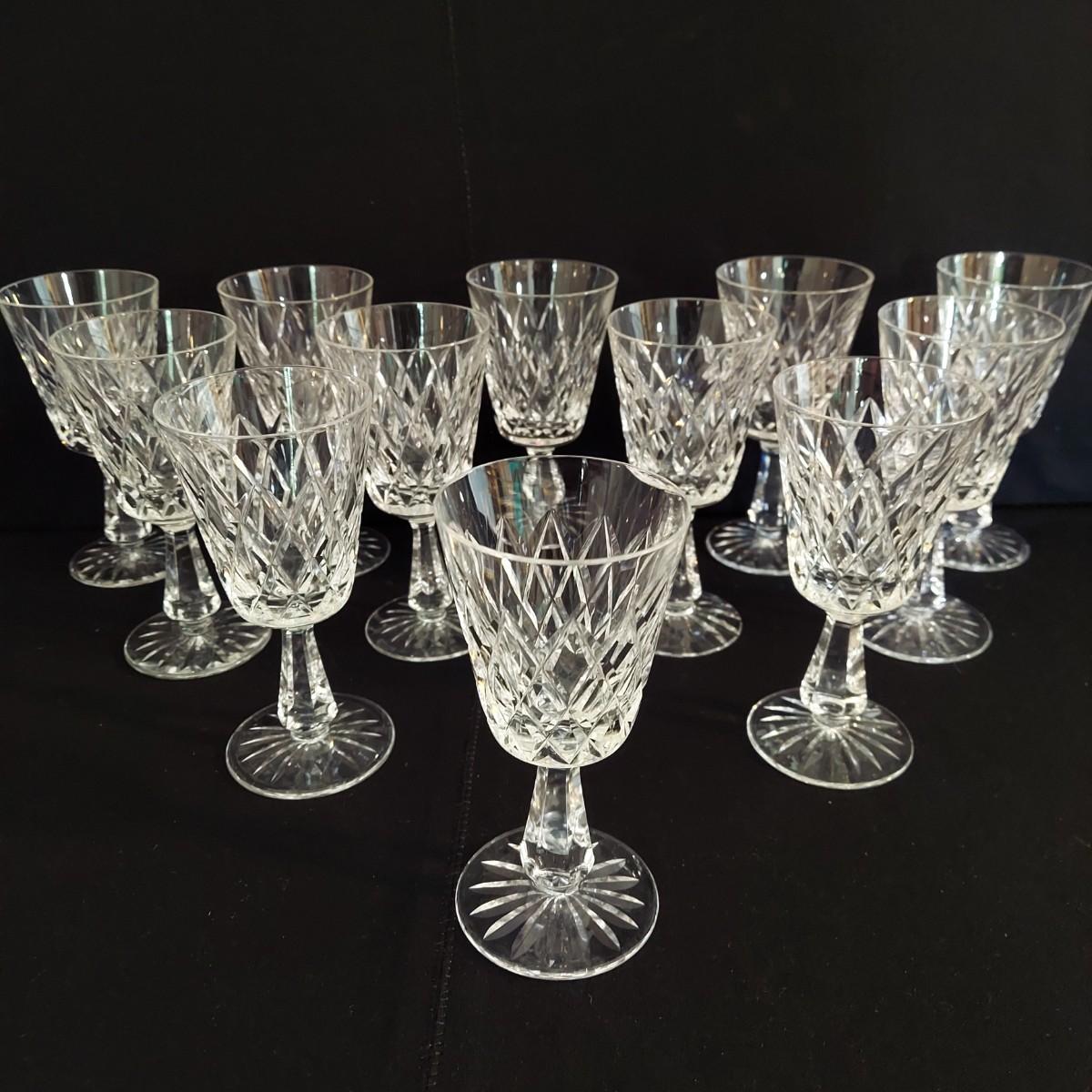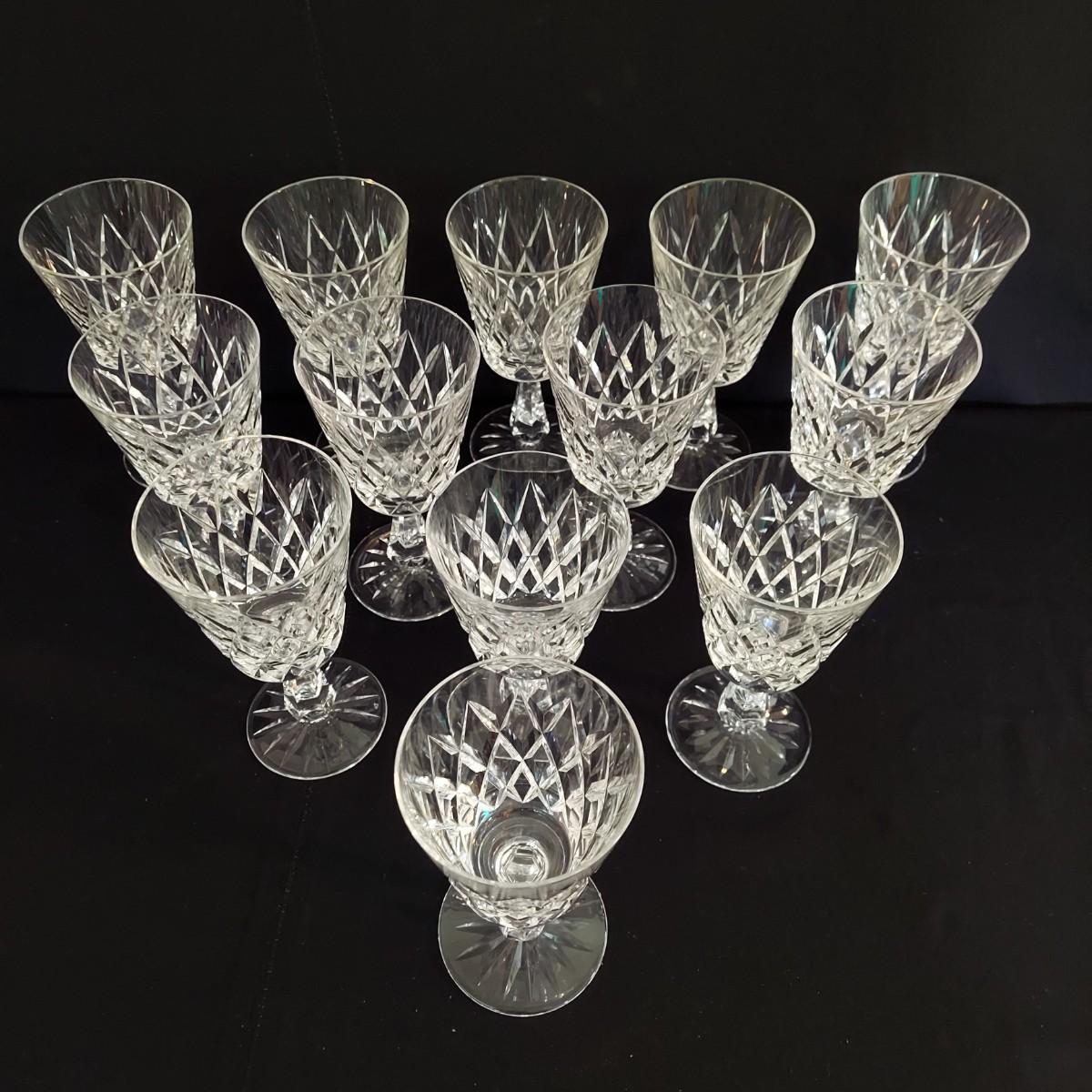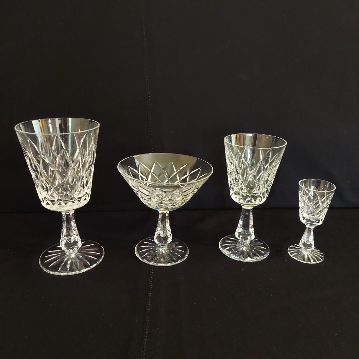 Waterford crystal stemware with Kinsale cut. Very heavy leaded glass. 44 glasses in this lot including 13 water goblets, 14 champagne glasses, 12 Claret glasses and 5 Cordial/port glasses. The port glasses are 4" tall. The water goblet is 7" tall. There are two champagne glasses with a chip in the rim. Please see photos. Shipping available. Shipping can be costly. We suggest contacting our preferred local shipping provider, Postage Express, with dimensions and getting an estimate before bidding: (828) 670-5501 or postageexpress@yahoo.com.