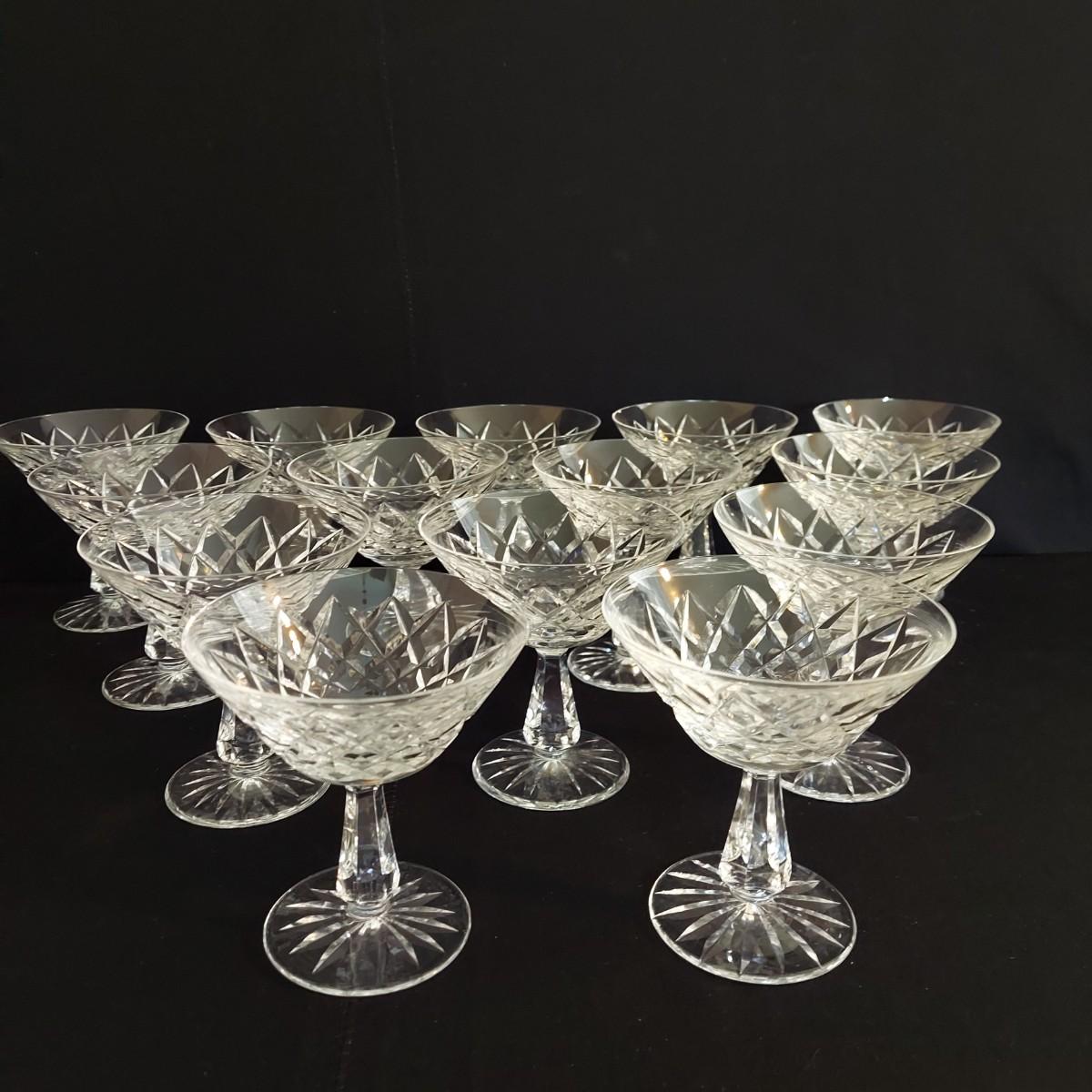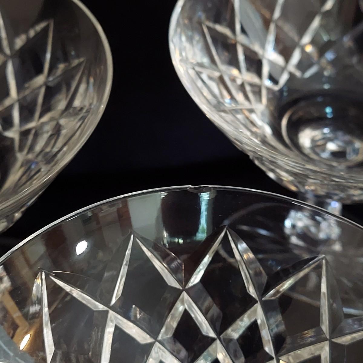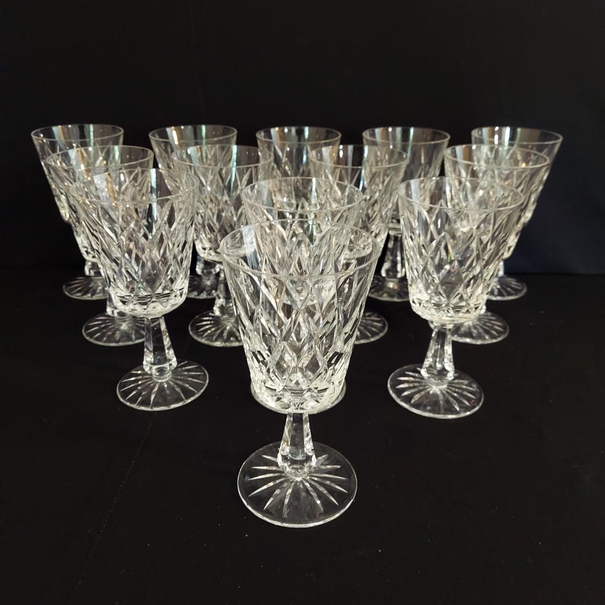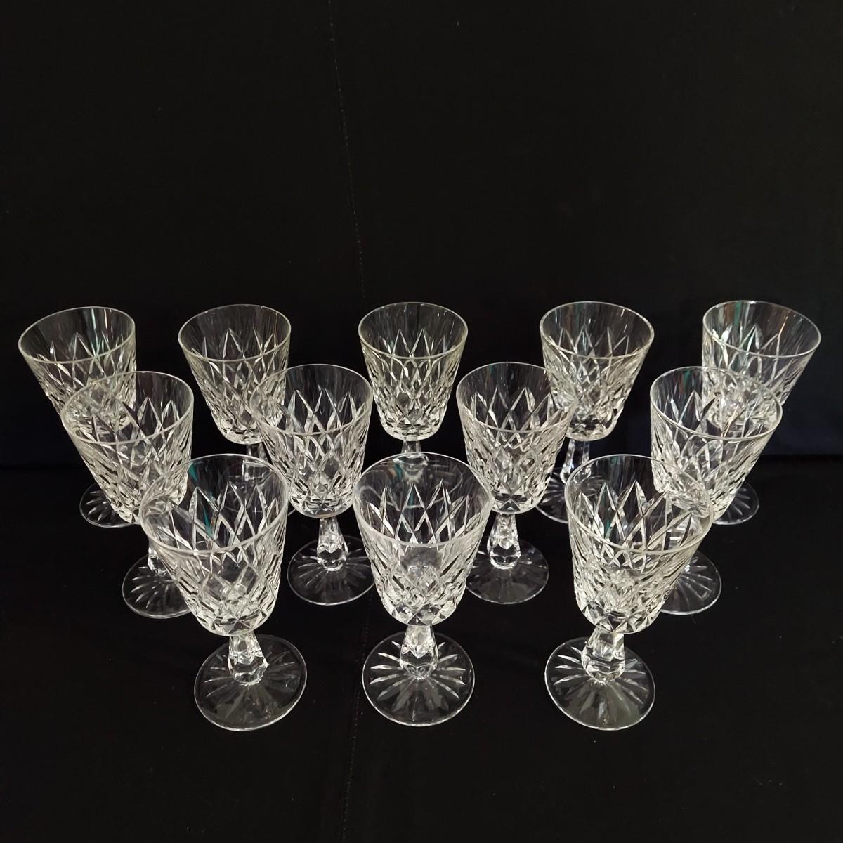 Waterford crystal stemware with Kinsale cut. Very heavy leaded glass. 44 glasses in this lot including 13 water goblets, 14 champagne glasses, 12 Claret glasses and 5 Cordial/port glasses. The port glasses are 4" tall. The water goblet is 7" tall. There are two champagne glasses with a chip in the rim. Please see photos. Shipping available. Shipping can be costly. We suggest contacting our preferred local shipping provider, Postage Express, with dimensions and getting an estimate before bidding: (828) 670-5501 or postageexpress@yahoo.com.