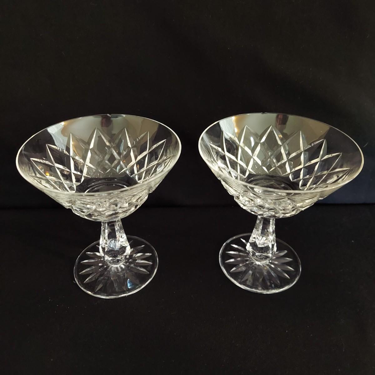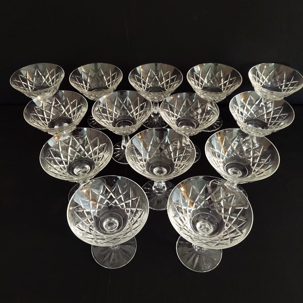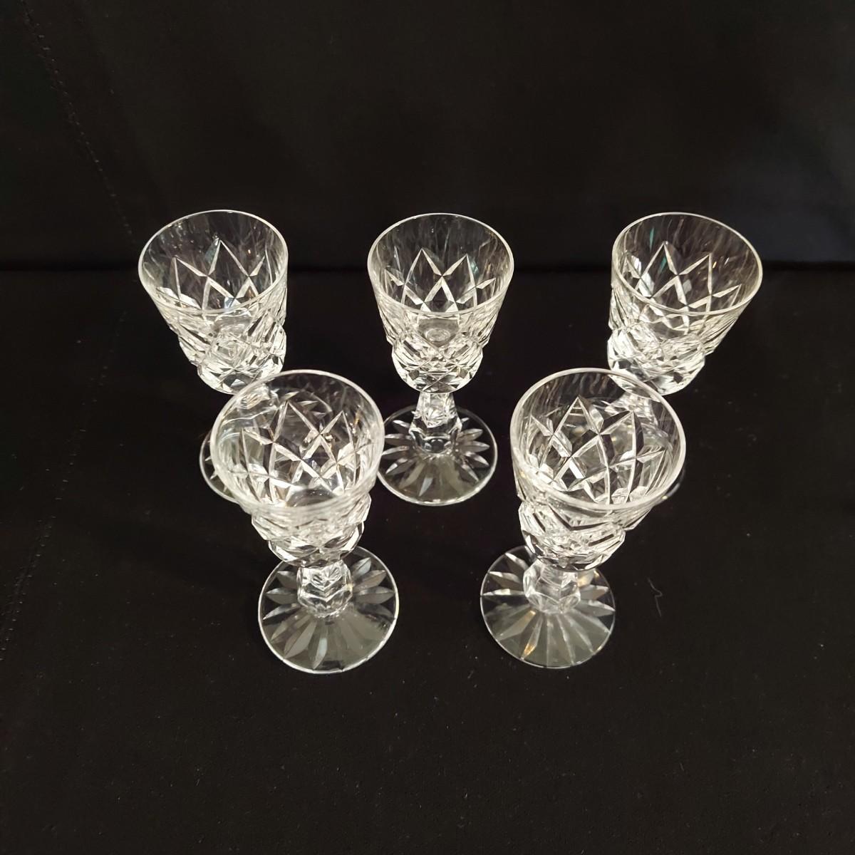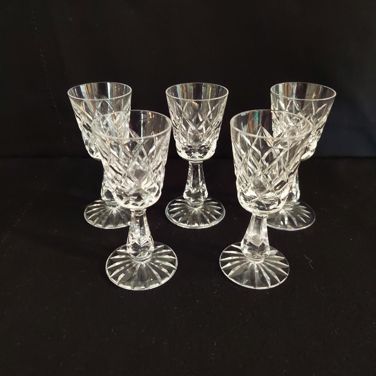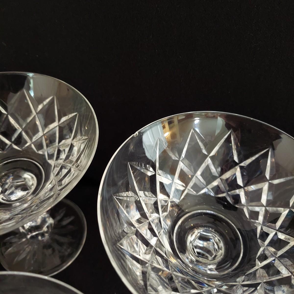 Waterford crystal stemware with Kinsale cut. Very heavy leaded glass. 44 glasses in this lot including 13 water goblets, 14 champagne glasses, 12 Claret glasses and 5 Cordial/port glasses. The port glasses are 4" tall. The water goblet is 7" tall. There are two champagne glasses with a chip in the rim. Please see photos. Shipping available. Shipping can be costly. We suggest contacting our preferred local shipping provider, Postage Express, with dimensions and getting an estimate before bidding: (828) 670-5501 or postageexpress@yahoo.com.
