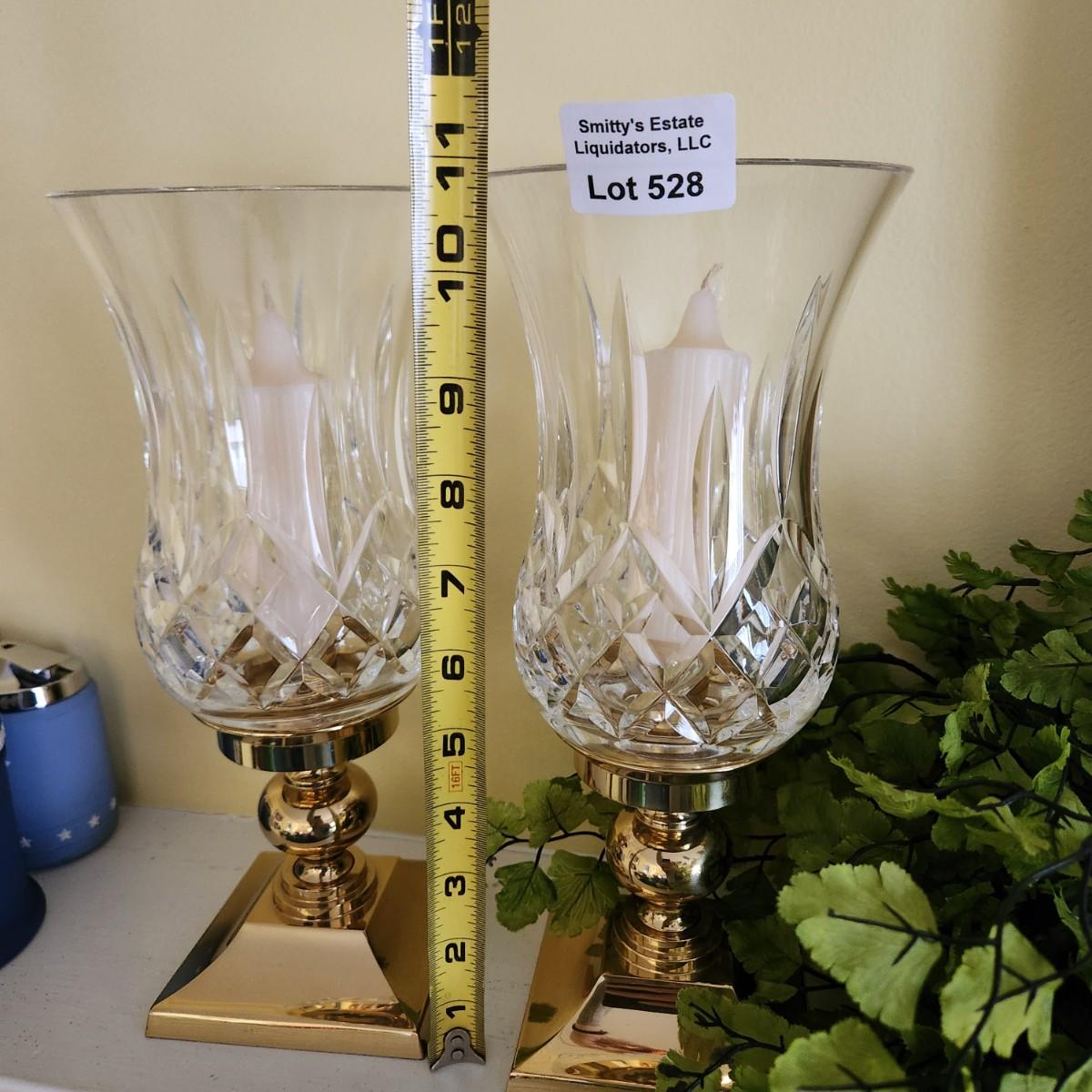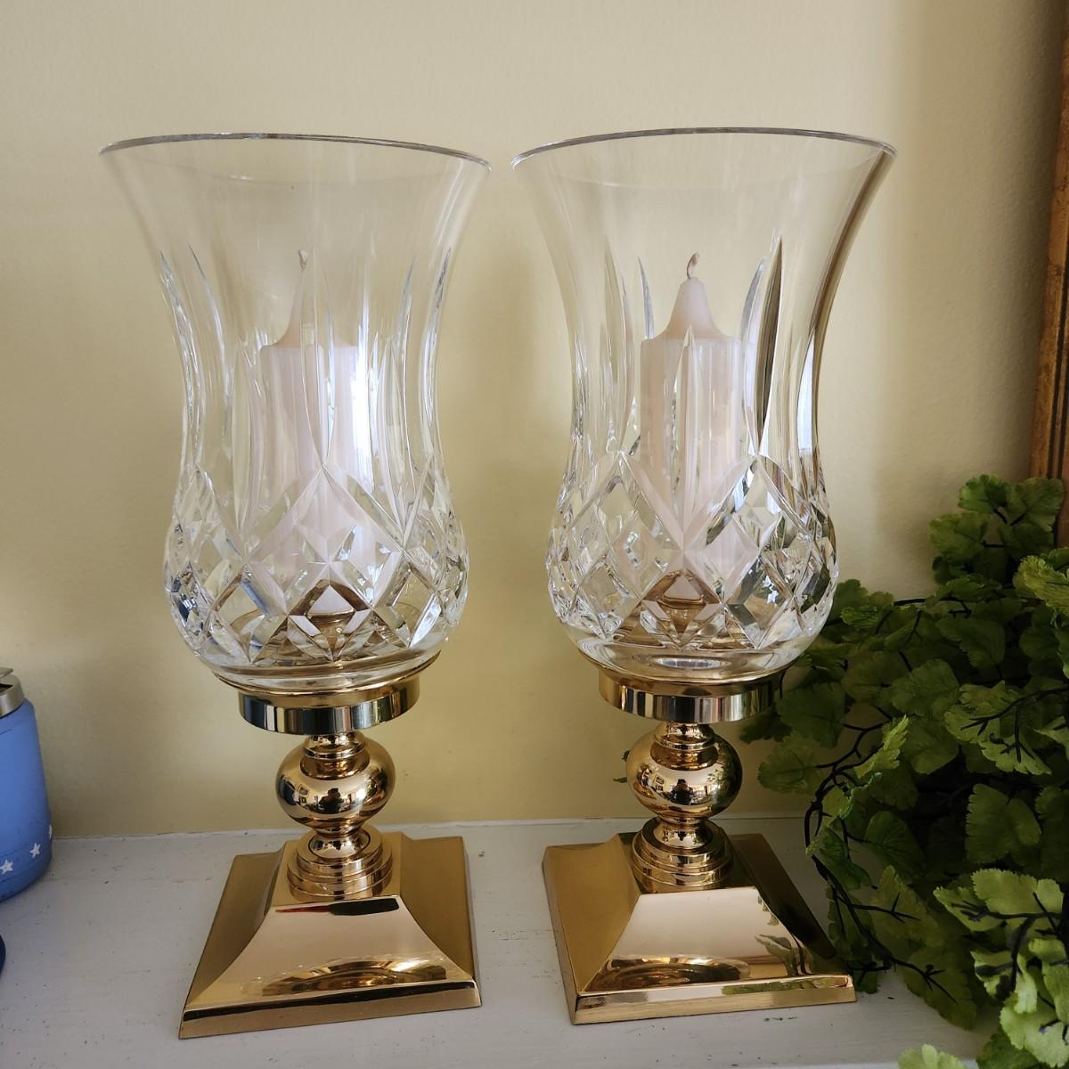 Waterford Crystal Lismore Candle Holder 11" Hurricane Candle w Brass Base Holders