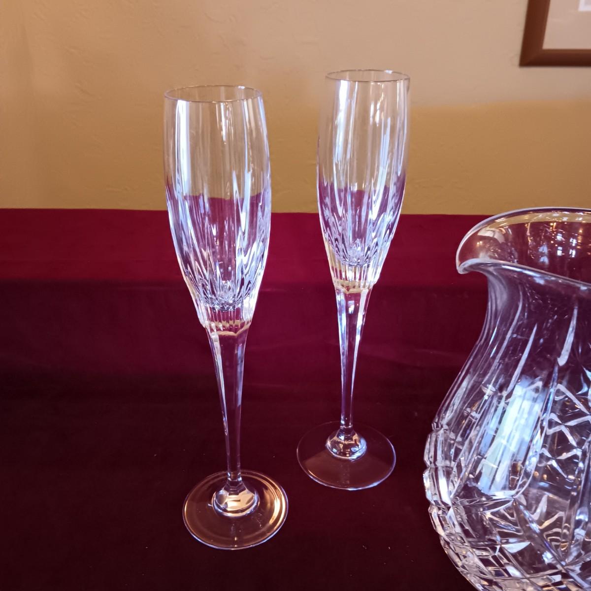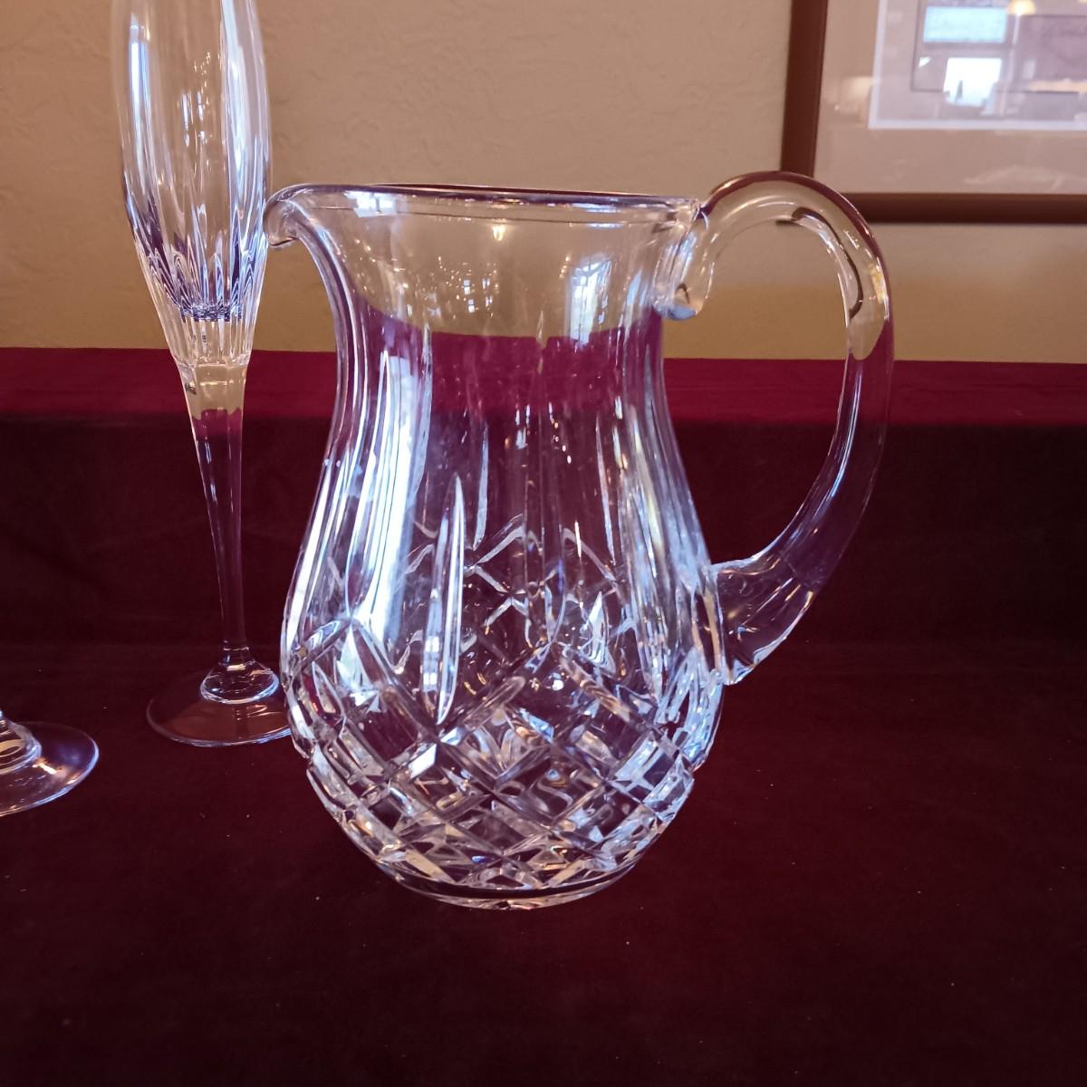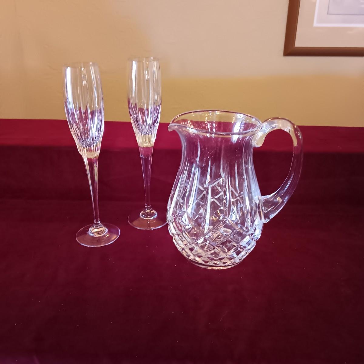 WATERFORD CRYSTAL PITCHER AND 2 CRYSTAL STEMMED GLASSES