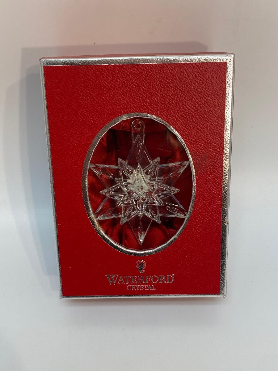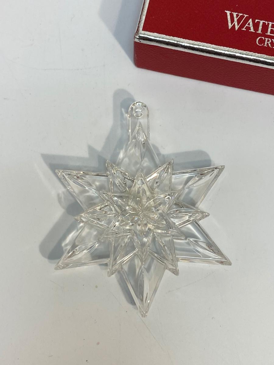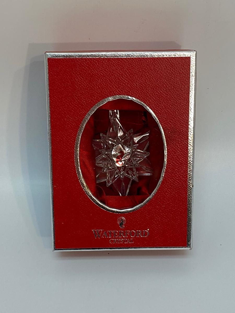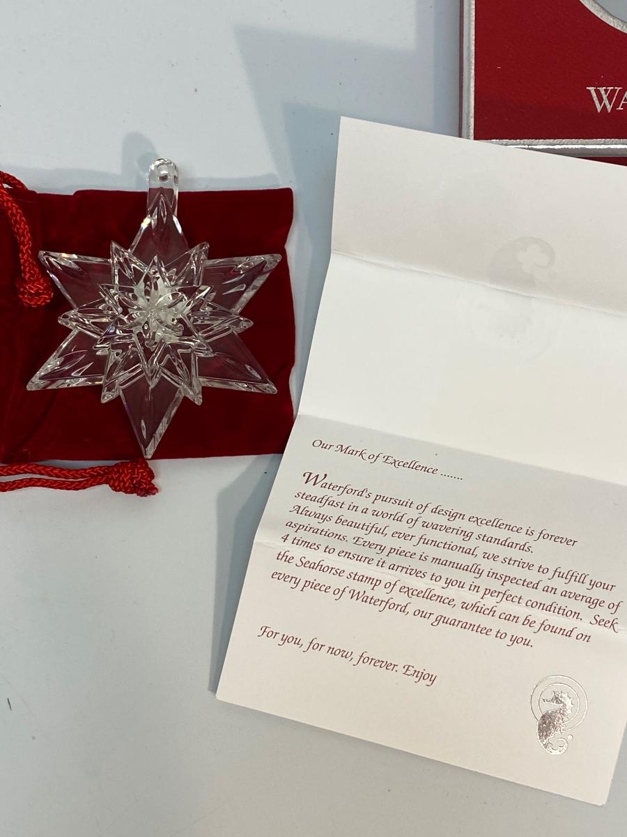Waterford Crystal Snow Star Holiday Tree Ornament Boxed. In excellent condition. Has hanger hook, velvet storage bag and COA. Waterford sticker and mark on ornament.