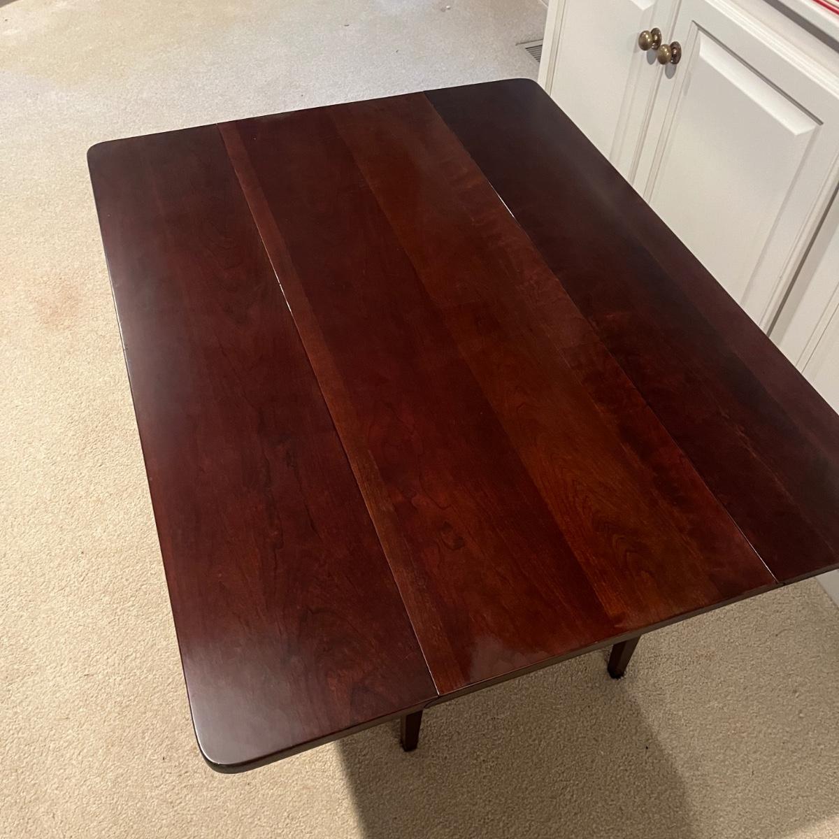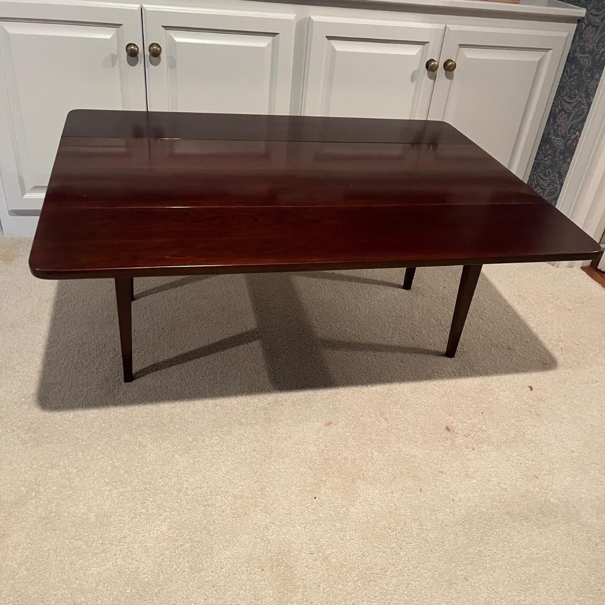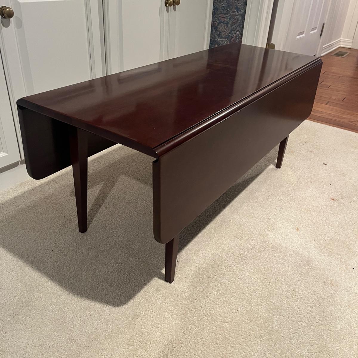 Lot includes a Waterford Furniture Maker wooden drop leaf coffee table. Table measures 32” x 42” x 17.5”H when open and 16” x 42” x 17.5”H with leaves dropped.