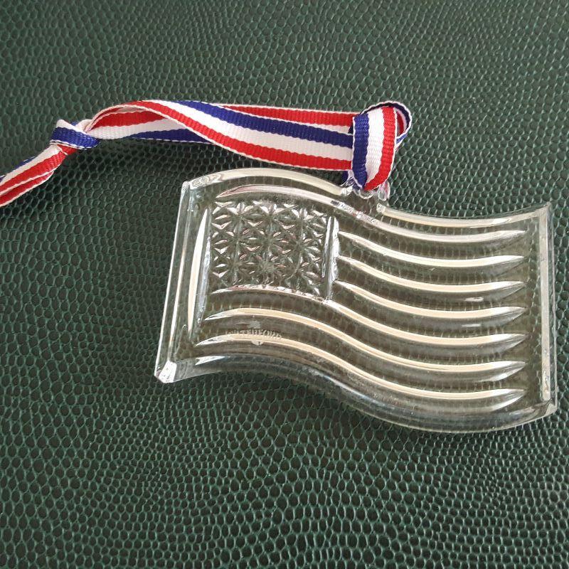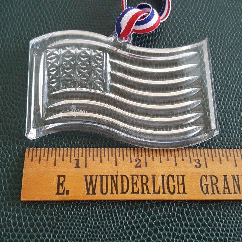 This auction lot is for a Waterford Glass Flag Ornament. This ornament/paperweight is a real treasure and symbol of USA pride. This flag measures about 3-inches X 2-inches. Clearly marked Waterford. Nice collectible and decorative item.
