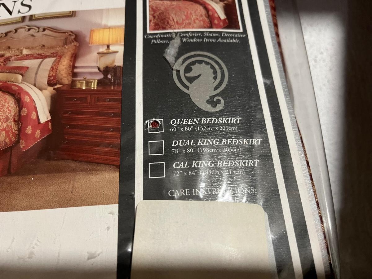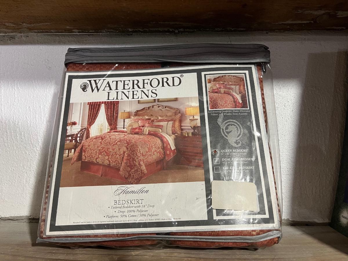 Brand new. The Waterford Queen Bed Skirt in the Hamilton Style is a luxurious addition to any bedroom. This cinnabar red and gold checkered bed skirt is made of durable polyester material and adds a touch of elegance to your room. Perfect for a queen-sized bed, this bed skirt is designed to complement a variety of bedroom decor styles. Made in China by Waterford, this bed skirt is a stylish and high-quality option for your home.