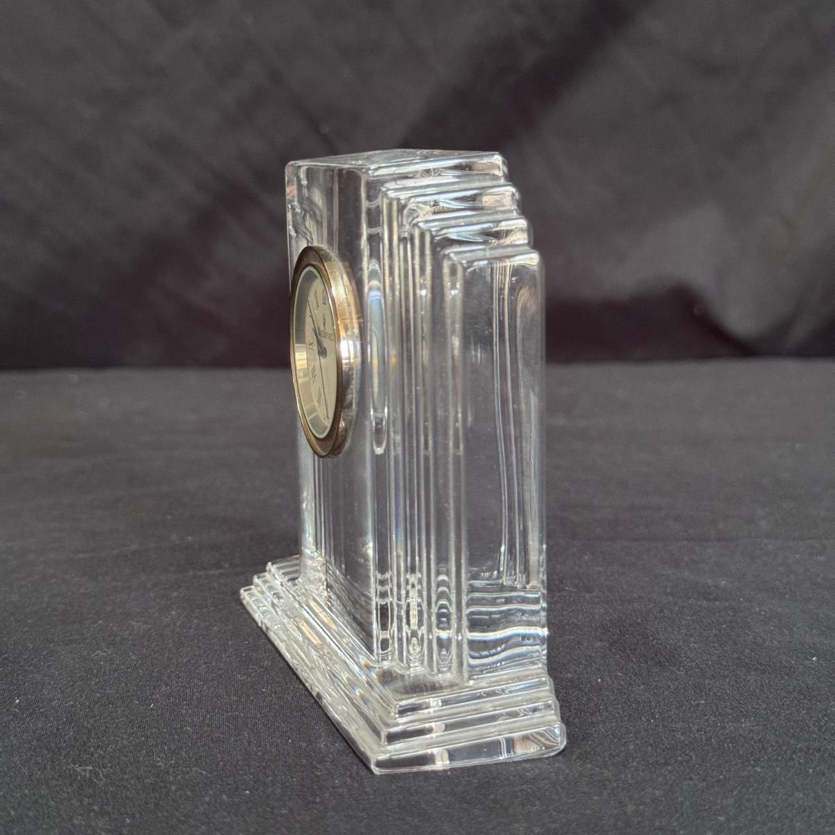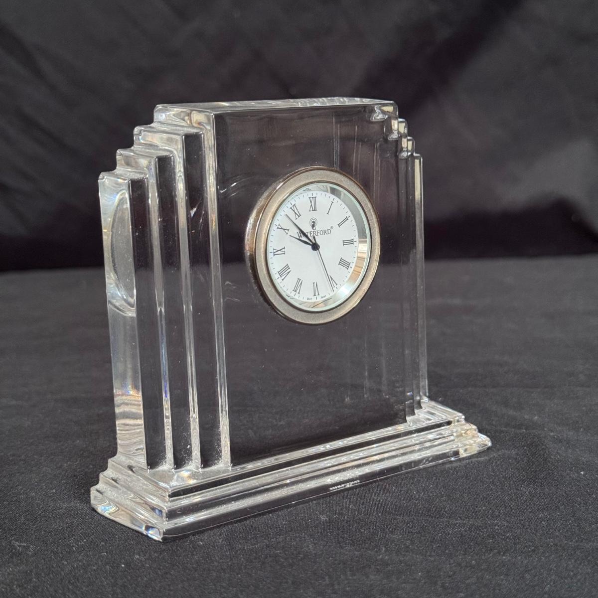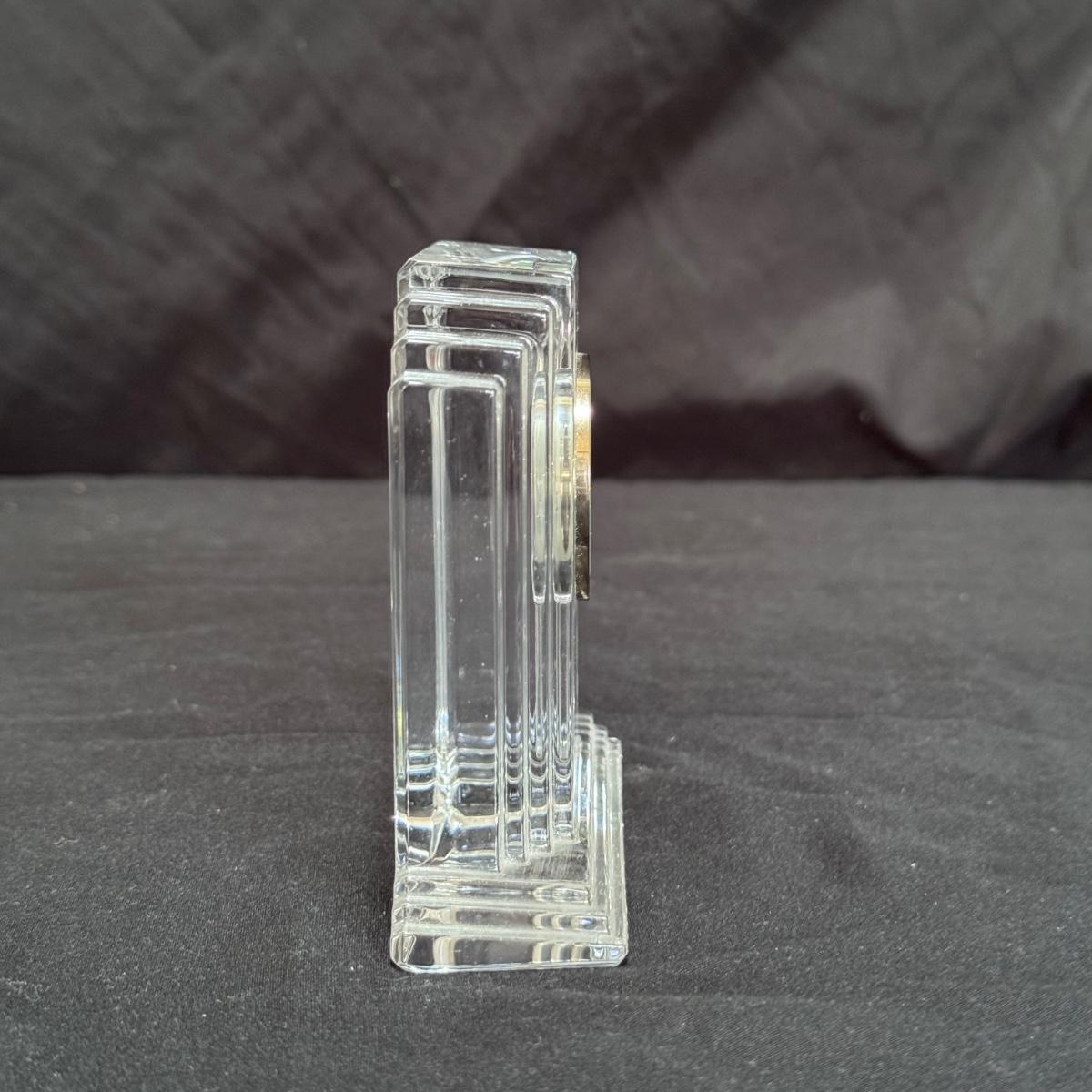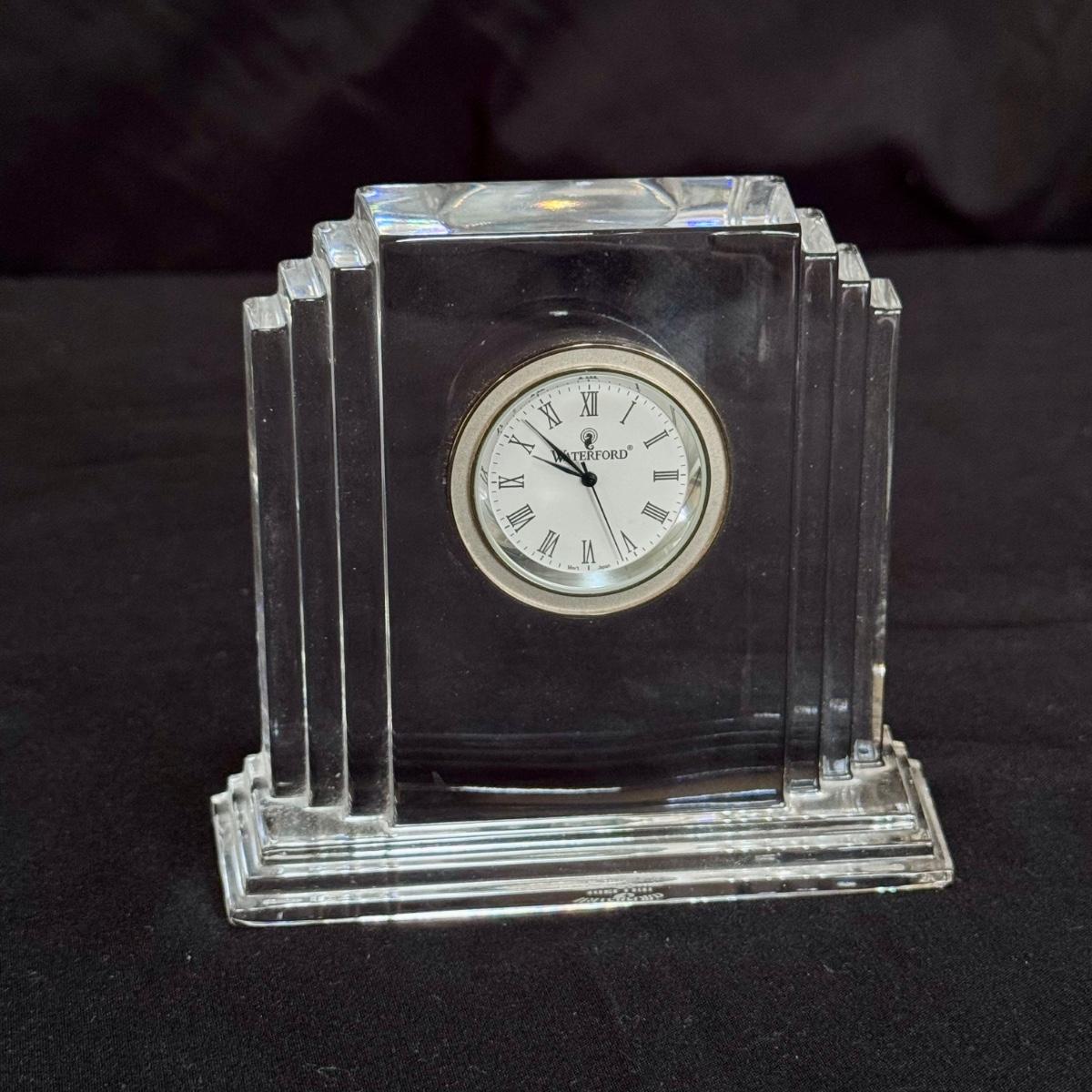 This lot includes one Waterford metropolitan crystal desktop clock. You’ll find the Waterford mark on the bottom of the clock - see last few pictures included. Clock was not tested and likely needs new batteries. The clock measures 4” x 1.5” x 4”H. Shipping available.