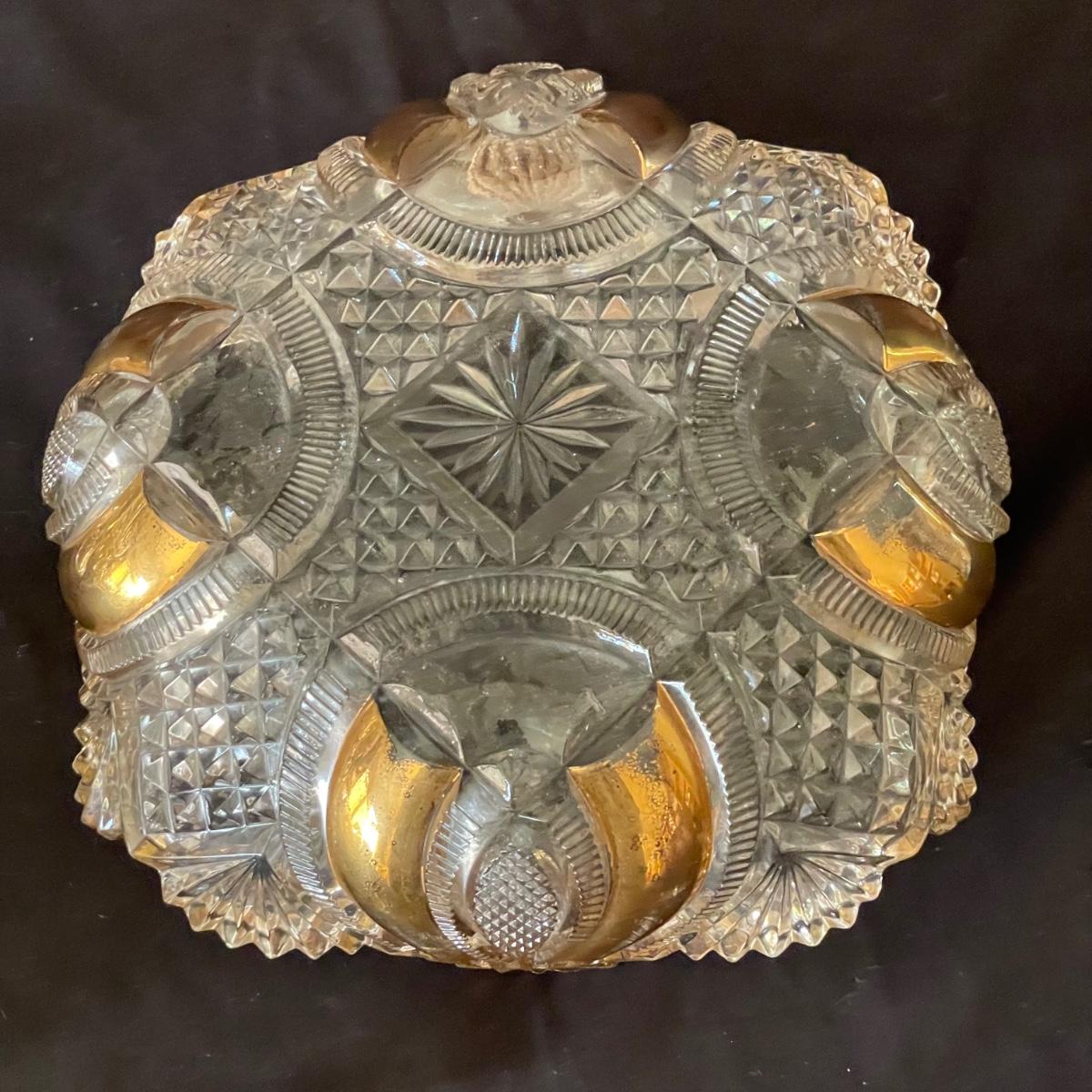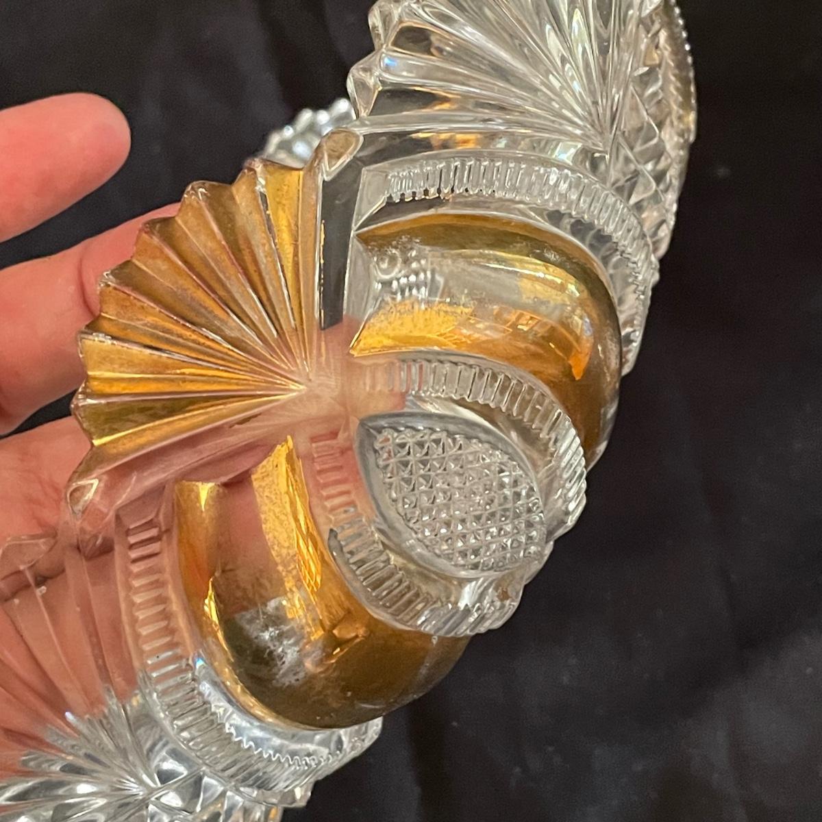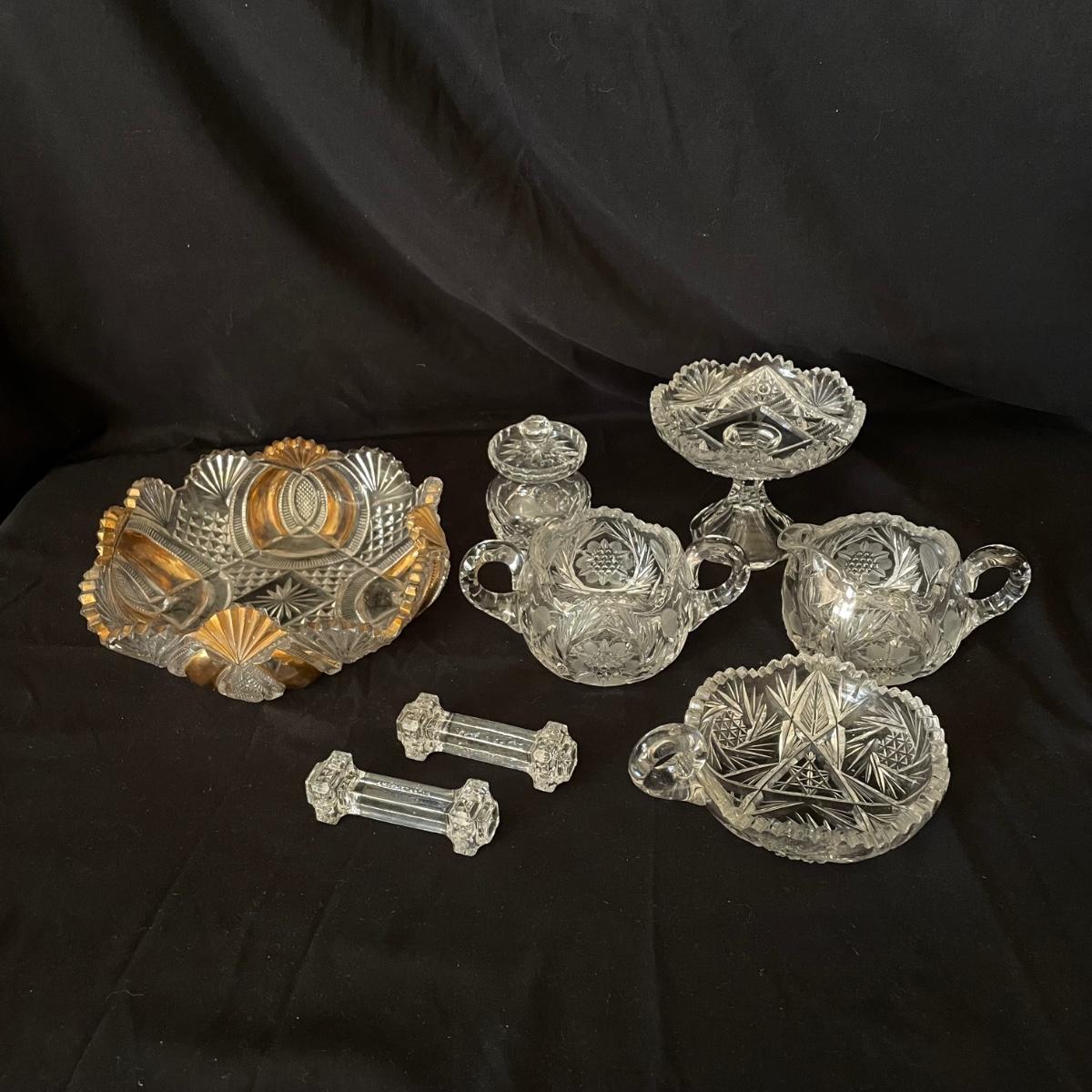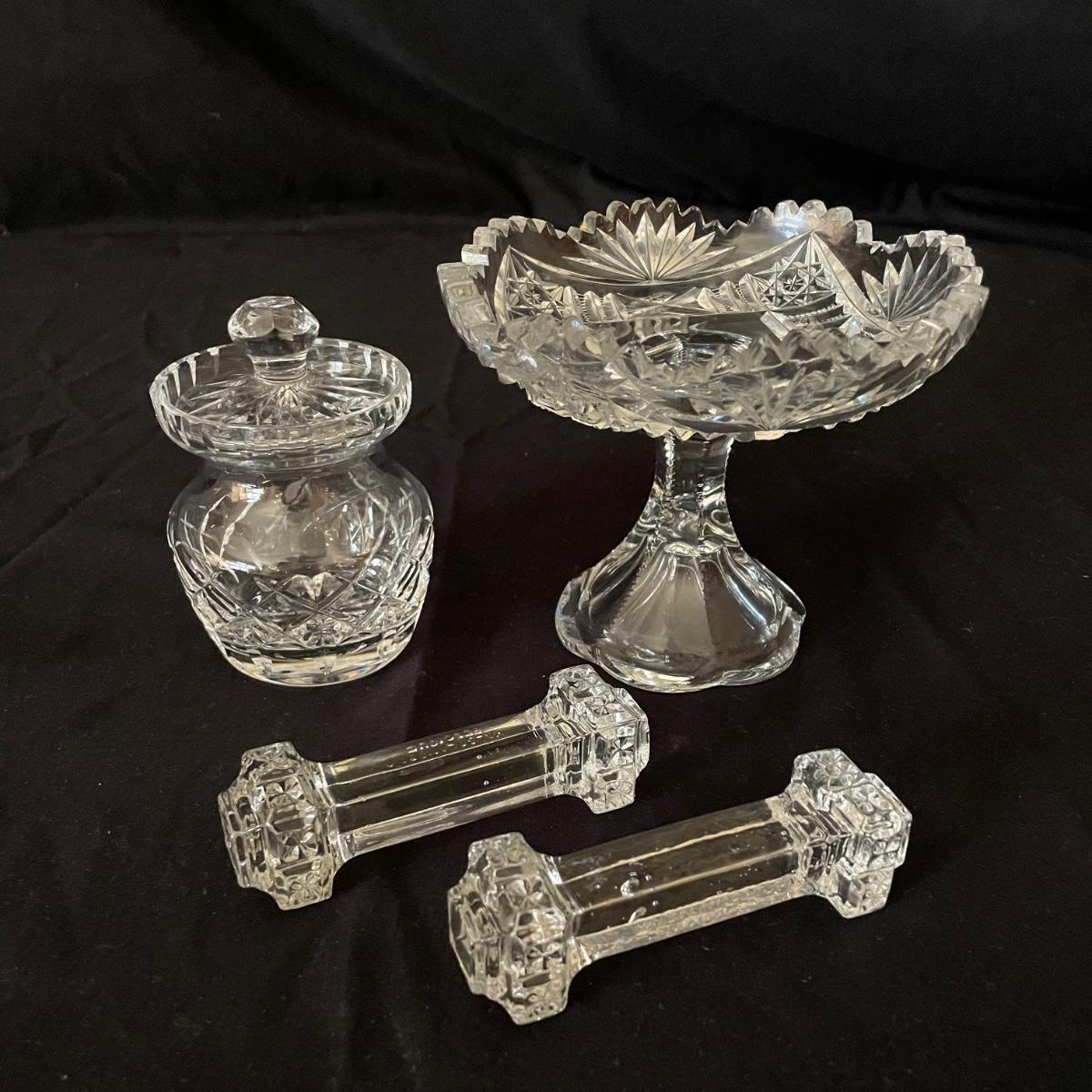 Eight pieces of crystal featuring a lidded honey/jam jar stamped Waterford and two square knife rests by Val St. Lambert. Lot also showcases a unique square and scalloped bowl with golden painted accents. Some of the gold is worn, see photos. Lastly, lot holds a lid-less sugar and creamer set, a low, shallow bowl with one rounded handle and a taller footed bowl. The scalloped/gold accented bowl measures 8.5”SQ x 3”H. Shipping available.