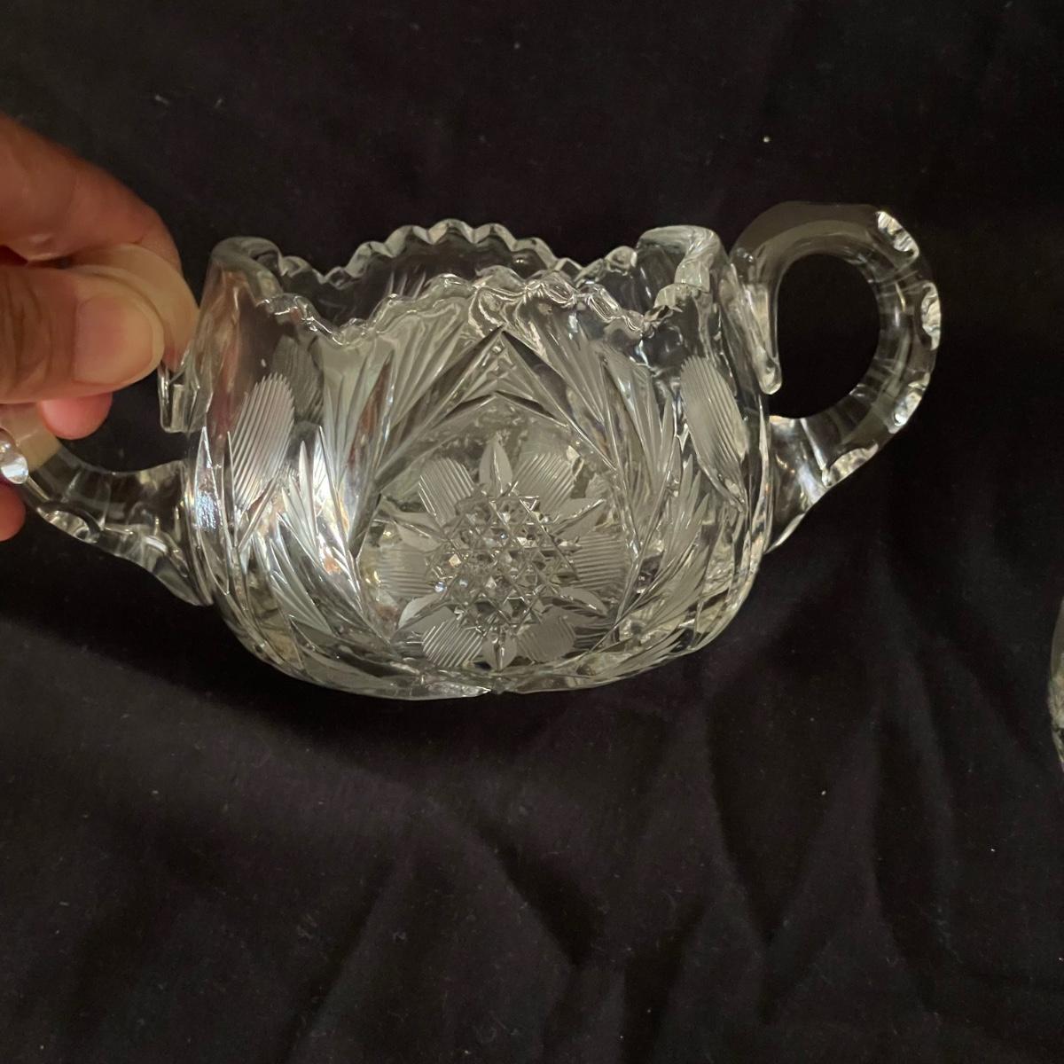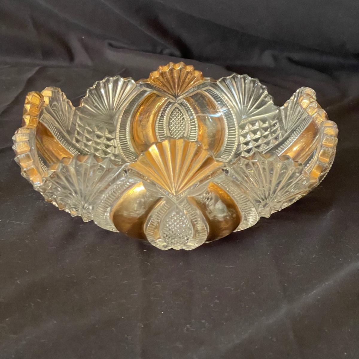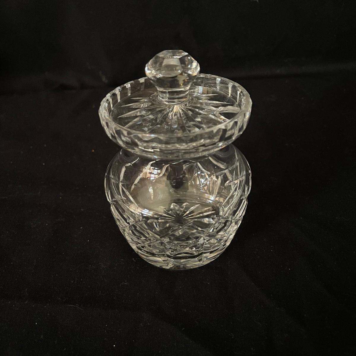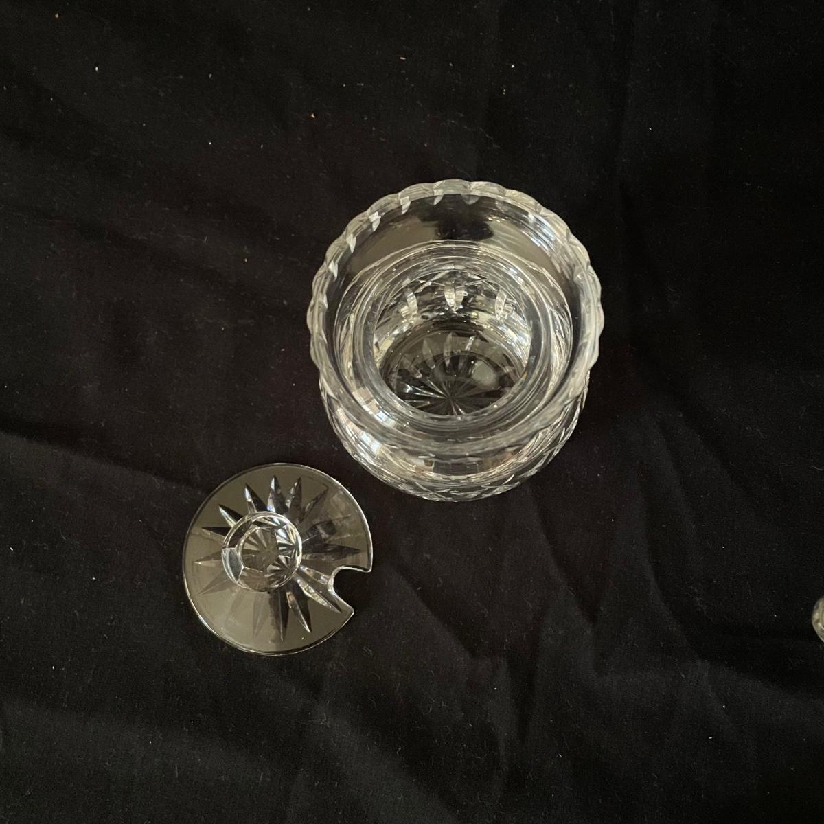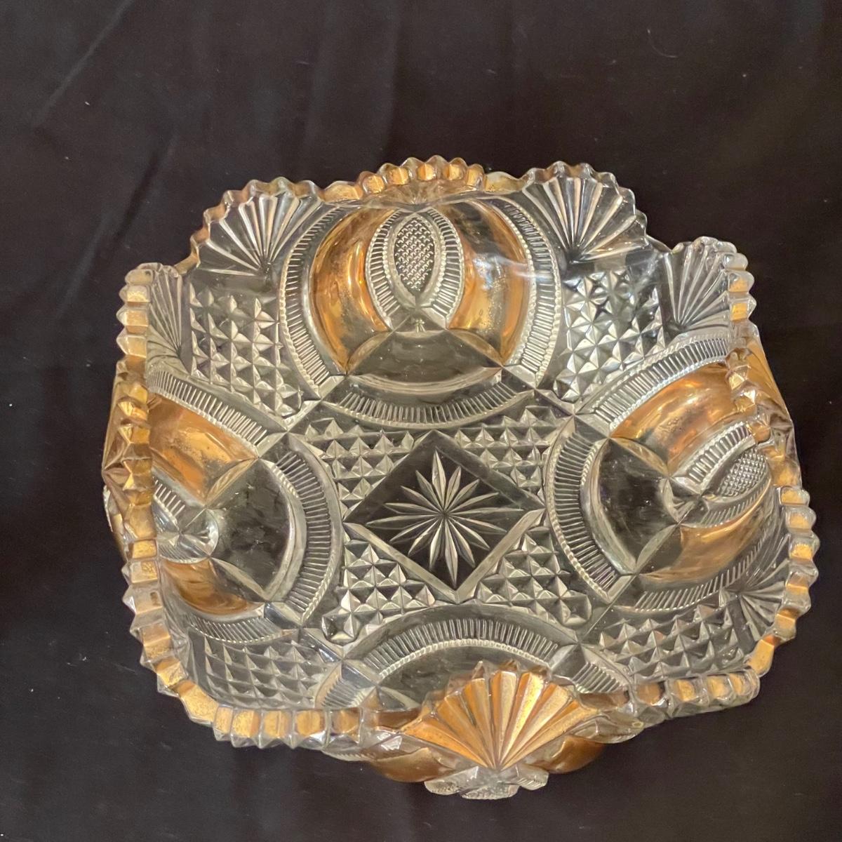 Eight pieces of crystal featuring a lidded honey/jam jar stamped Waterford and two square knife rests by Val St. Lambert. Lot also showcases a unique square and scalloped bowl with golden painted accents. Some of the gold is worn, see photos. Lastly, lot holds a lid-less sugar and creamer set, a low, shallow bowl with one rounded handle and a taller footed bowl. The scalloped/gold accented bowl measures 8.5”SQ x 3”H. Shipping available.