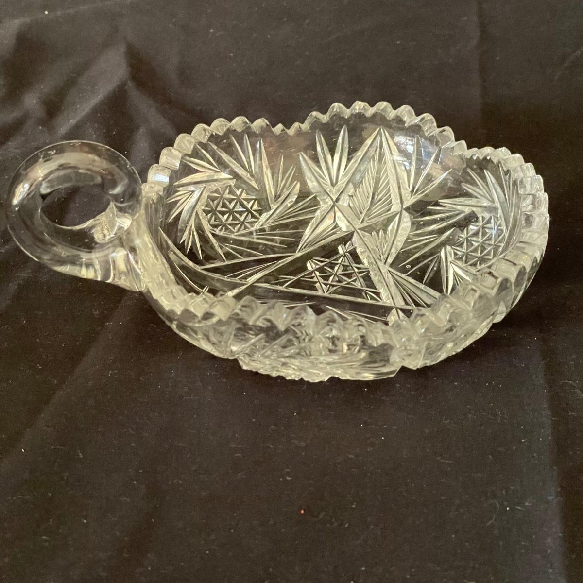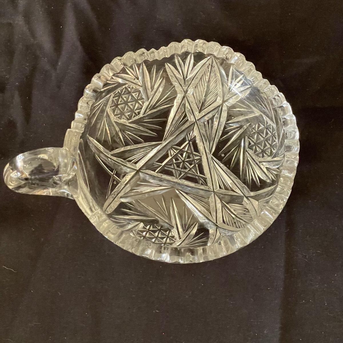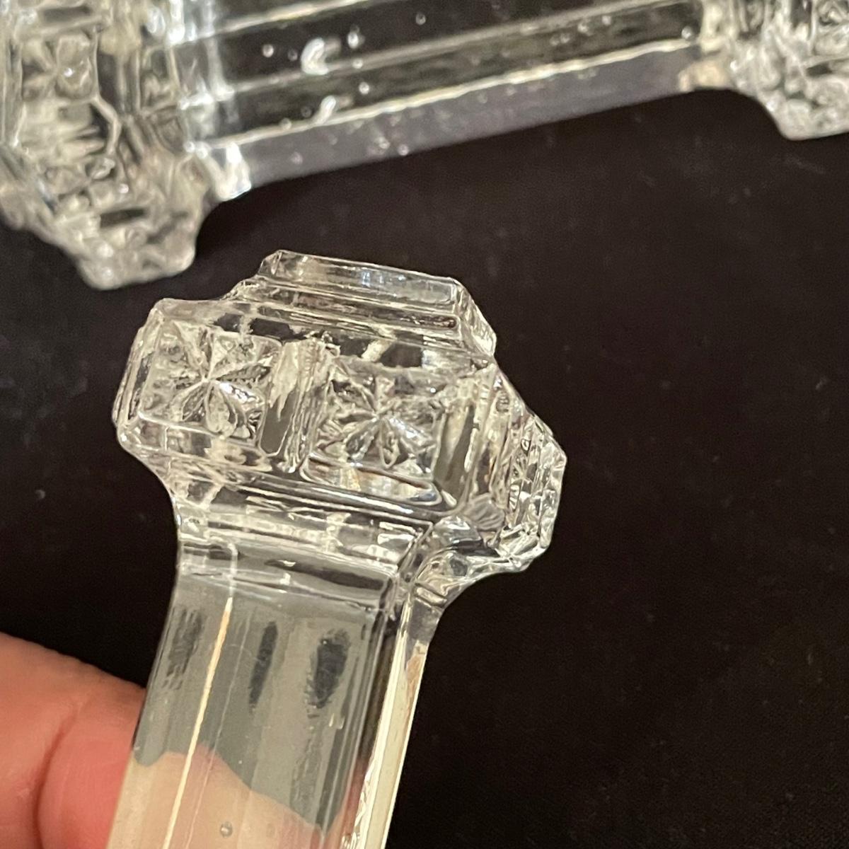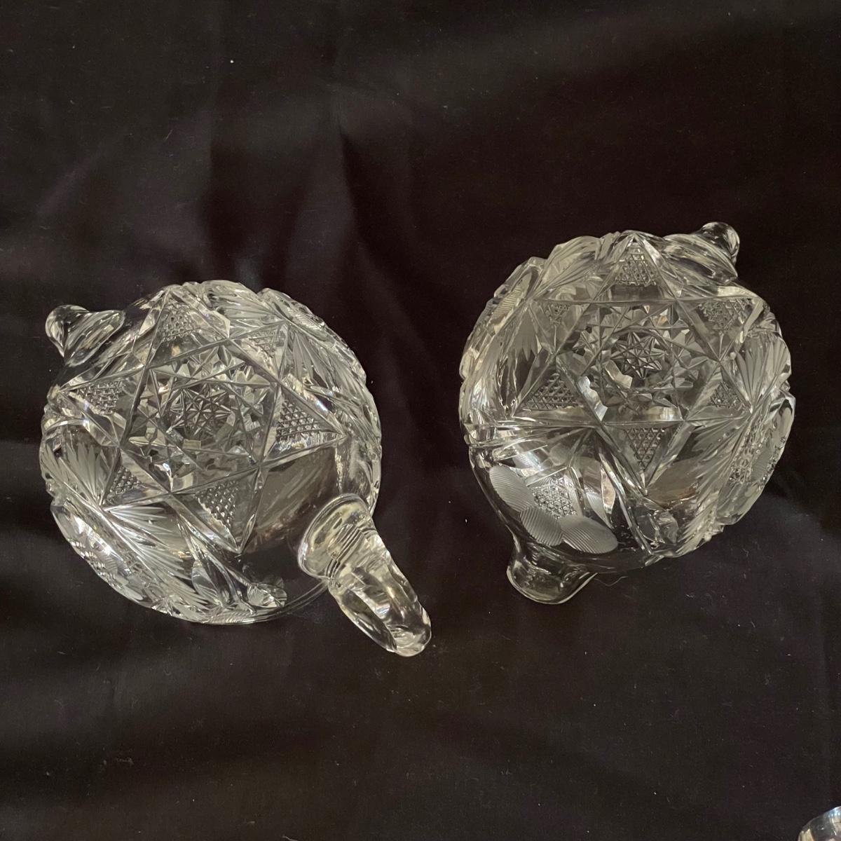 Eight pieces of crystal featuring a lidded honey/jam jar stamped Waterford and two square knife rests by Val St. Lambert. Lot also showcases a unique square and scalloped bowl with golden painted accents. Some of the gold is worn, see photos. Lastly, lot holds a lid-less sugar and creamer set, a low, shallow bowl with one rounded handle and a taller footed bowl. The scalloped/gold accented bowl measures 8.5”SQ x 3”H. Shipping available.