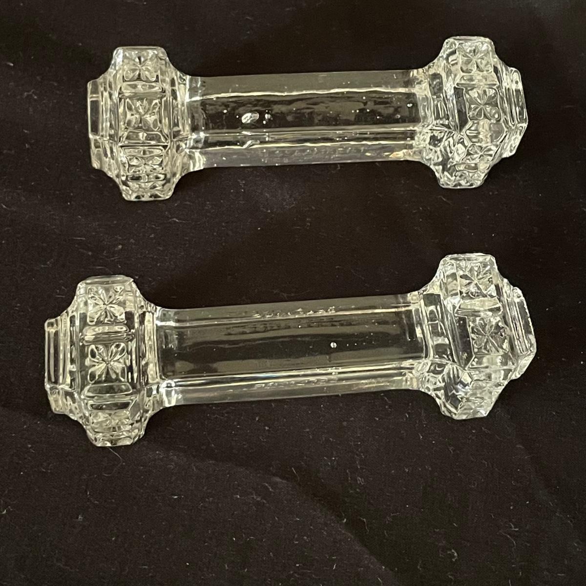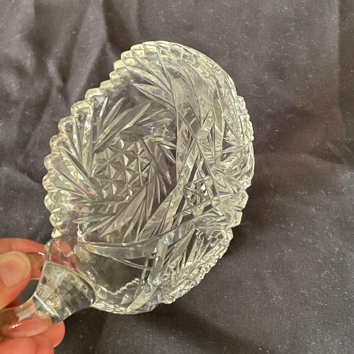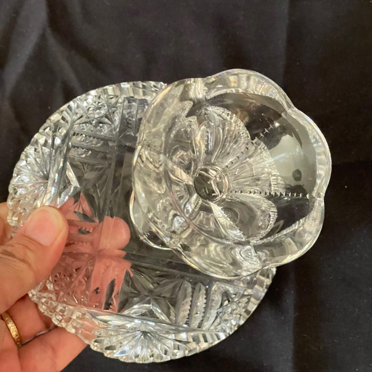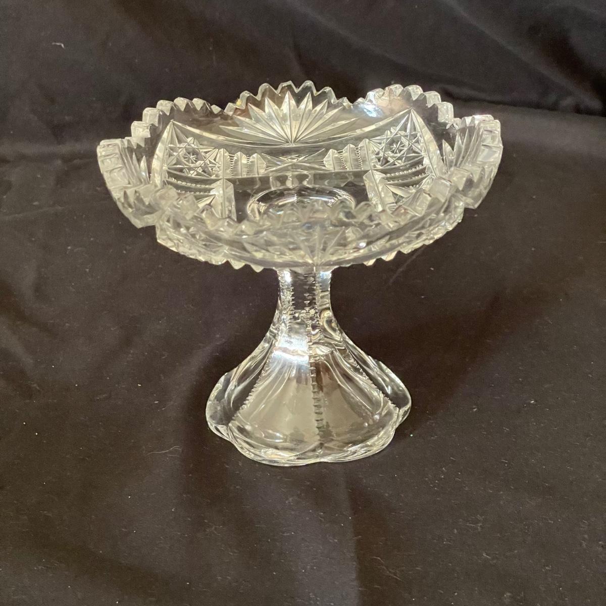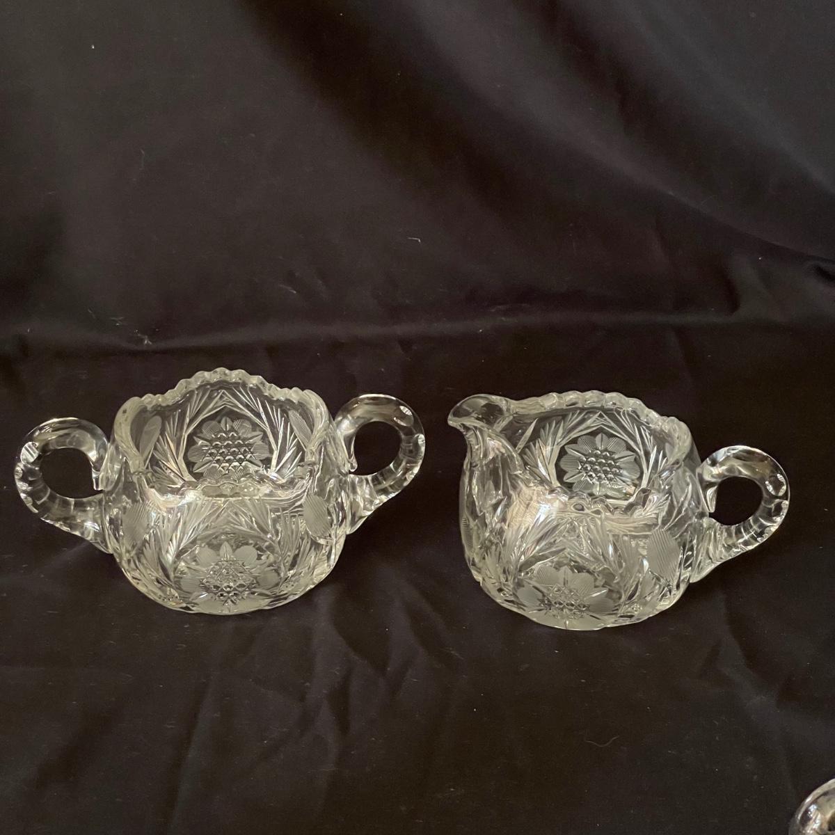 Eight pieces of crystal featuring a lidded honey/jam jar stamped Waterford and two square knife rests by Val St. Lambert. Lot also showcases a unique square and scalloped bowl with golden painted accents. Some of the gold is worn, see photos. Lastly, lot holds a lid-less sugar and creamer set, a low, shallow bowl with one rounded handle and a taller footed bowl. The scalloped/gold accented bowl measures 8.5”SQ x 3”H. Shipping available.