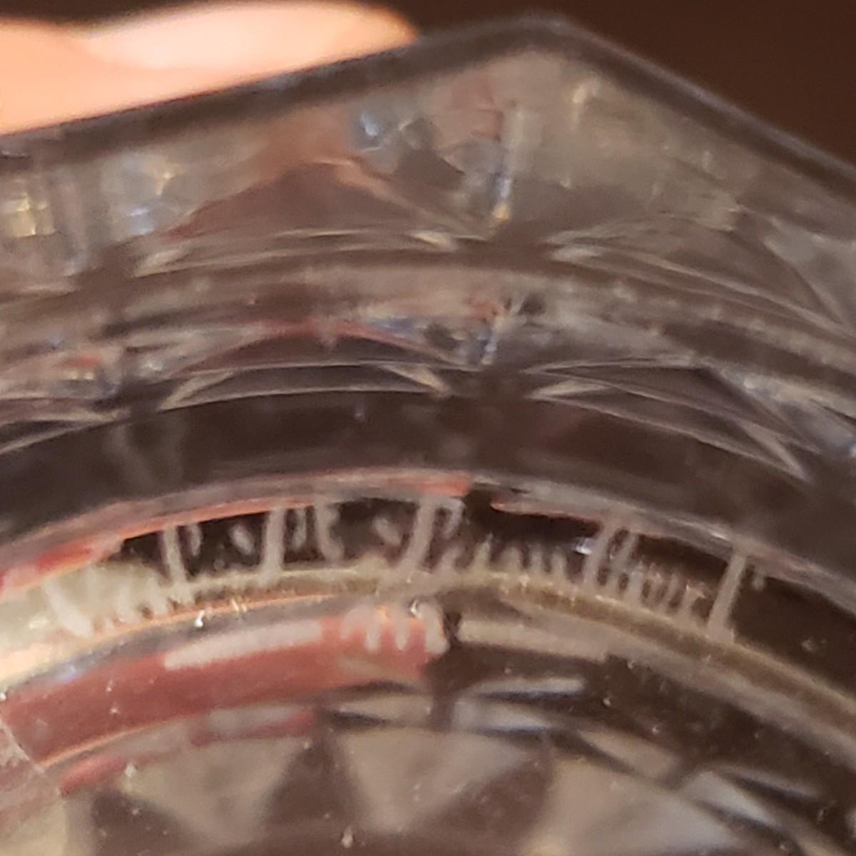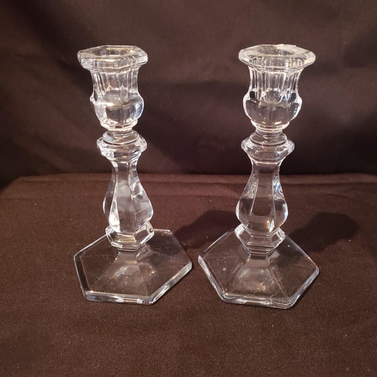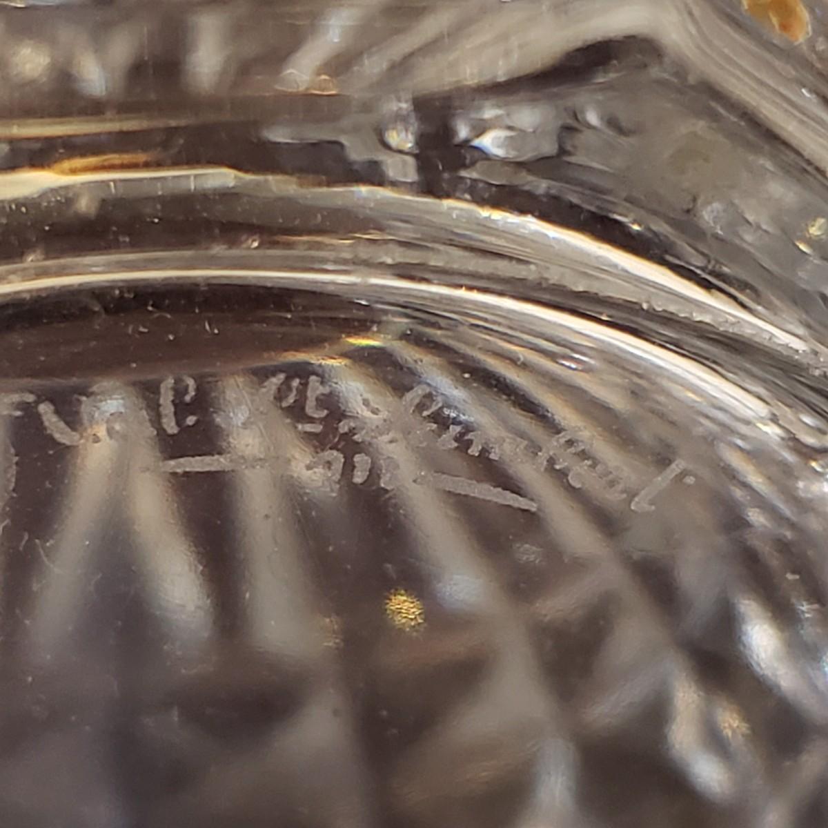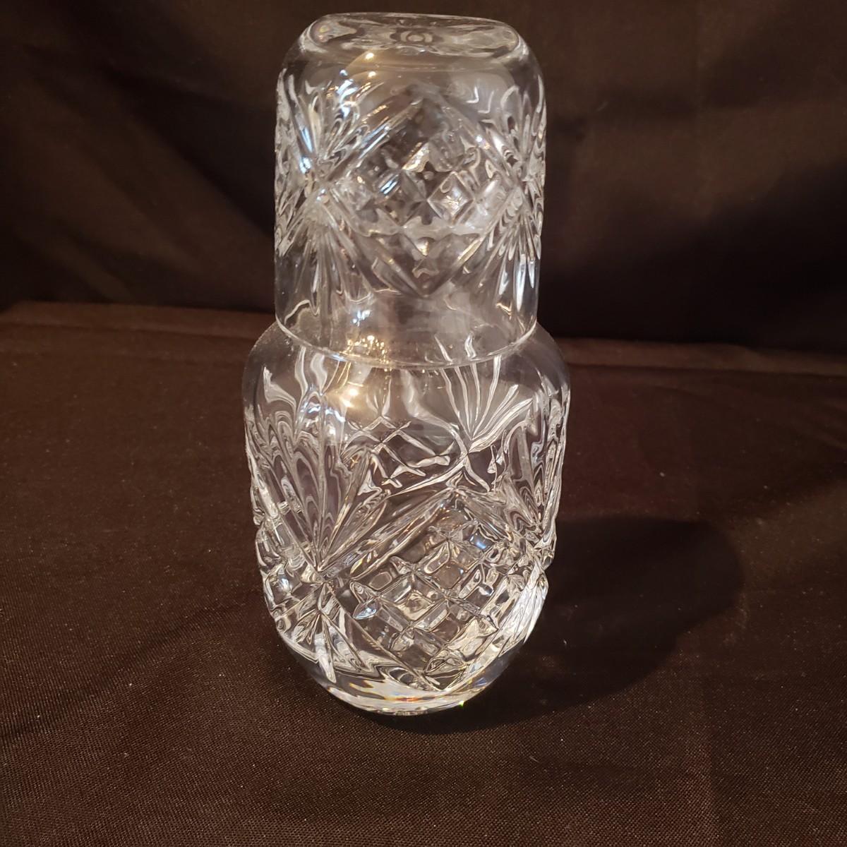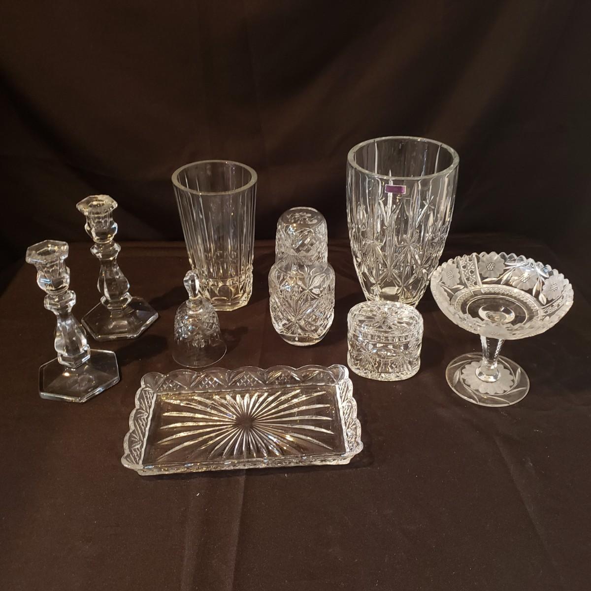 This elegant clear glass lot features a Marquis vase by Waterford. The vase is heavy to the touch and measures 5.5" x 10"H. The smaller vase also has markings, but it is hard to decipher, see pictures. The pair of candlesticks would look beautiful on your Thanksgiving table! There is a tray, a bell and a lidded jar to add to the elegance. The bedside night craft is not only beautiful but useful! The floral candy dish has a textured feel on the outside.