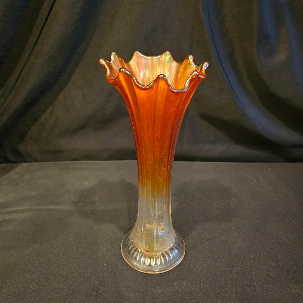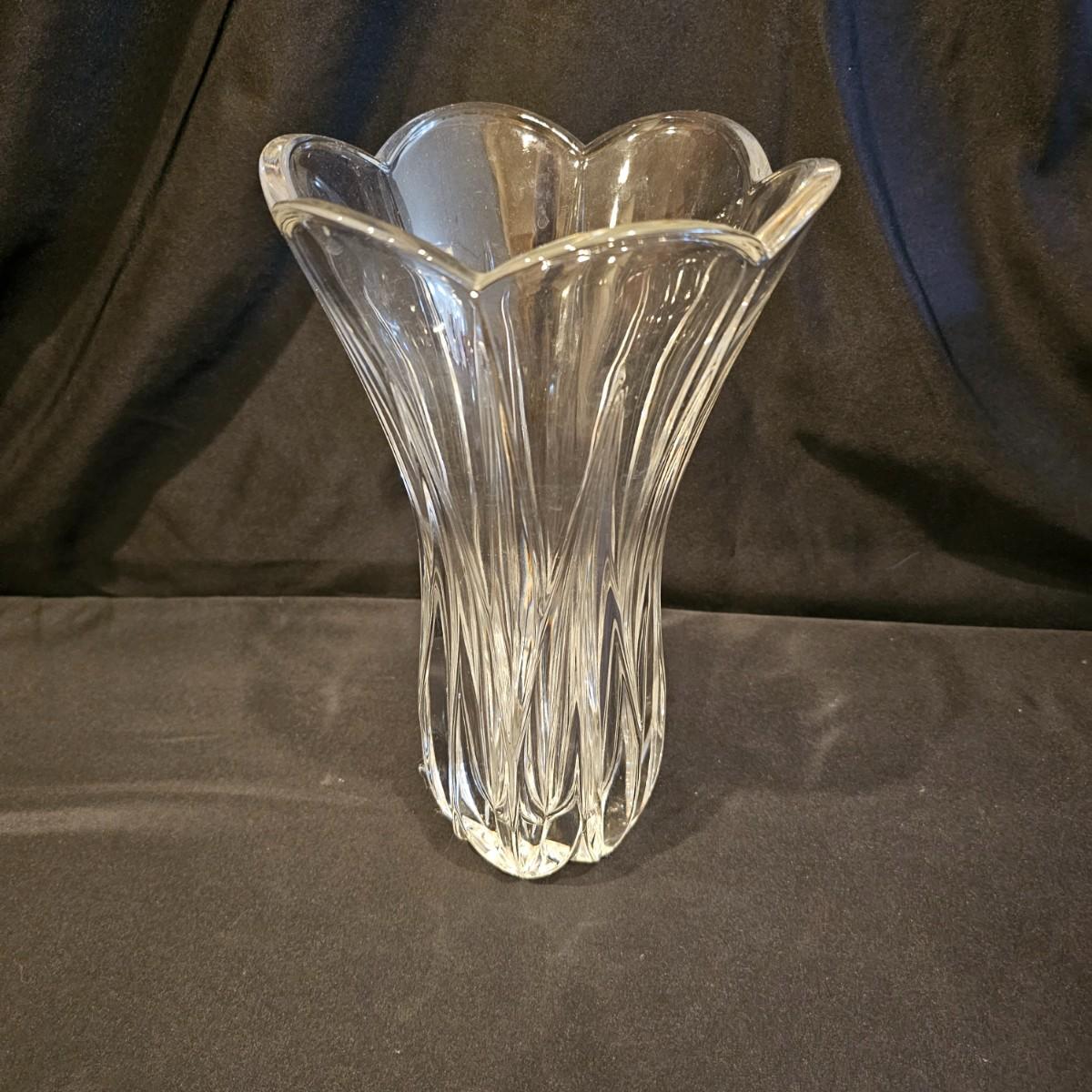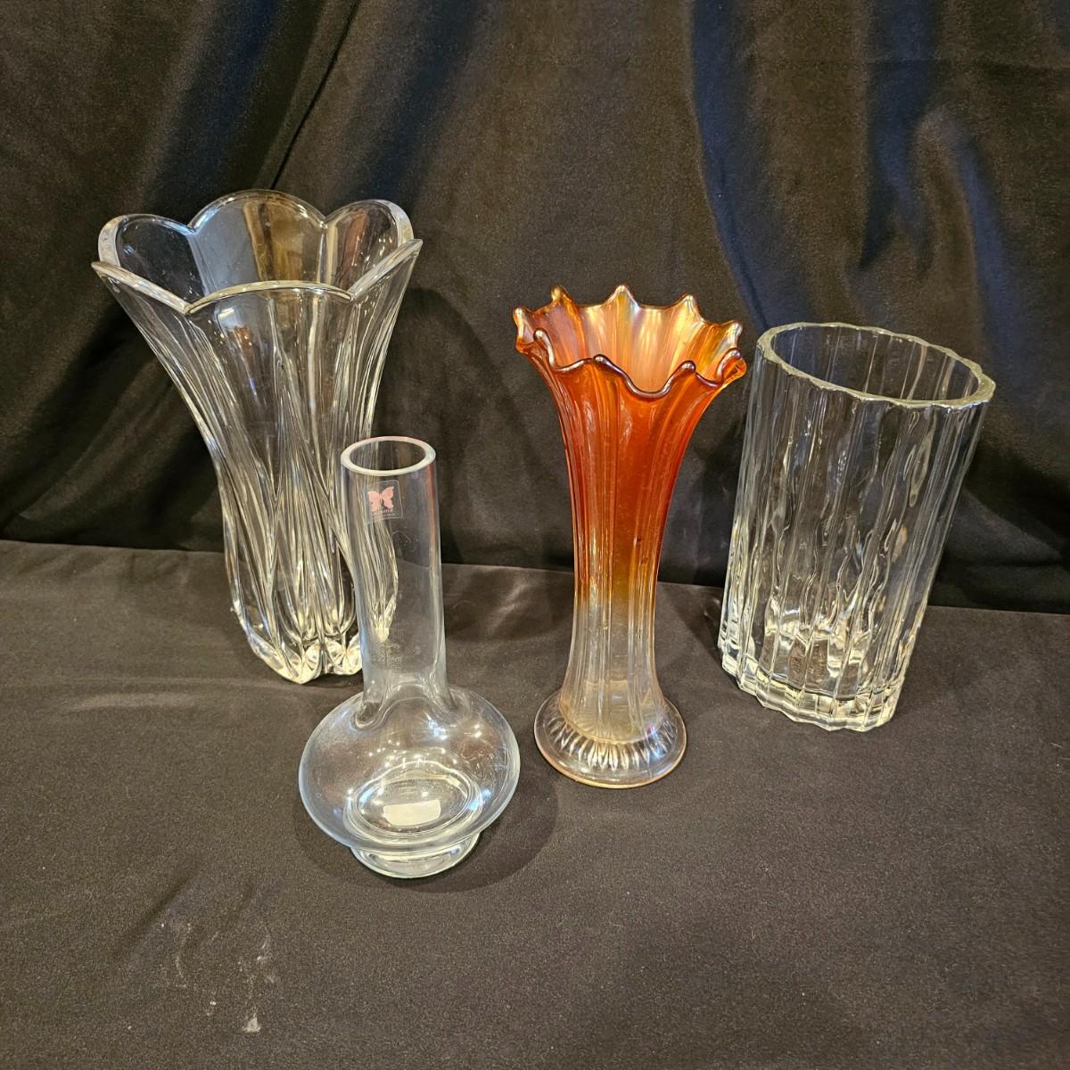 A unique Waterford bud vase and three other vases. Waterford piece is 4.25"d x 9" h, is free of chips or cracks. Tall crystal vase is 6.5" x 11" h, has small nick in bottom edge. Oval piece has fluted sides, measures 3.5" x 5" x 8.5" h. Colored vase is 4.25"d x 10" h, has iridescent shading on top. See photos for details. Shipping available. Shipping can be costly. We suggest contacting our preferred local shipping provider, Postage Express, with dimensions and getting an estimate before bidding: (828) 670-5501 or postageexpress@yahoo.com.