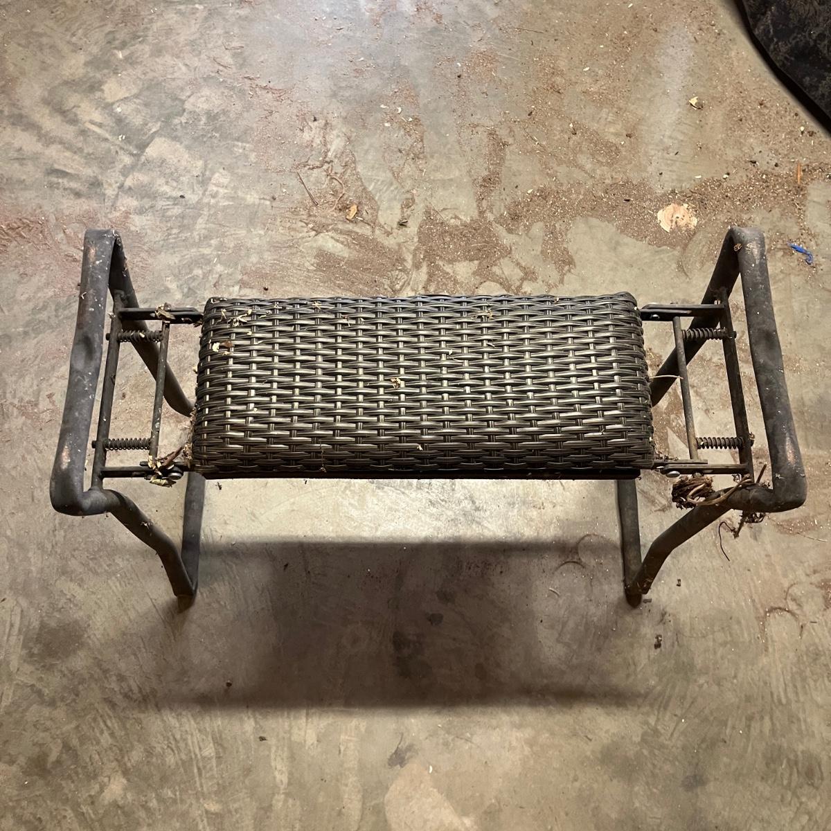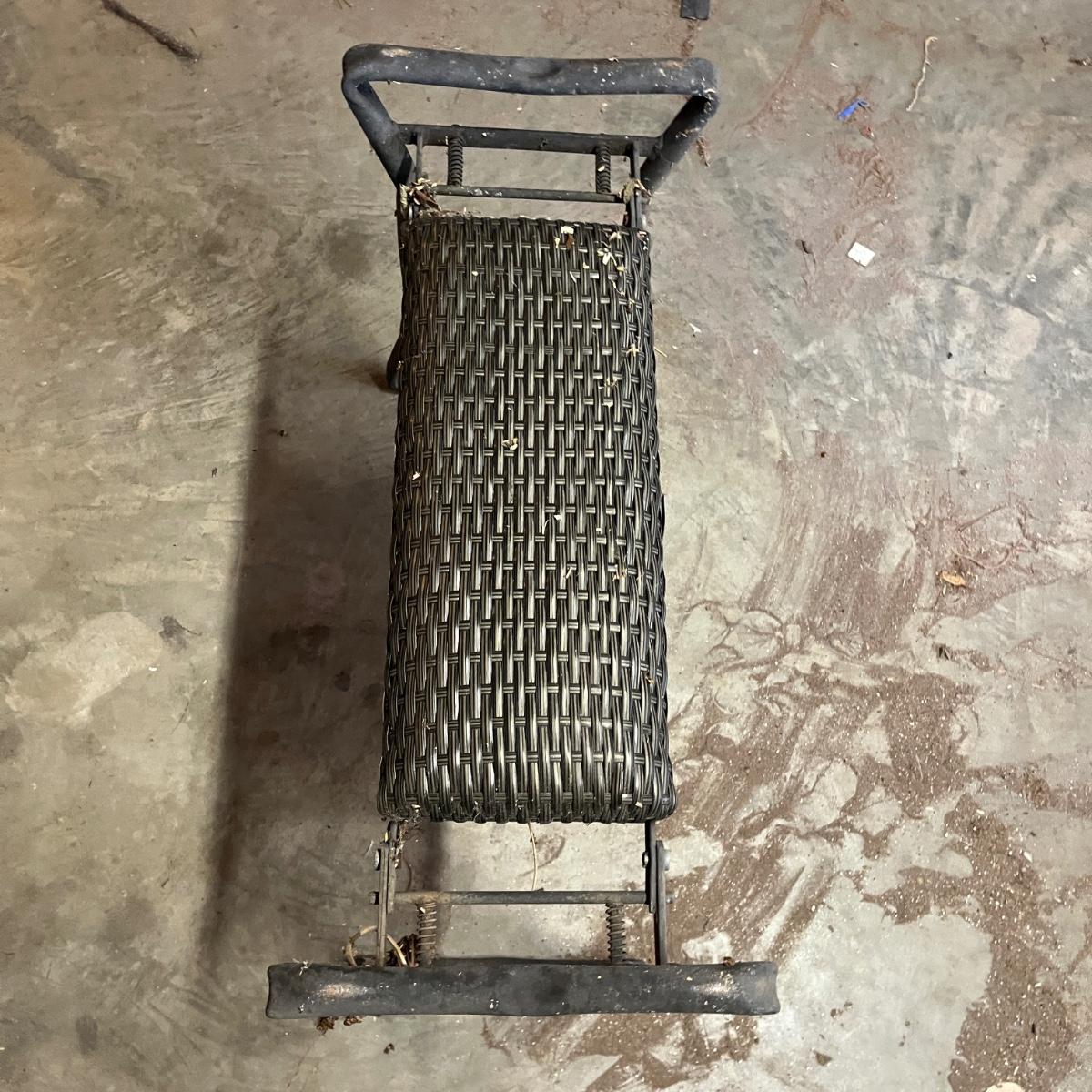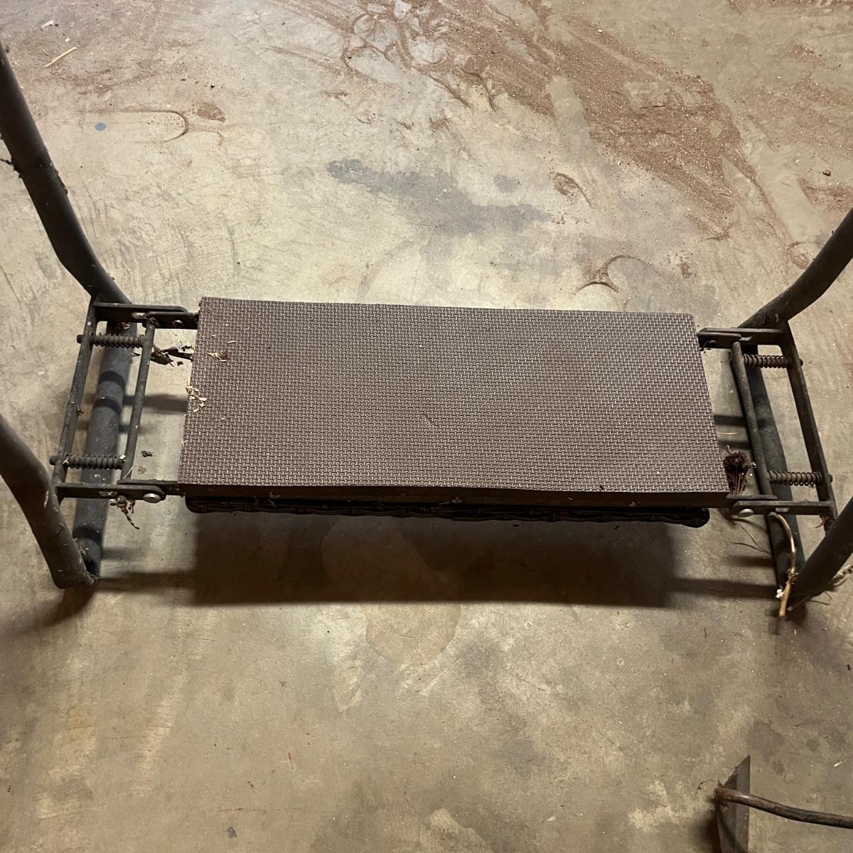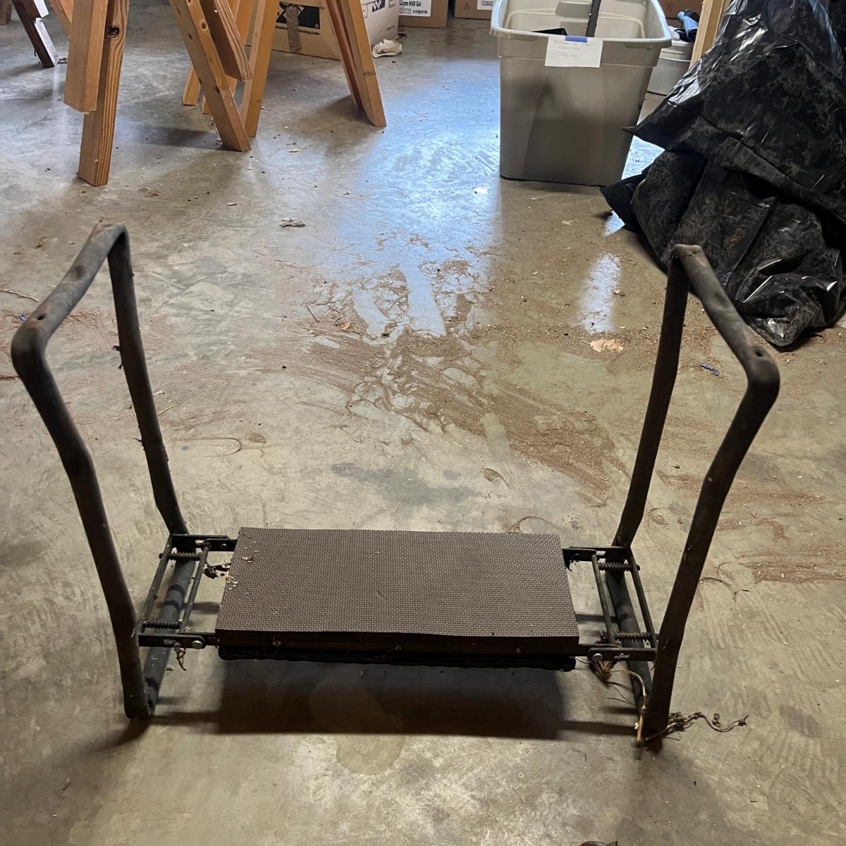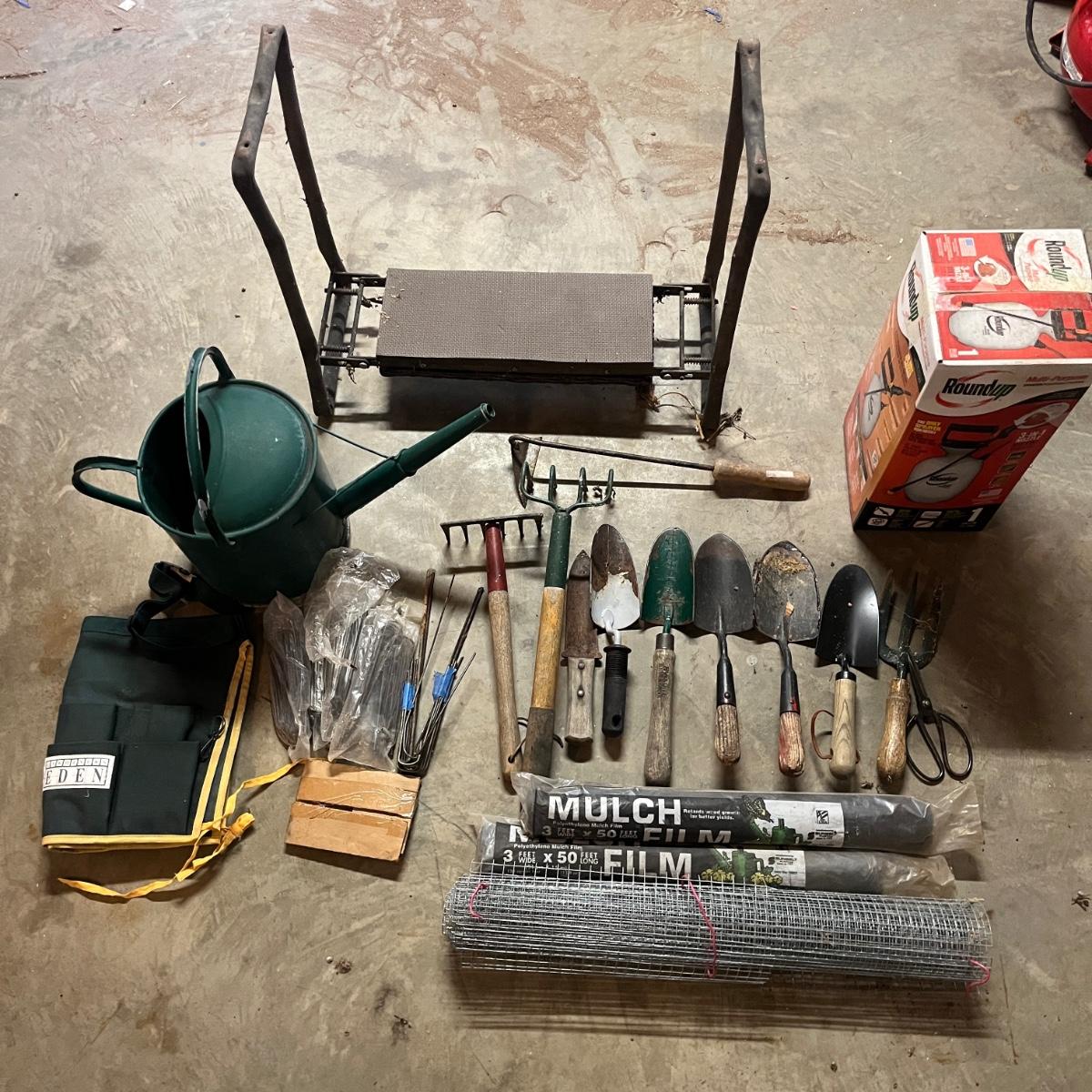 Lot includes a metal watering can, folding bench/kneeler, copper plant labels, hand rakes, trowels, garden stakes, lawn plastic sprayer and more. Folding bench measures 24” x 10” x 20”H when open.
