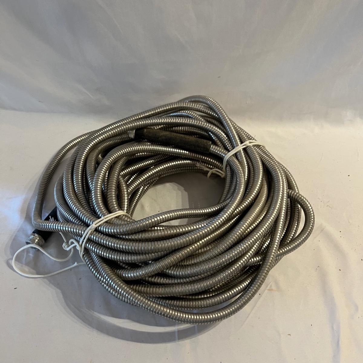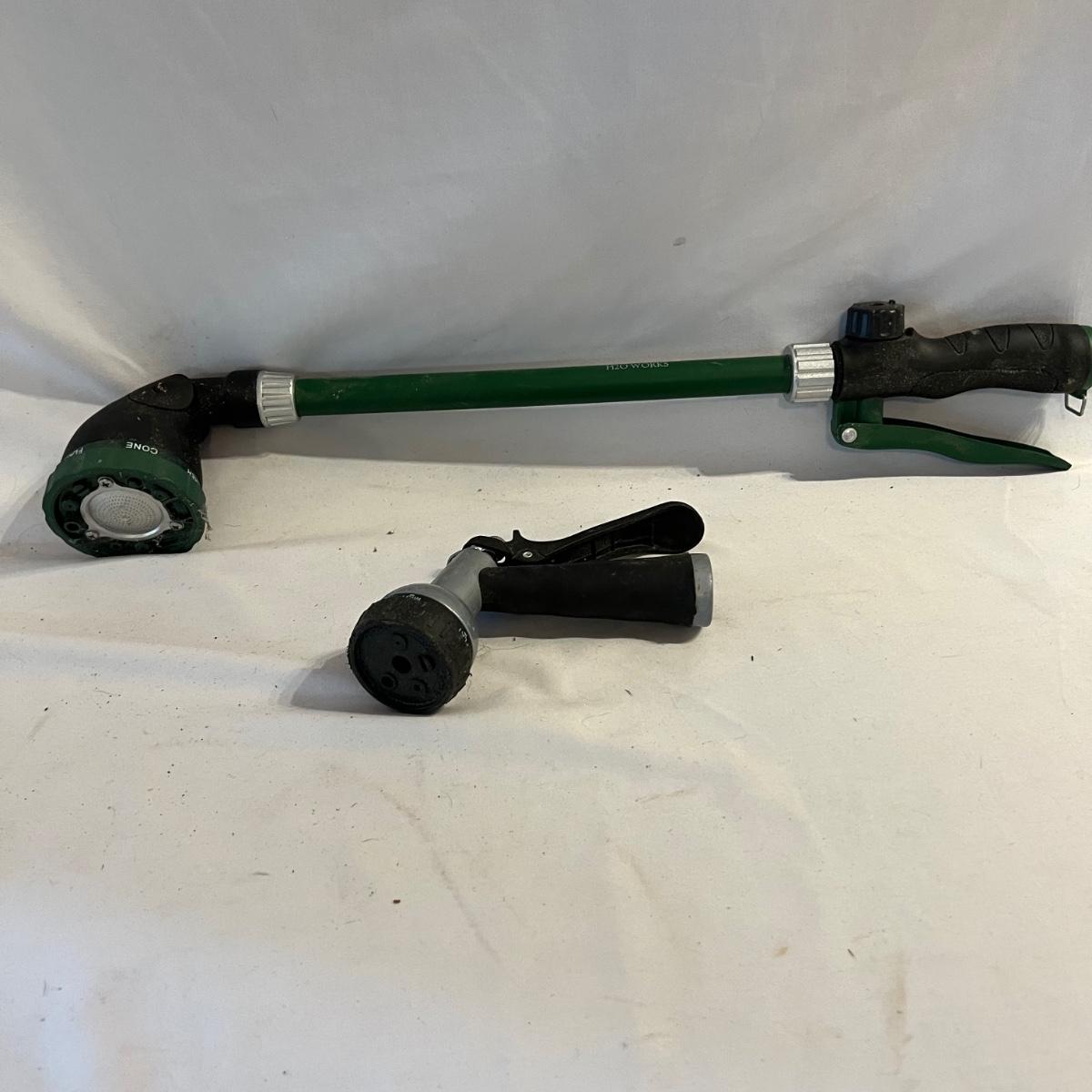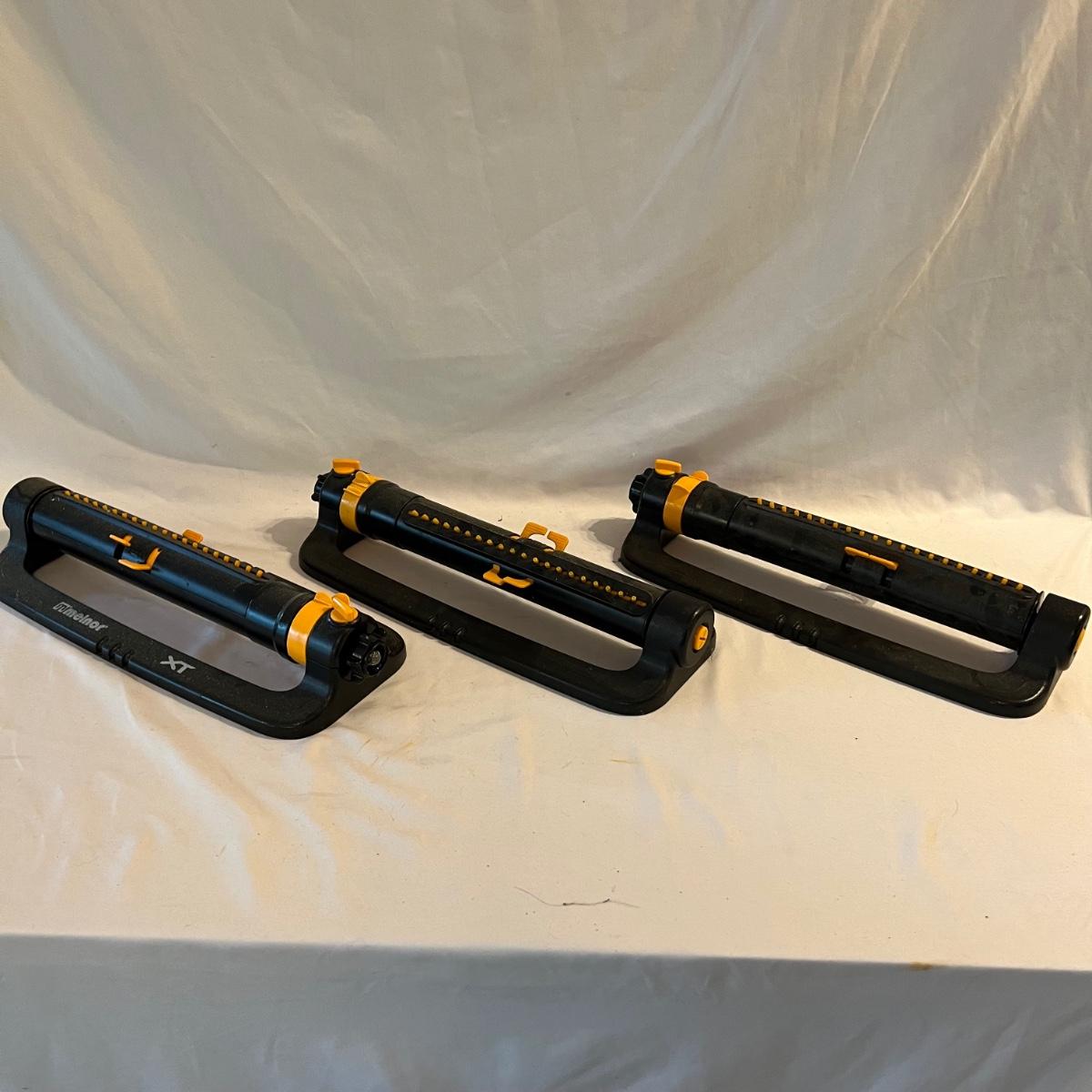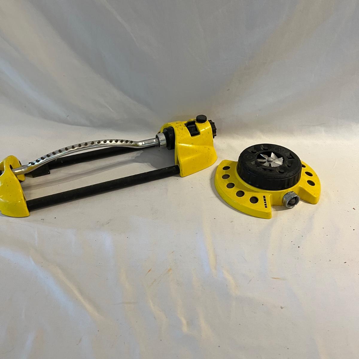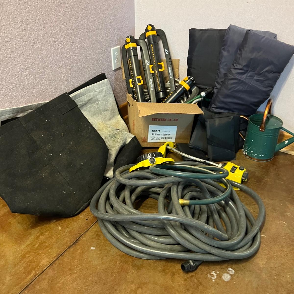 A full set of yard watering supplies and more. Five sprinklers, one watering wand, and one hose sprayer. Two rubber hoses, and one metal hose, four spigot insulators, a watering can and soil bags.