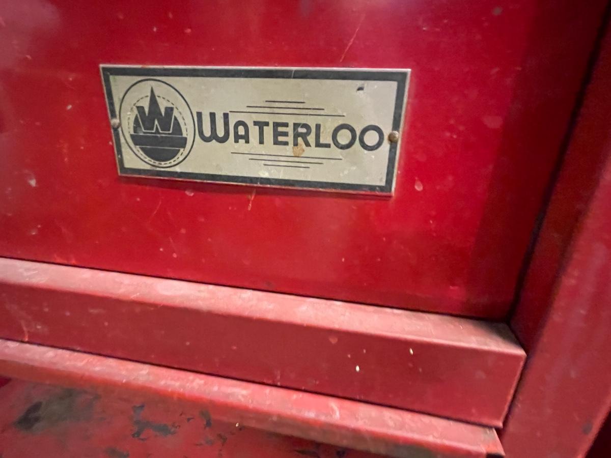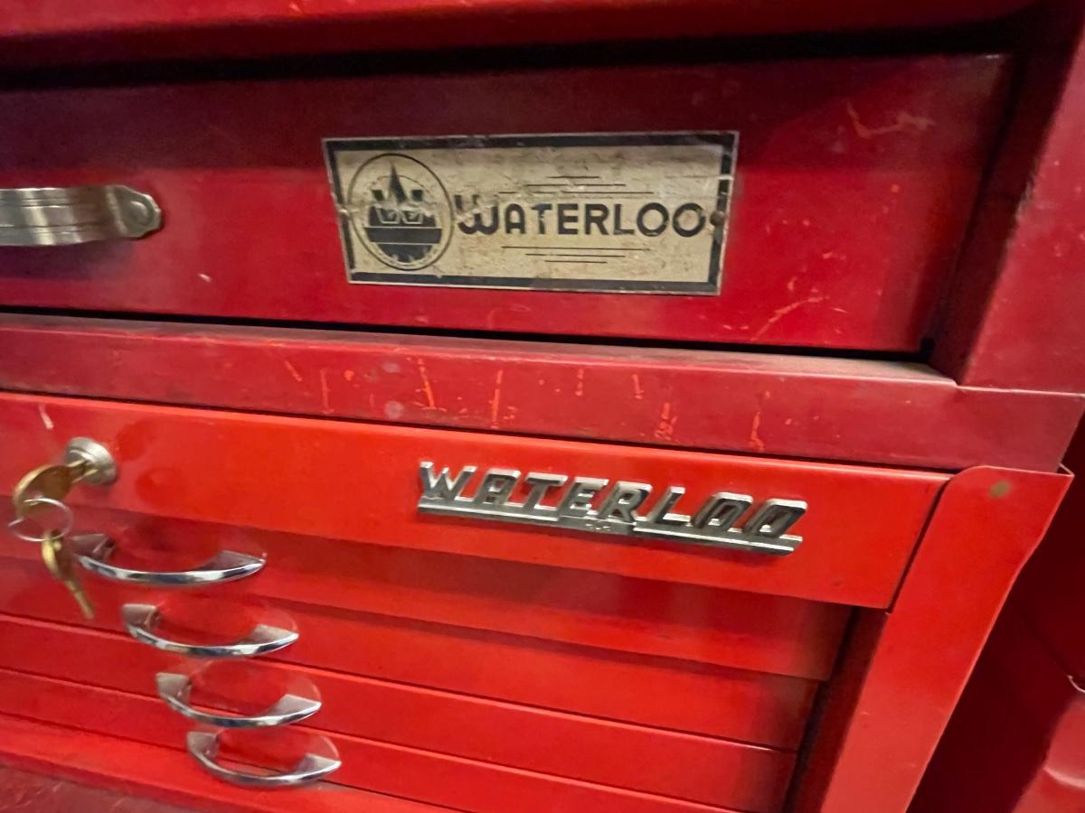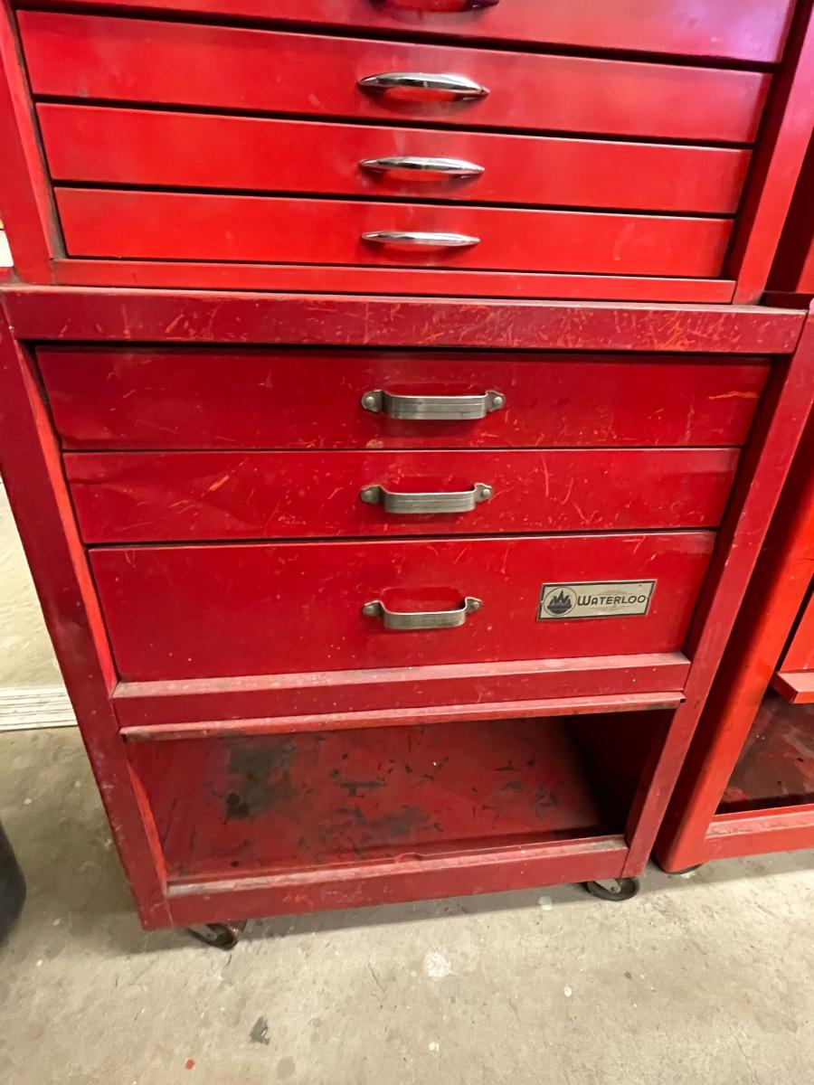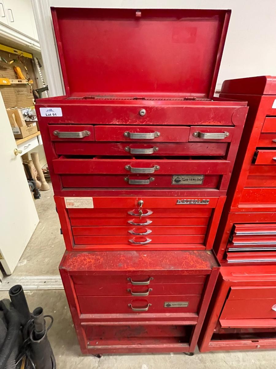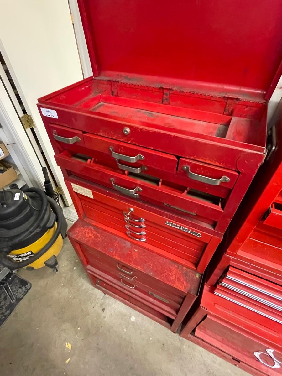 13 drawers/cabinet below & top storage in these 3 metal tool boxes stacked & 1 has keys. No tools included in this.