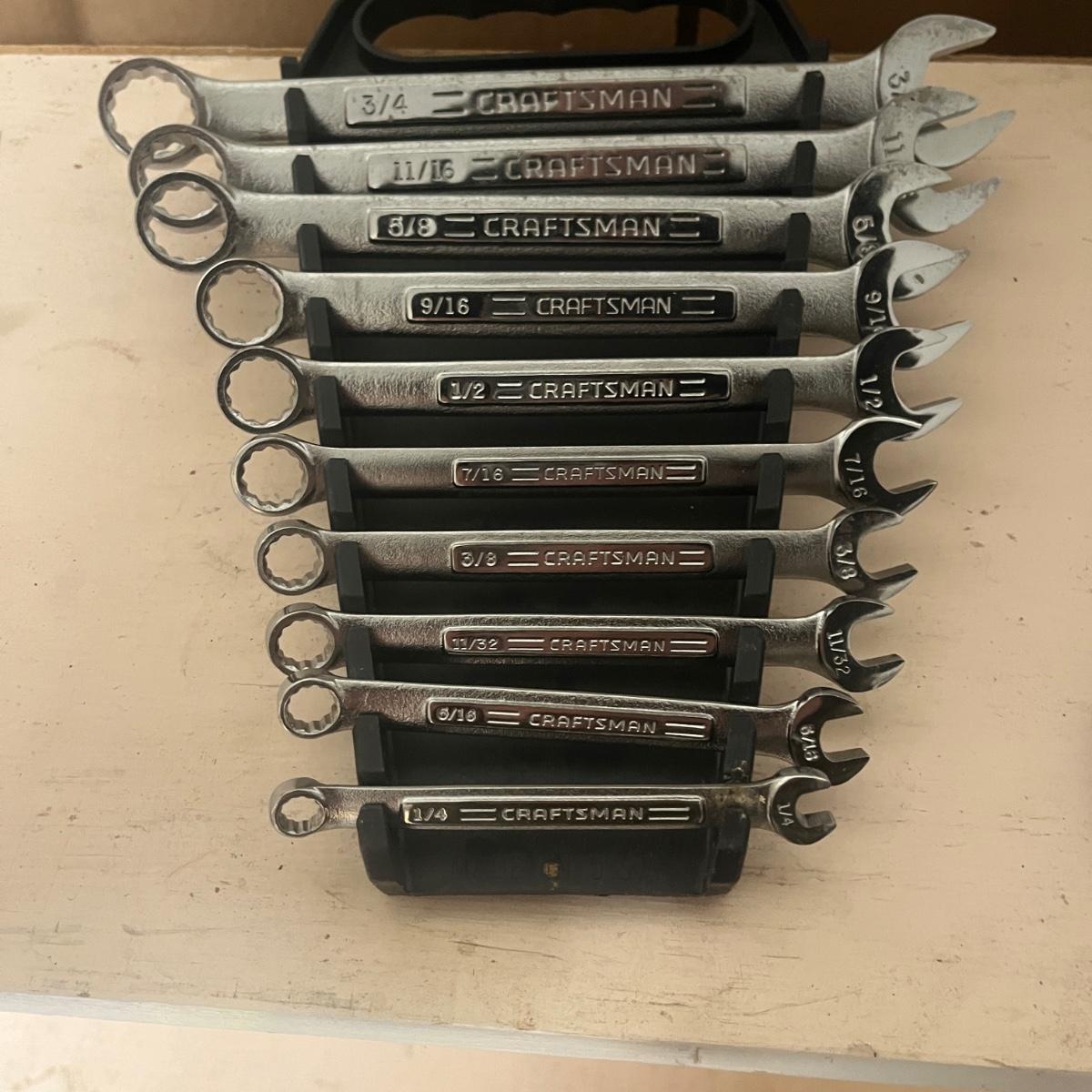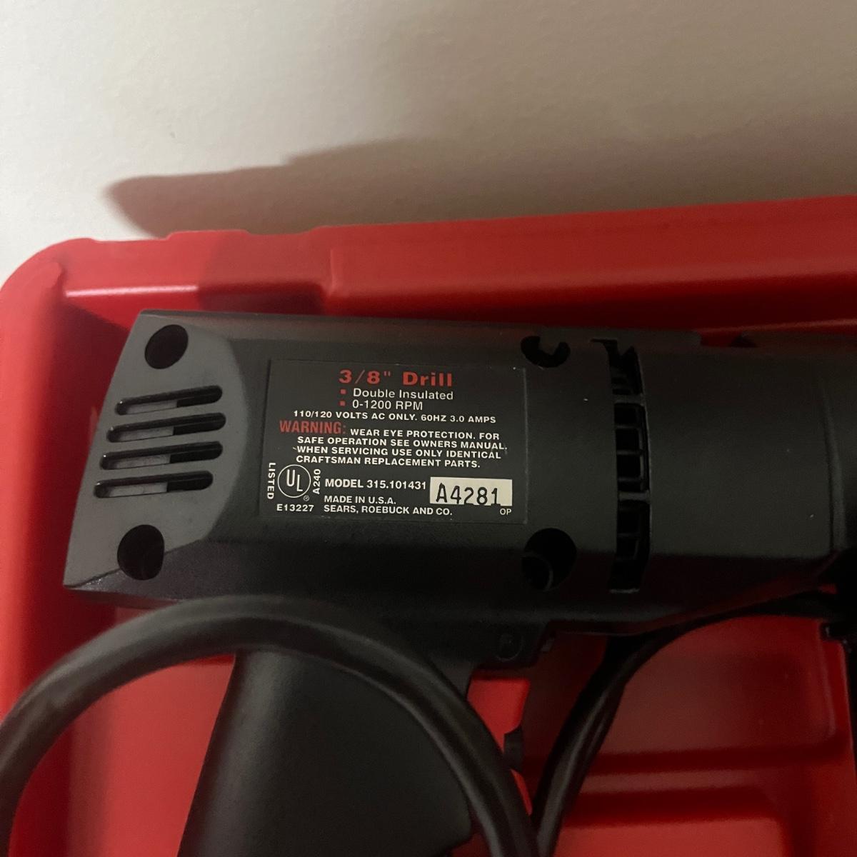 Lot includes a metal Waterloo toolbox with two drawers, Craftsman SAE wrenches and 3/8” electric drill, level, drill bits, screwdrivers, pliers and more.