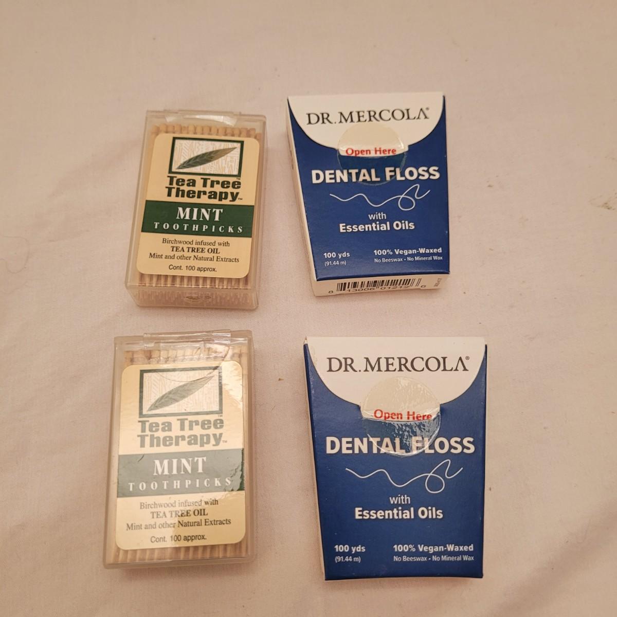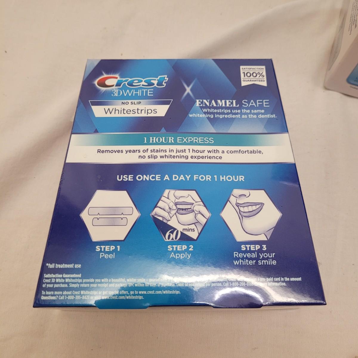 This lot includes a Waterpik water flosser, Crest 3D Whitestrips, a bamboo toothbrush and essential oil floss and toothpicks. Waterpik powers on when plugged in. Shipping available.