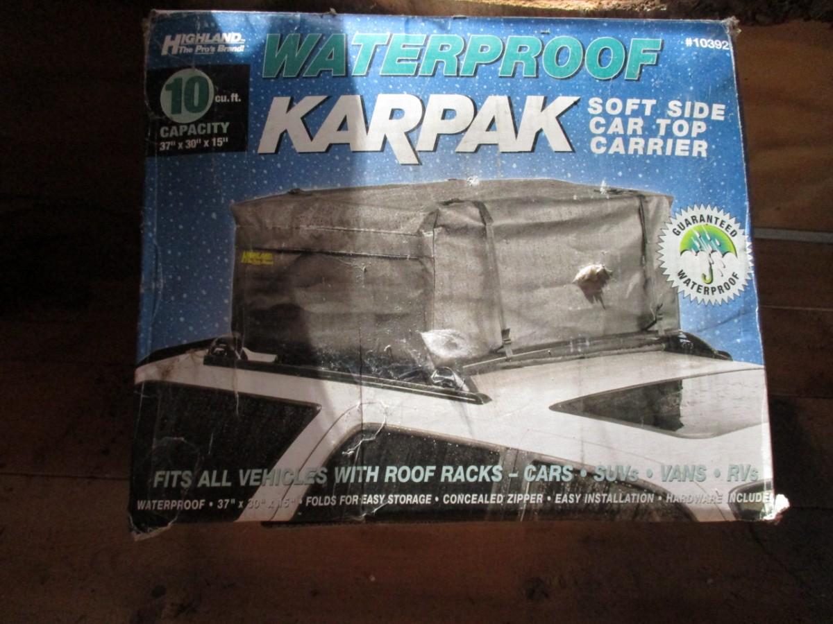 Waterproof Karpack Car Top Carrier PLEASE NOTE:. Due to no internet connection or wireless service, all invoices must be prepaid via PayPal, Stripe, or Zelle prior to arrival at pick up. Exact change cash onsite is acceptable but absolutely no debit or credit cards at time of pick up.