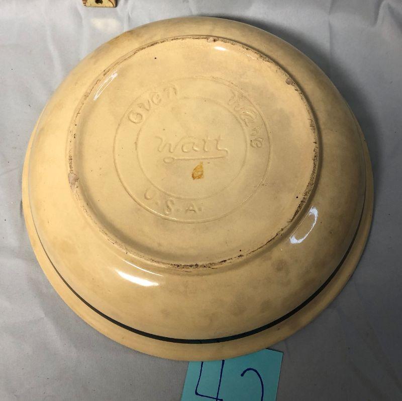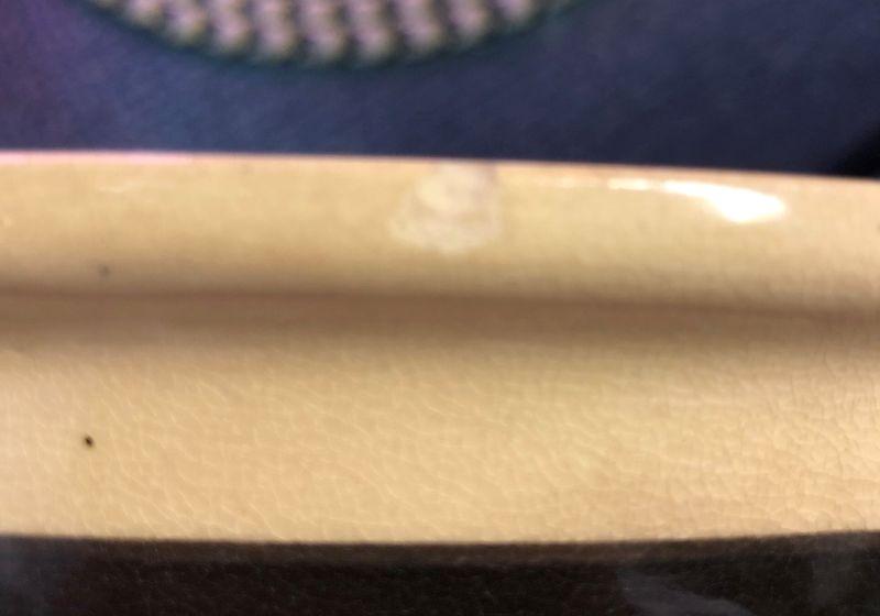 The main issue with this bowl is the spotting and discoloration under the glaze. I don't see any issue with the glaze that would result in this, but it's evident across the entire bowl. There is a small chip on the rim and one on the base, but otherwise, the paint is in great condition and there are not any cracks. It is 11" in diameter.