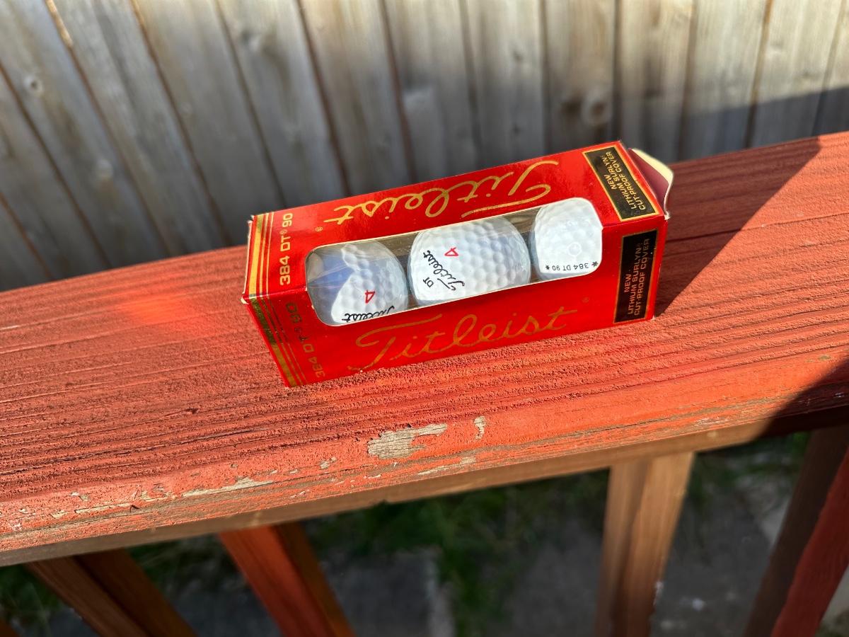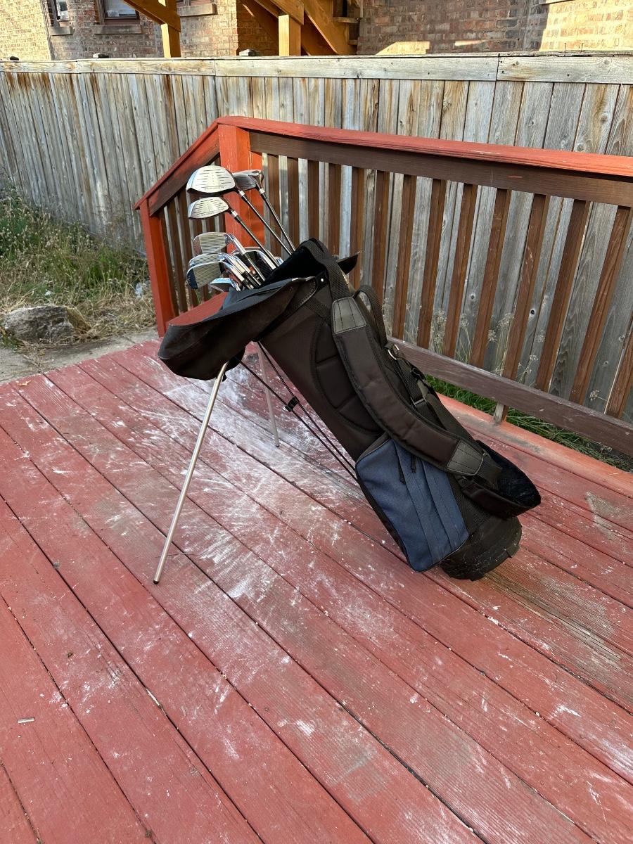 11 piece left hand golf club set with bag, brand new golf balls, and tees.