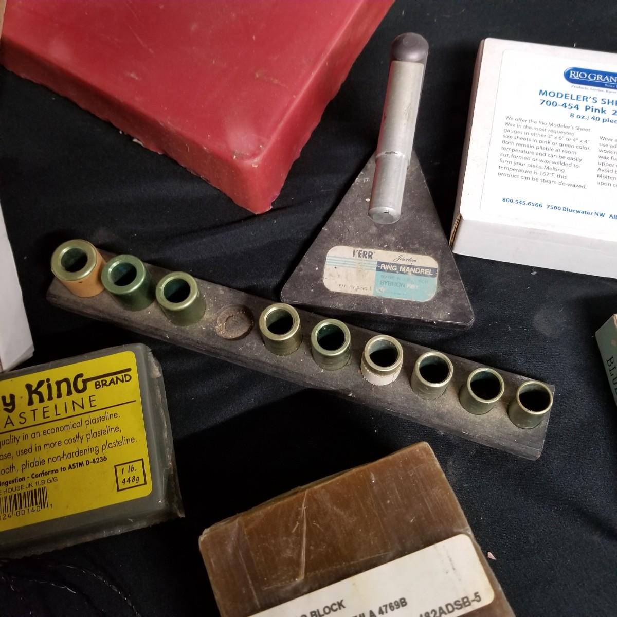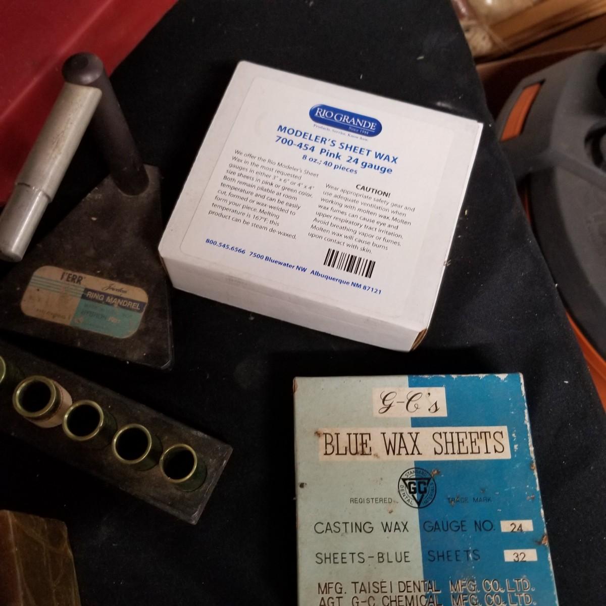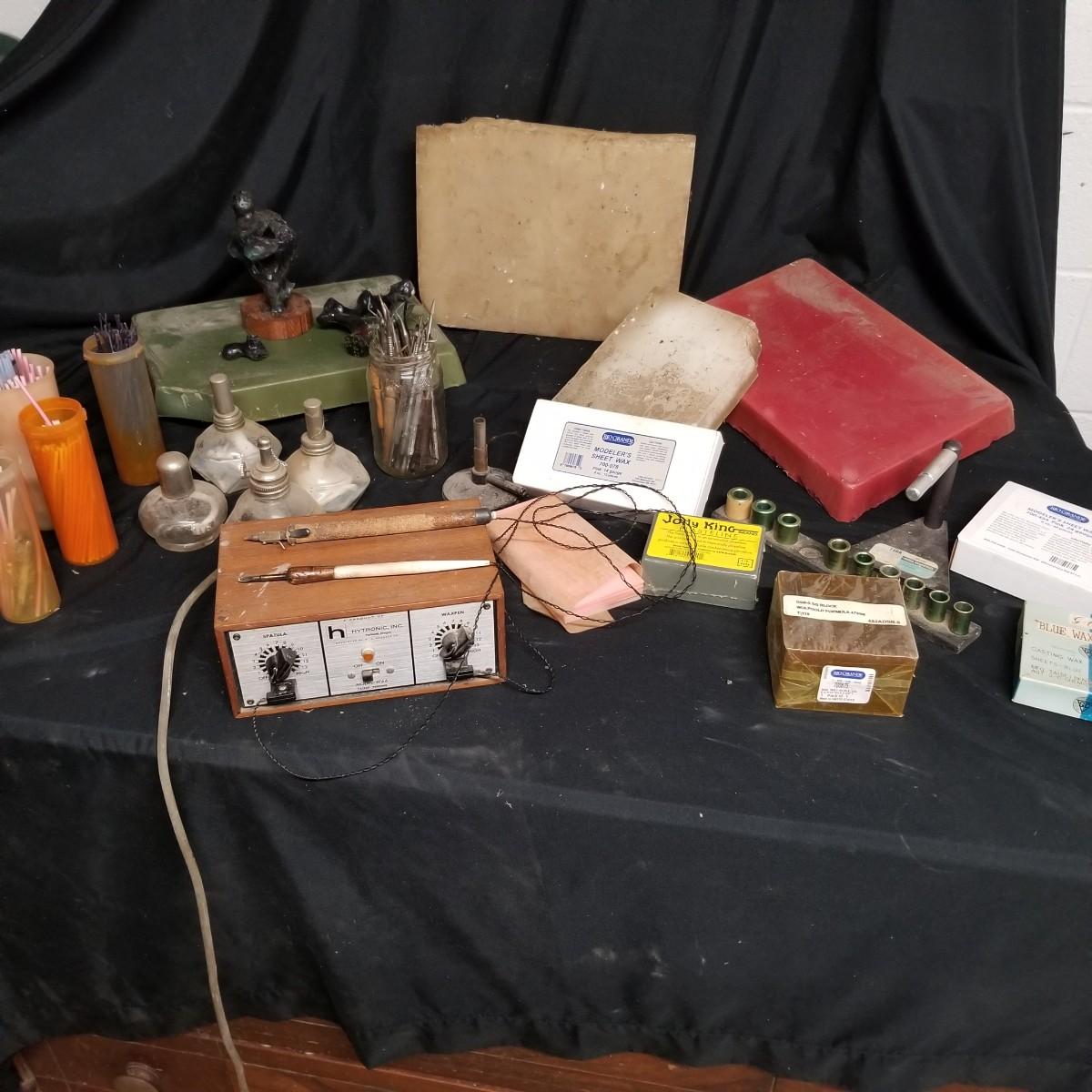 An abundance of wax and wax working tools to create jewelry or whatever you like.   Three boxes of assorted types of wax, blocks, sticks, sheets.  Various types of hand tools, picks, etc.  One Kerr ring mandrel forming set. Four spirit alcohol lamps. One Hytronic model W66 electric spatula and pen unit.  Item would not power on so untested.  Local pickup only.