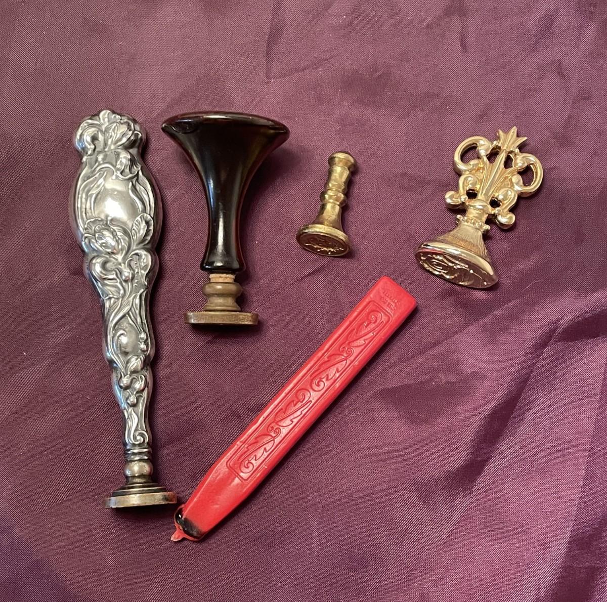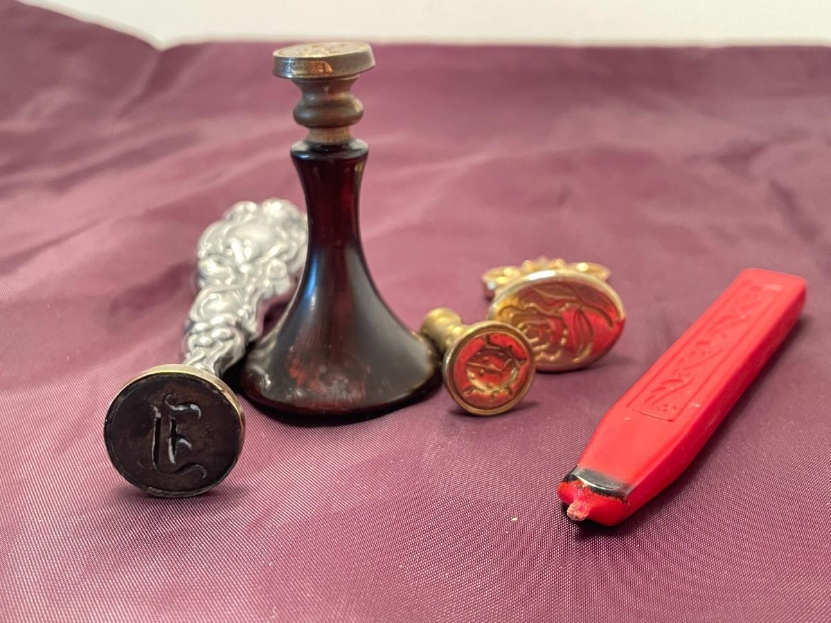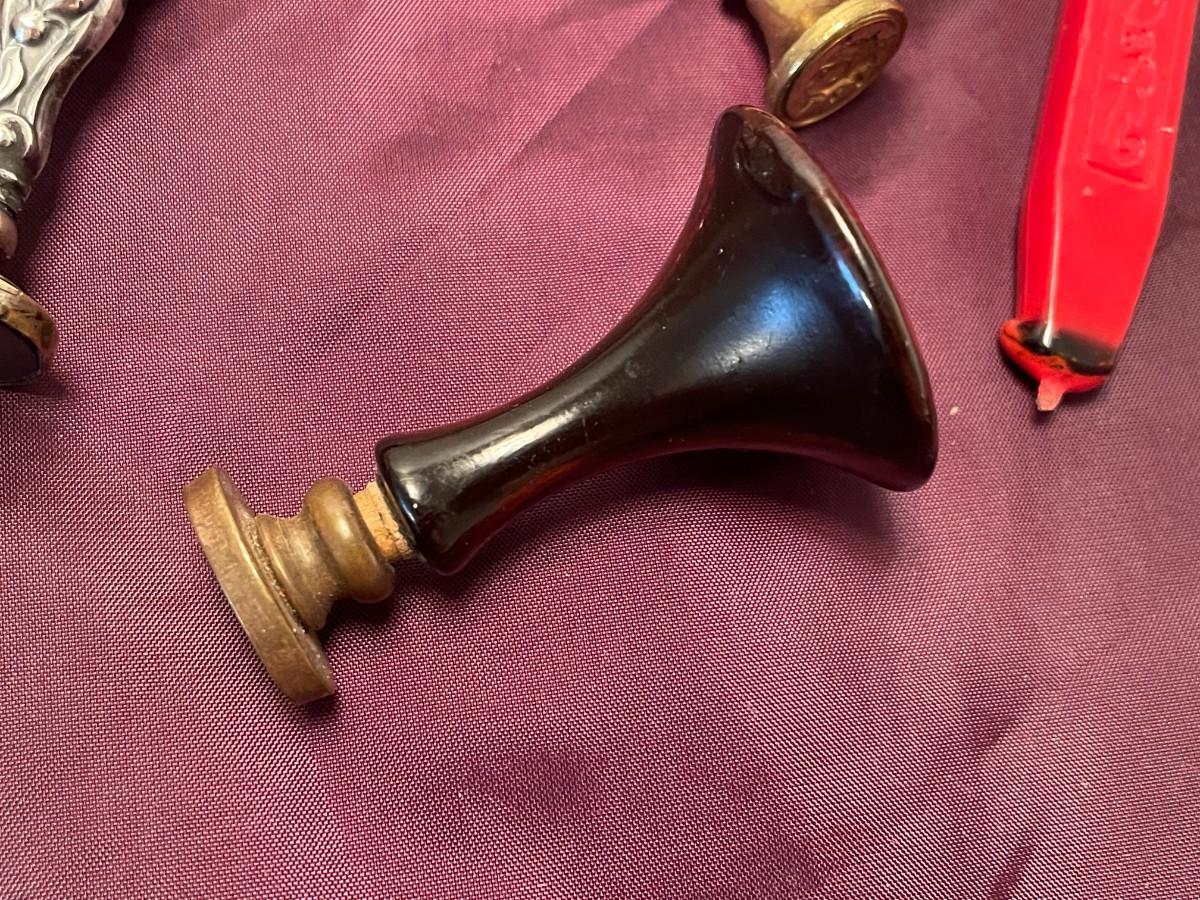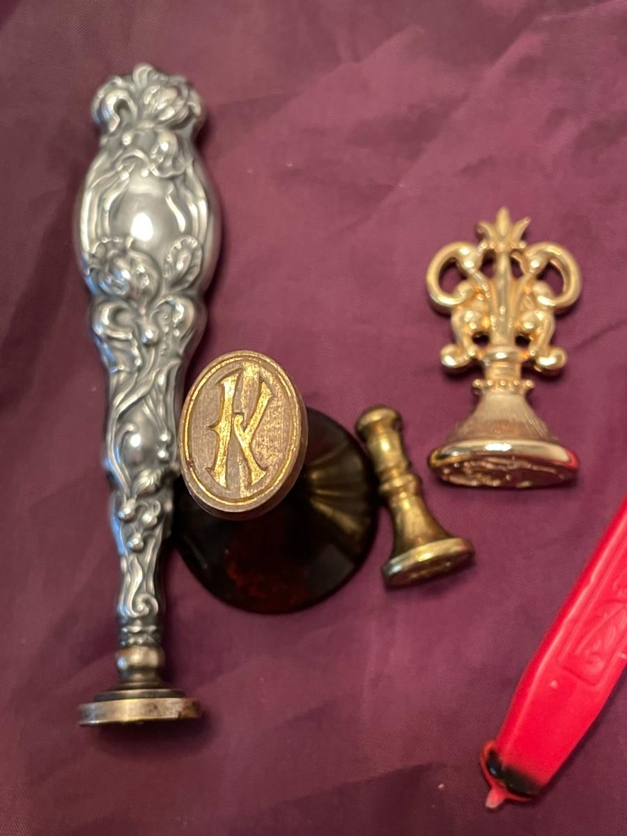 The polished and lacquered hardwood handled wax sealer is from the 1930s and has the letter K. The silver colored one has the letter E, the smallest one is made of brass and has a ladybug on it. The last one is a rose design and circa 1960s.