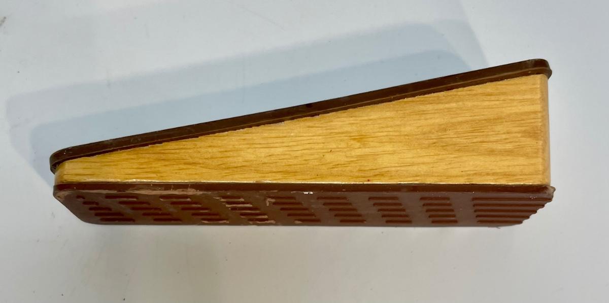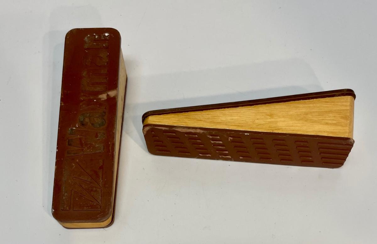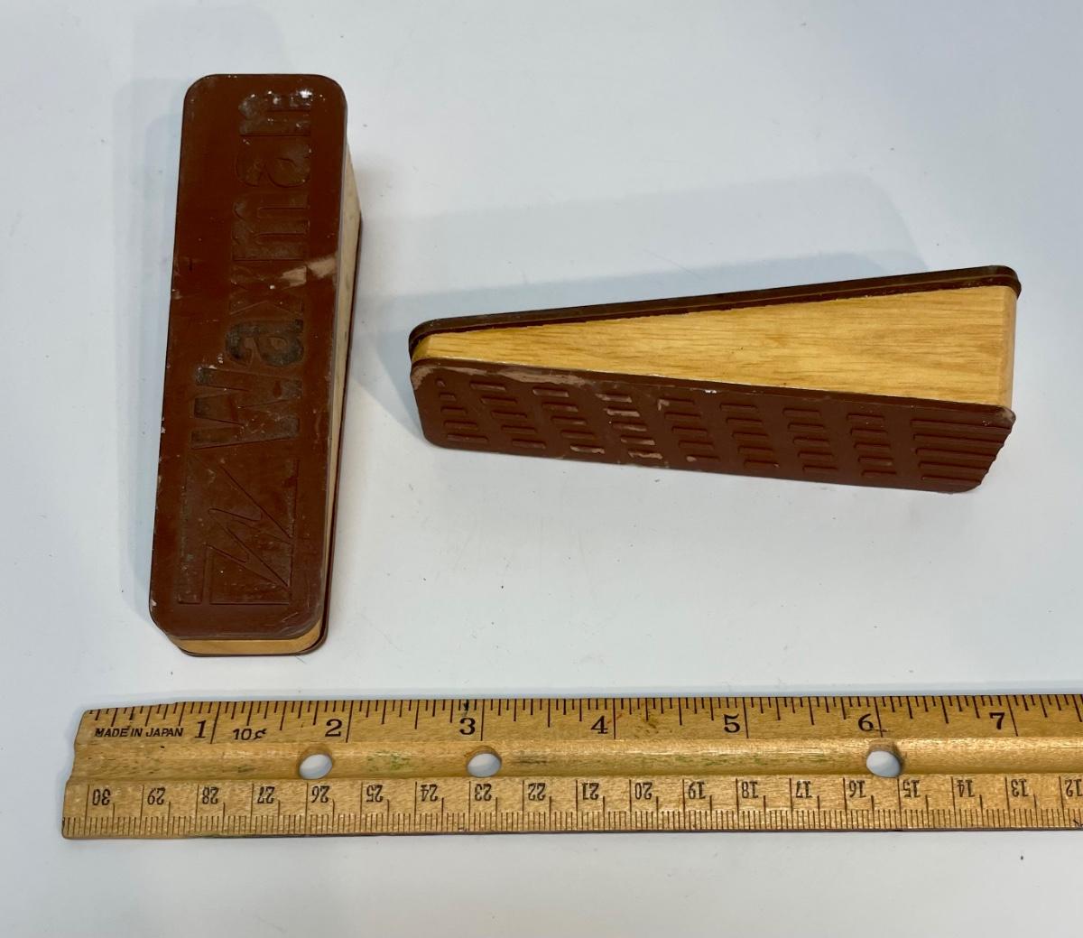 Pair of Waxman Oak brown doorstops with dark brown rubber surfaces.