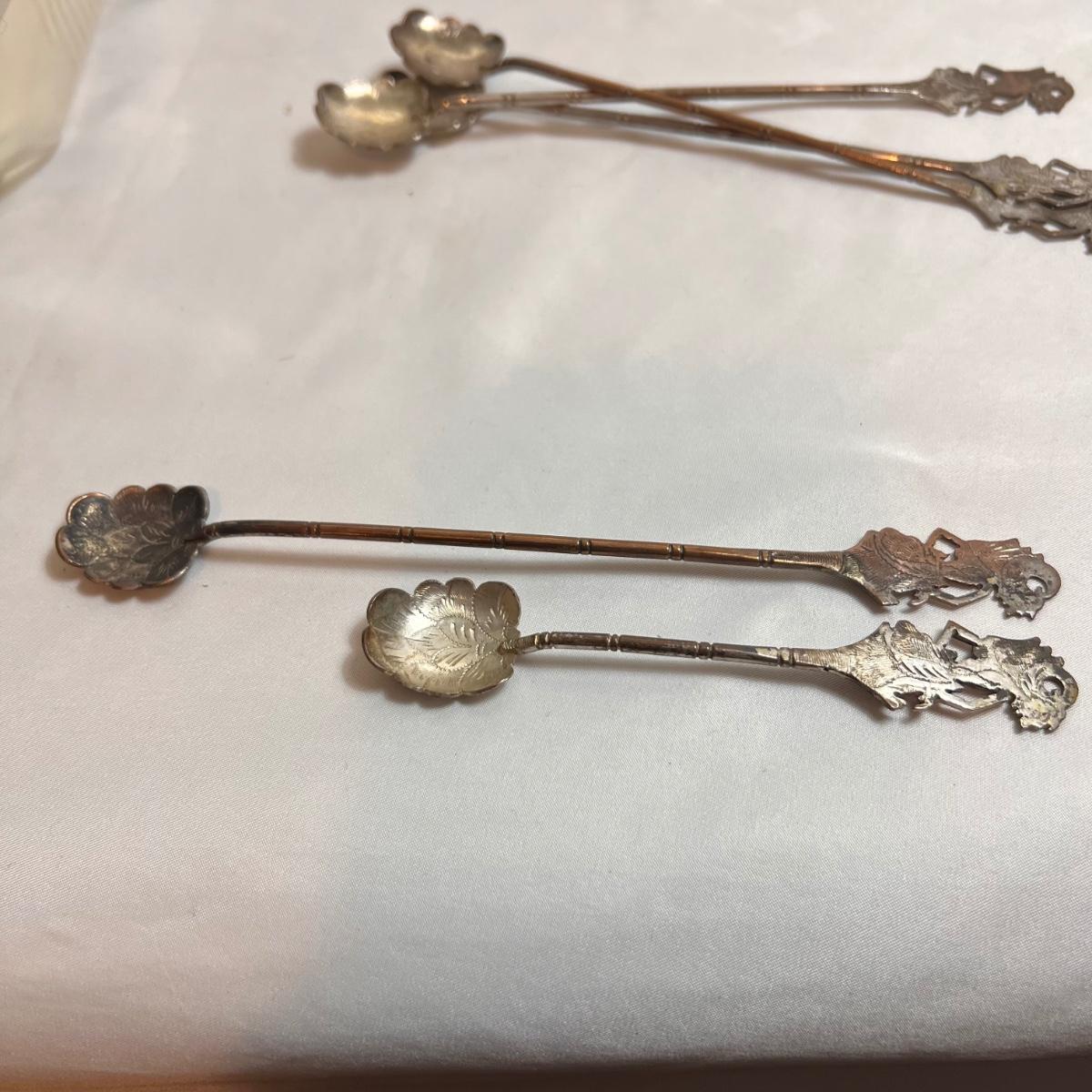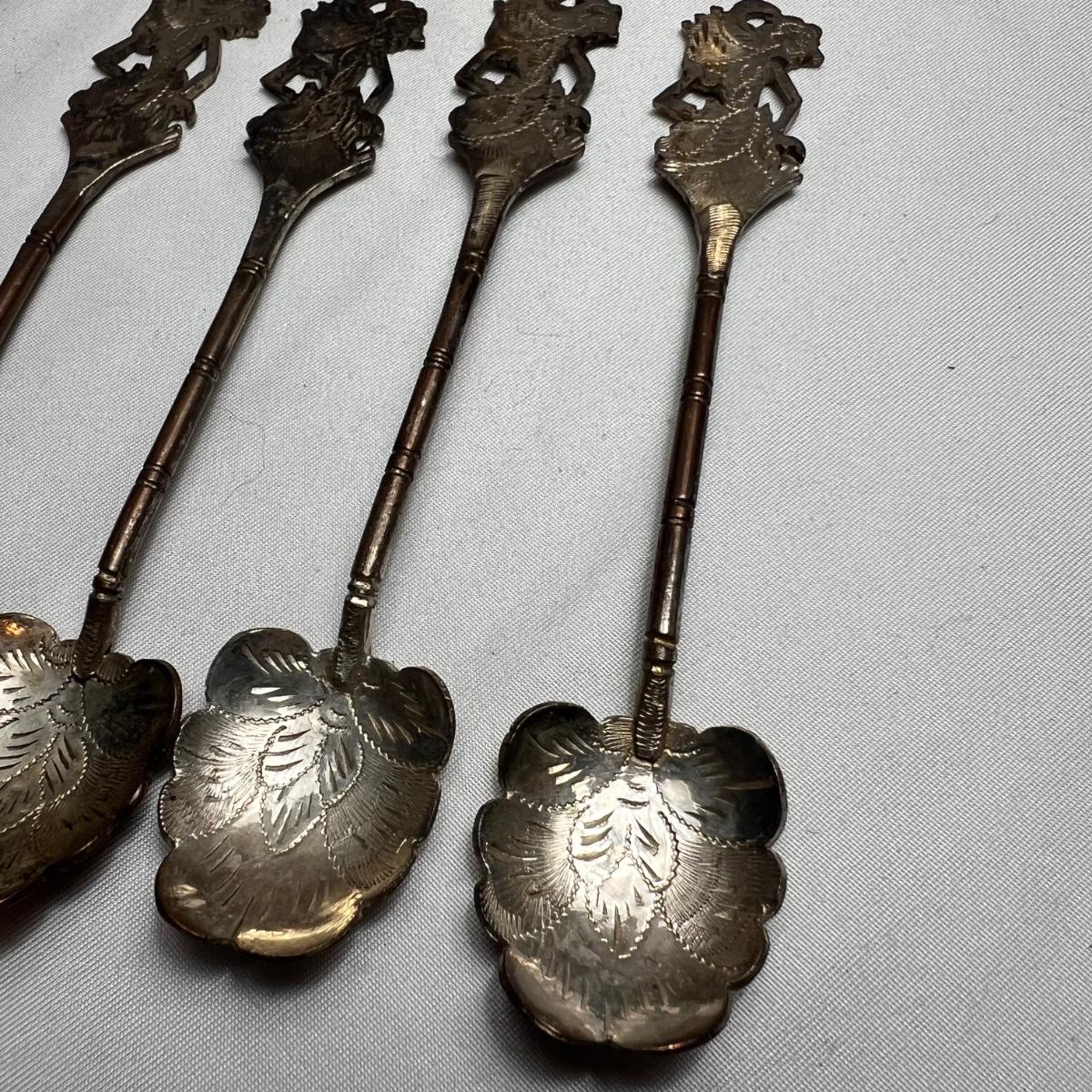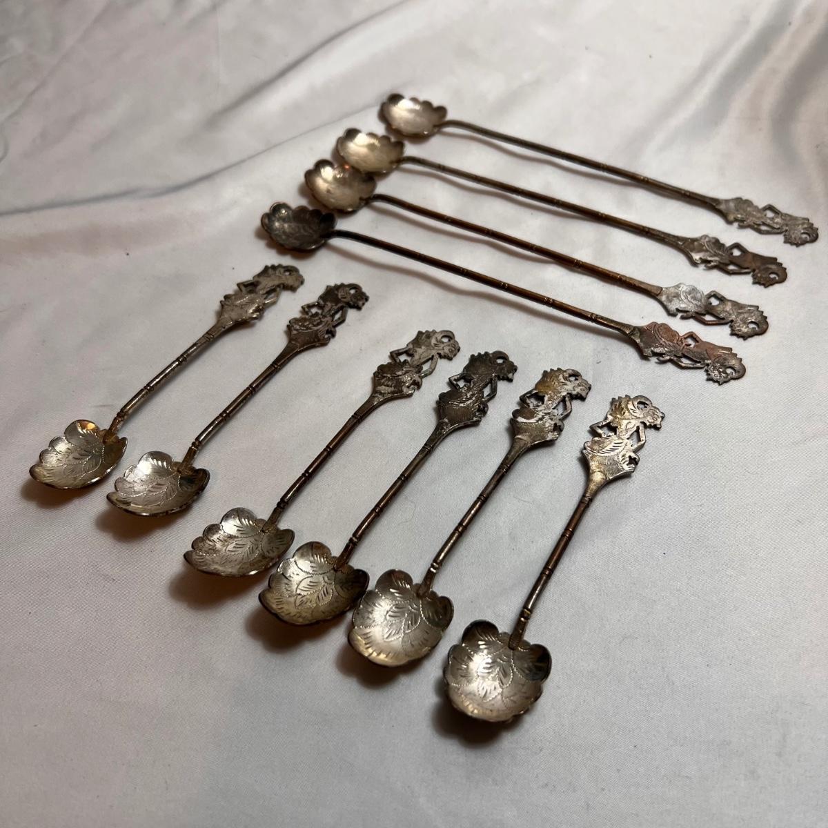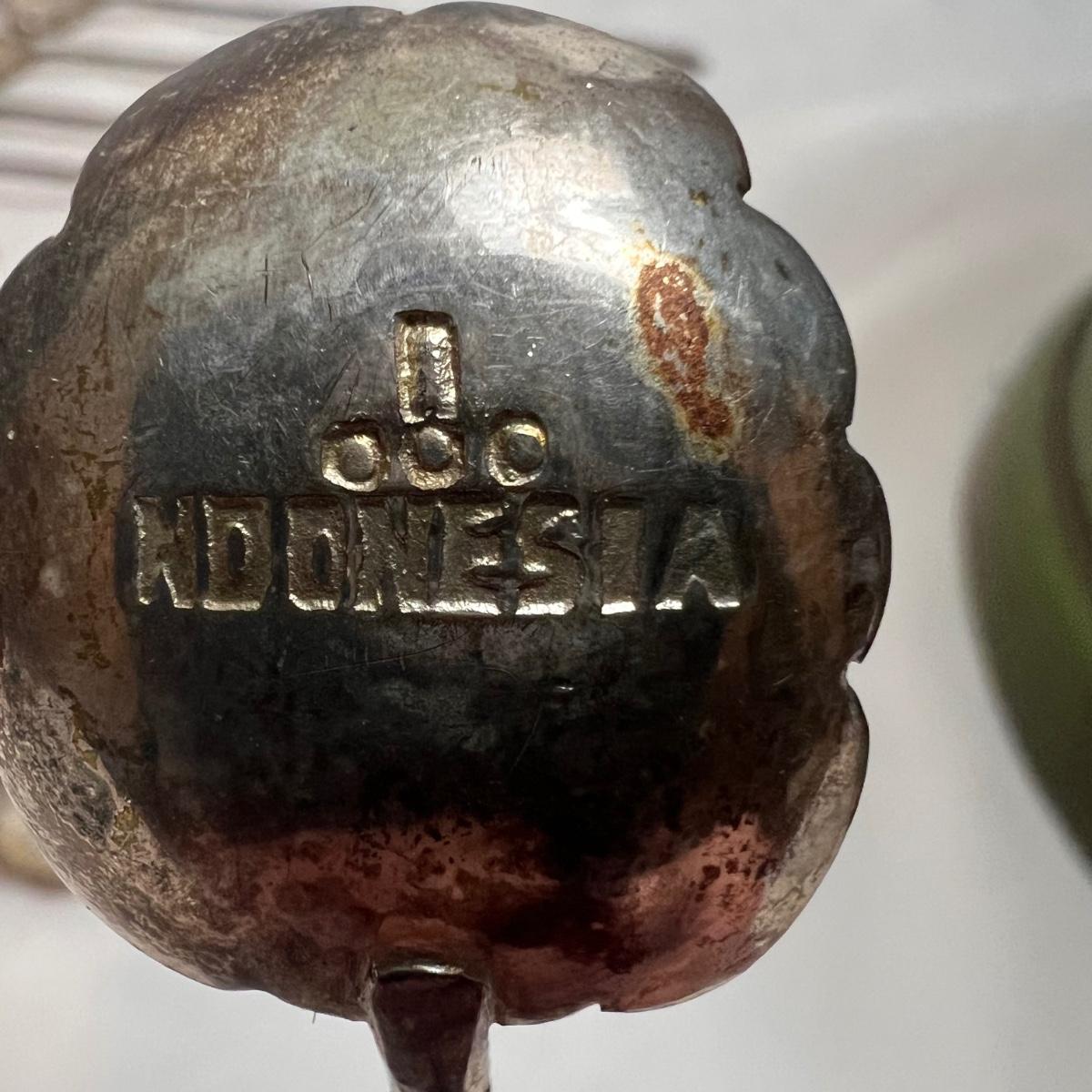 Ten Indonesian spoons have a wayang puppet design and are silver toned. Each are marked Ndonesia for Indonesia and have a mark, see pics. Four are longer than the other six. Longer spoons measure 7” long.