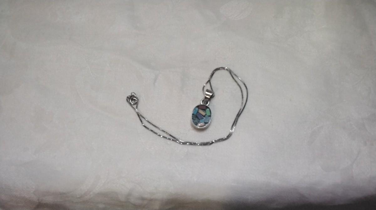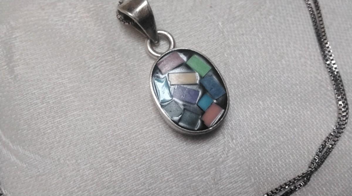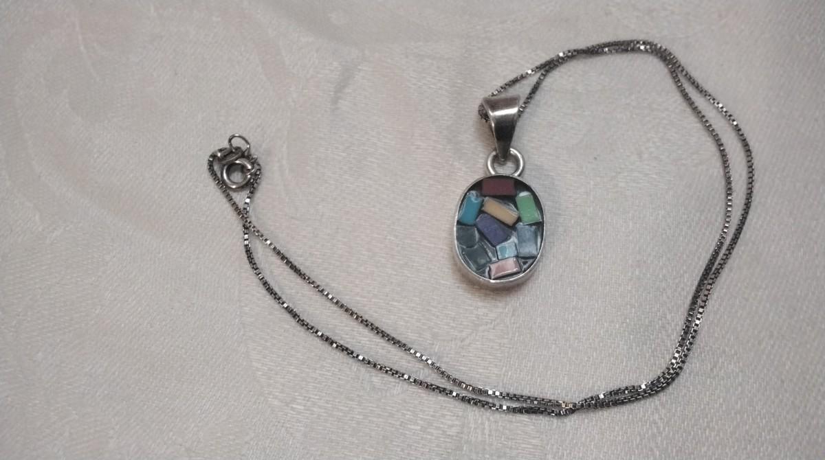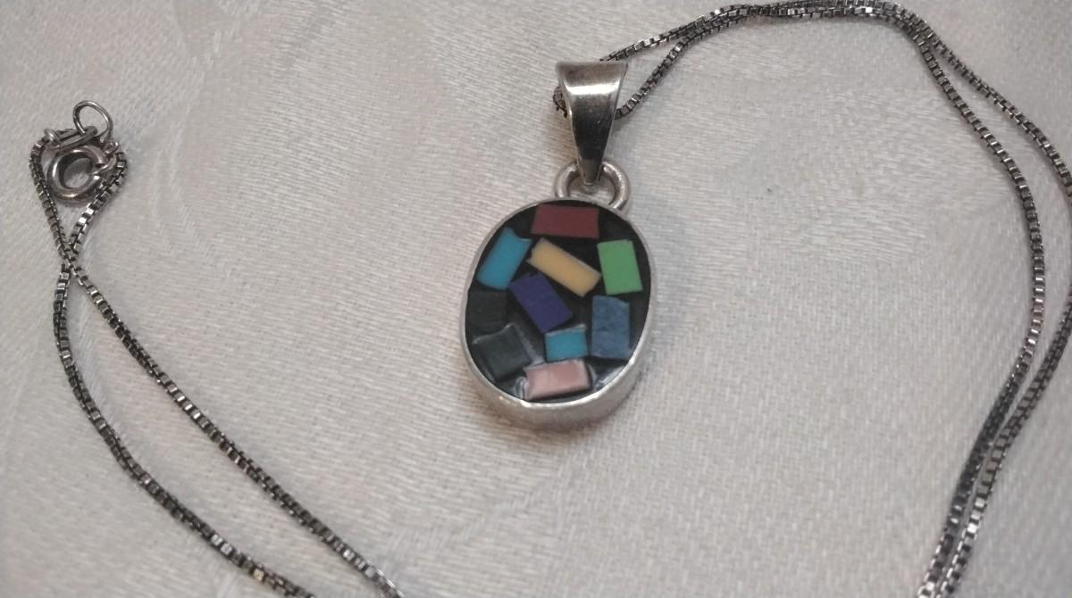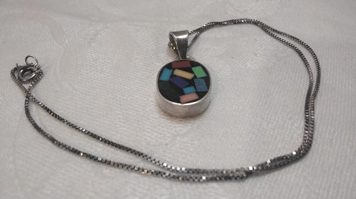 Gemstone Inlay Taxco Silver Pendant 18" Italian Necklace