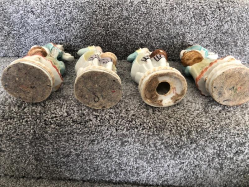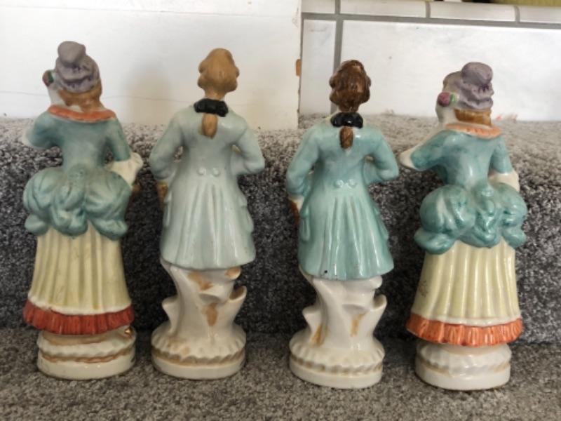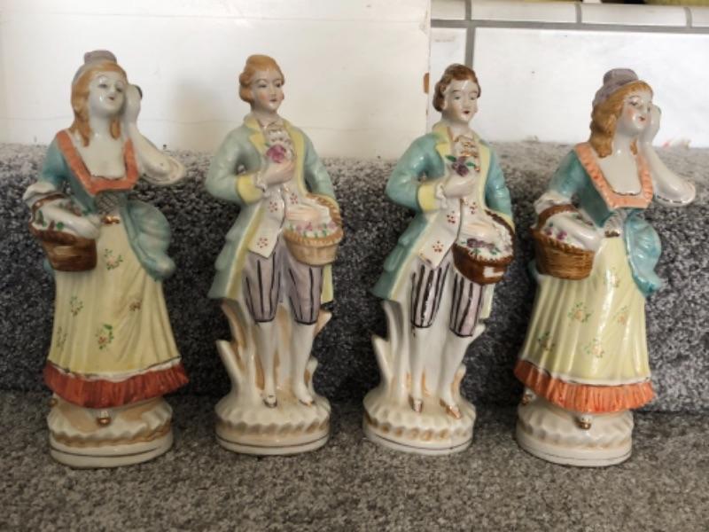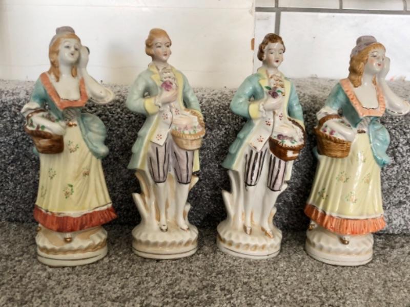 Set of 4 Victorian style men and woman figurines. Matching pairs, just painted a little different. About 8" size. Good condition.
