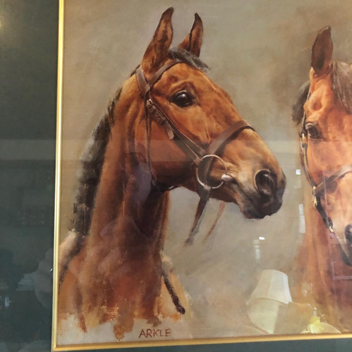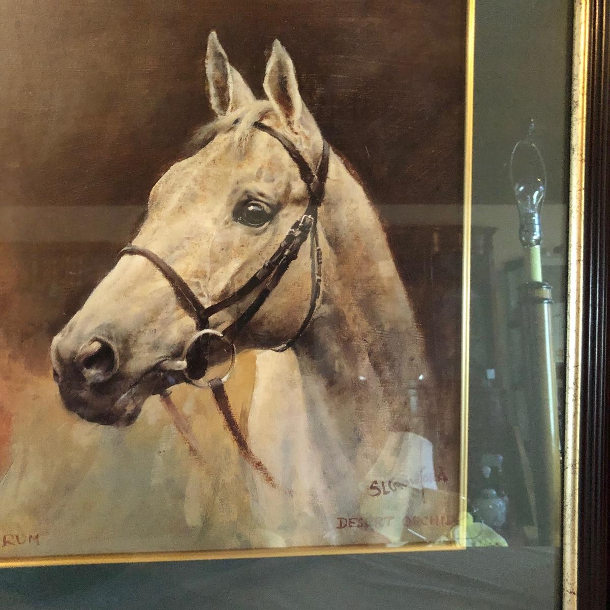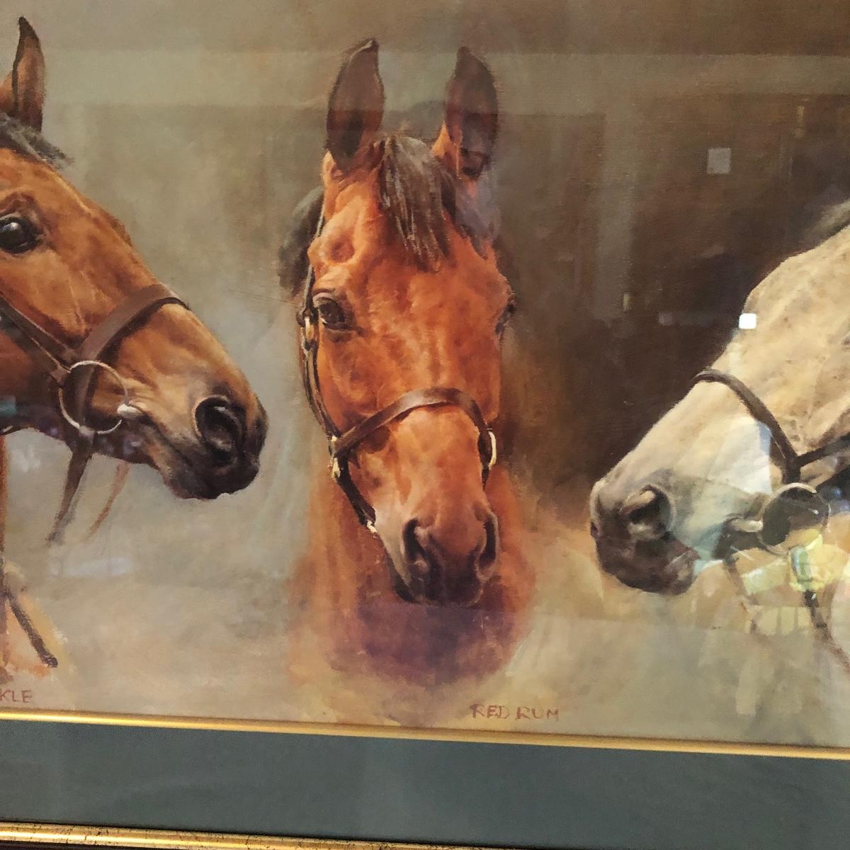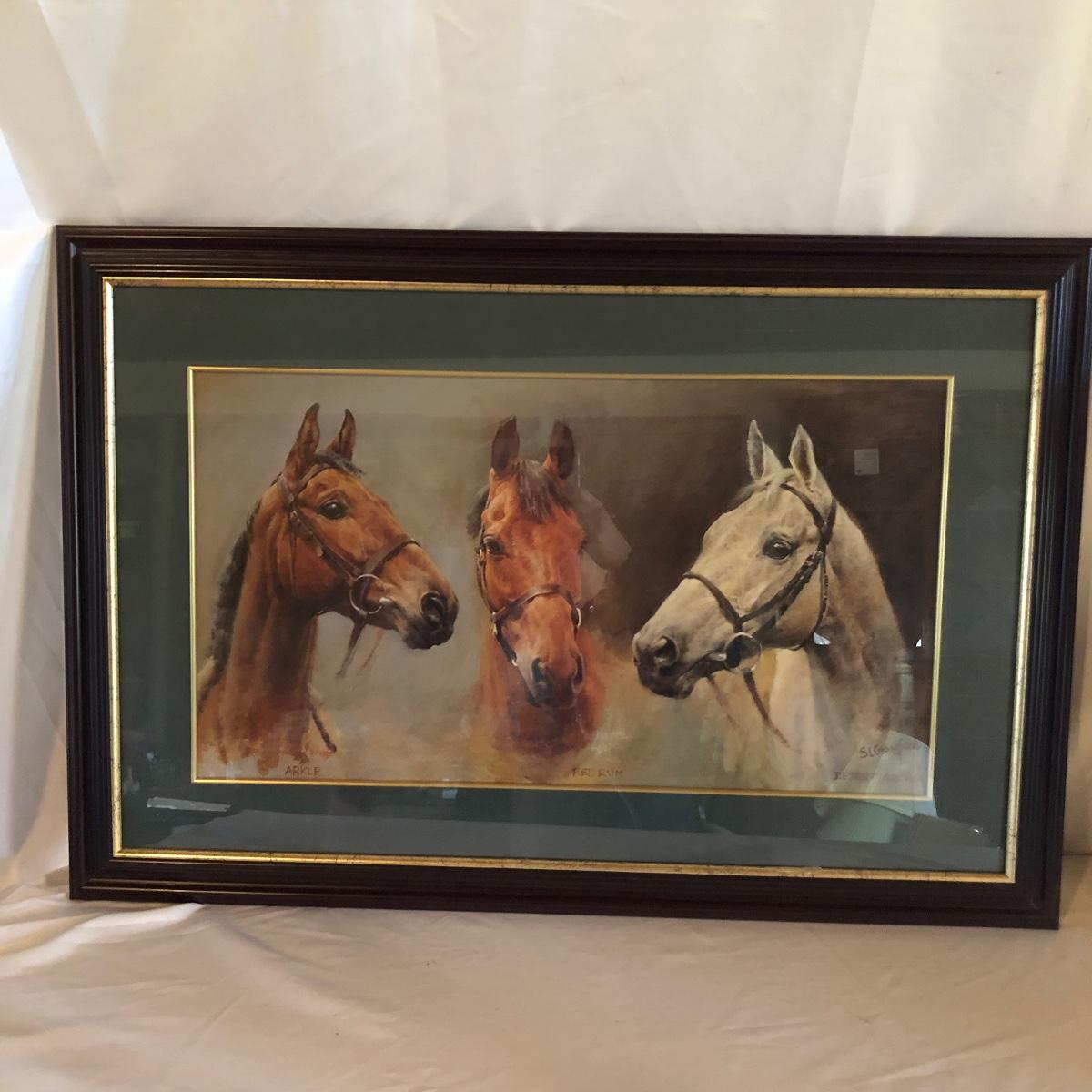 Lot includes a framed and matted print titled “ We Three Kings” with Red Rum, Arkle and Desert Orchid. Print has a signature of SL Crawford that appears to be machine made. Frame measures 22” x 32”.