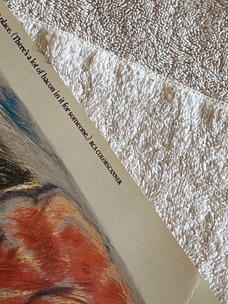 Unlike the similar, larger, "Bank" poster this version was produced to be folded in quarters and inserted in a trade magazine for professional printers. RCA hoped that readers would remove it from the magazine and display it on the wall to promote the new scanner to clientele. However, this example has never been folded. Acquired from the estate of a RCA Executive, this example was apparently hand delivered and never subject to folding. A rare, perhaps singular example.