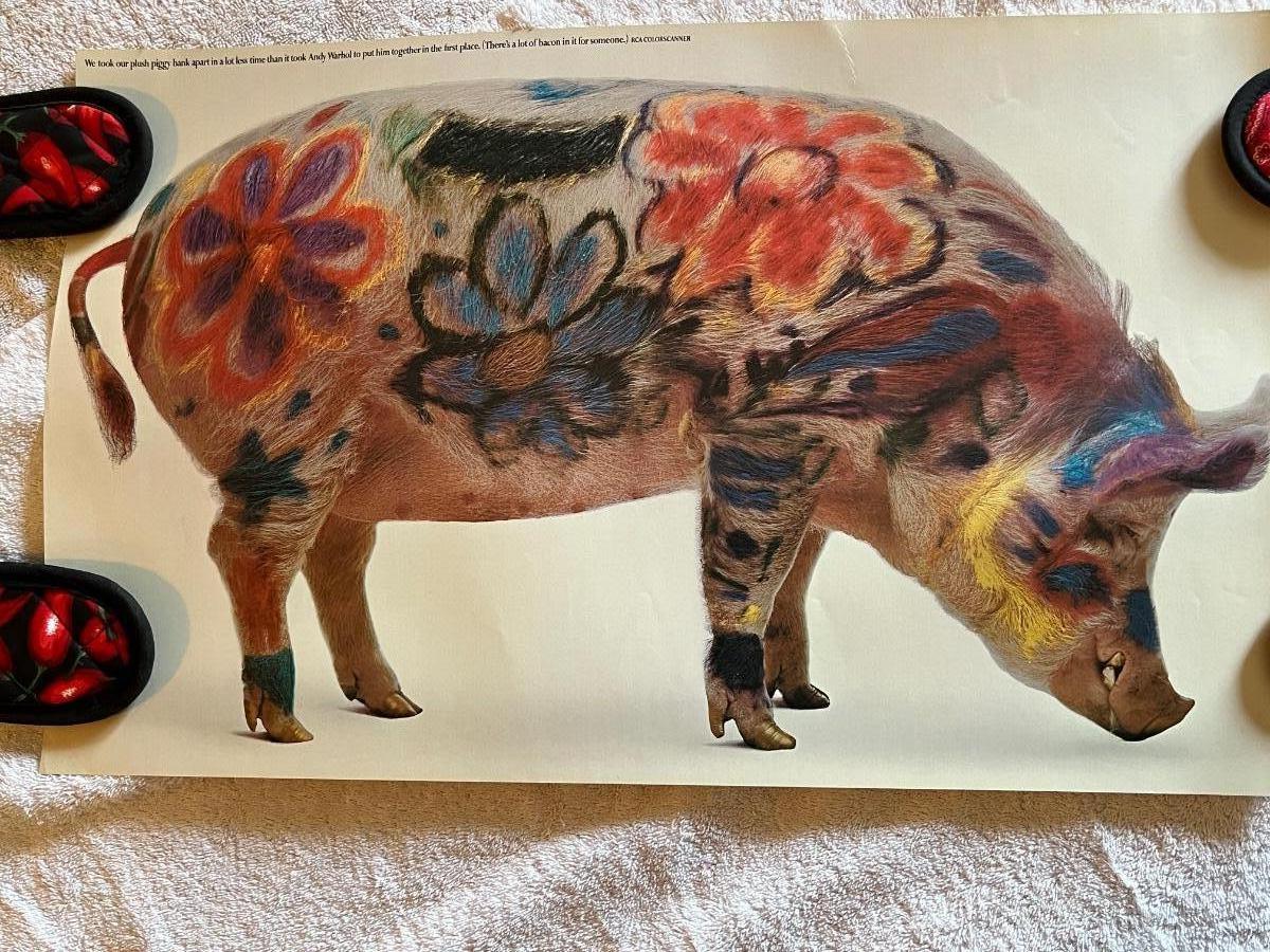 Image size 13 5/8 x 22 1/4 in. (346 x 565 mm) poster with the complete title is "We Took Our Plush Piggy Bank Apart in a Lot Less Time Than It Took Andy Warhol to Put Him Together in the First Place (There's a Lot of Bacon in It for Someone). RCA ColorScanner." Literature/catalogue raisonne: Paul Marechal, "Andy Warhol: The Complete Commissioned Posters, 1964-1987," #8.