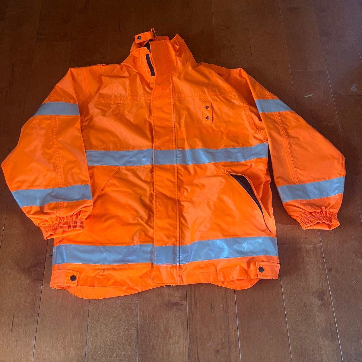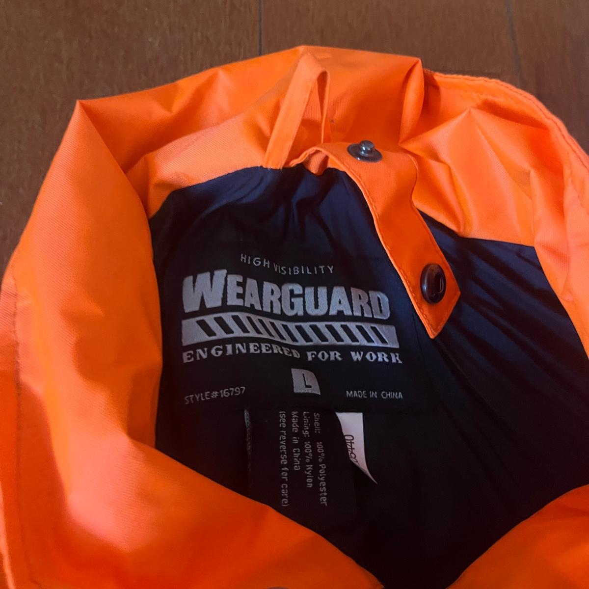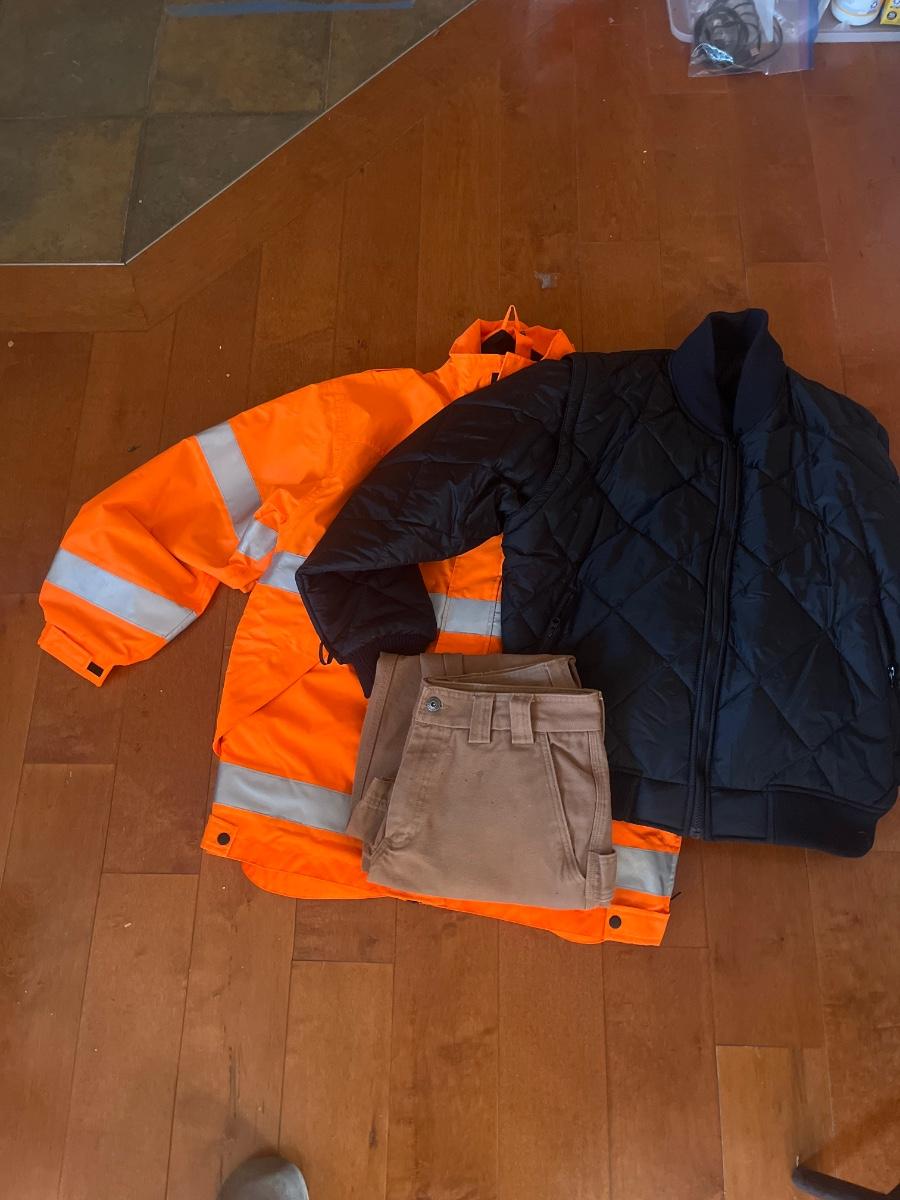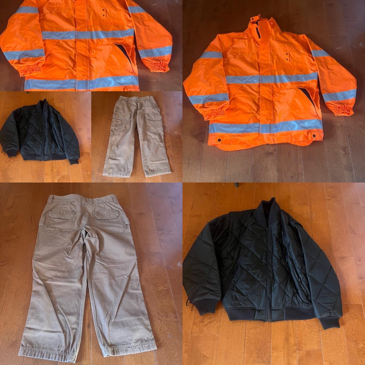 Lot includes a Wearguard high visibility jacket and a Wearguard quilted black jacket both size large. Also includes a pair of Duluth work pants size 34 x 28.