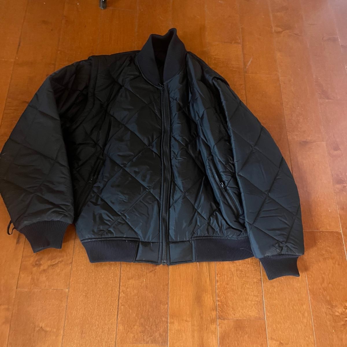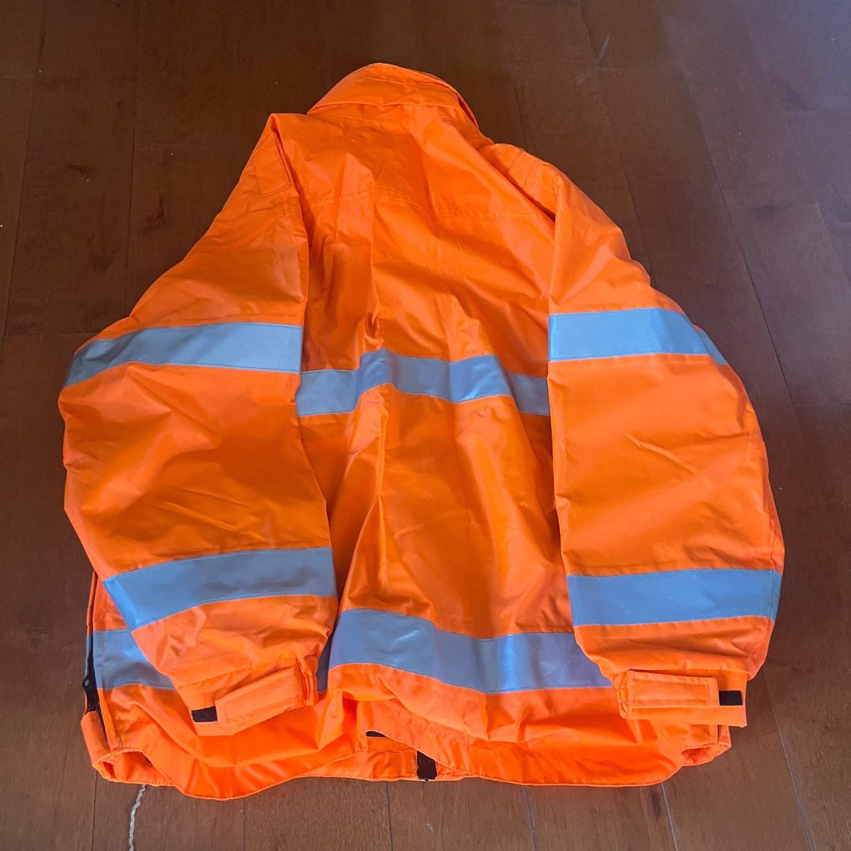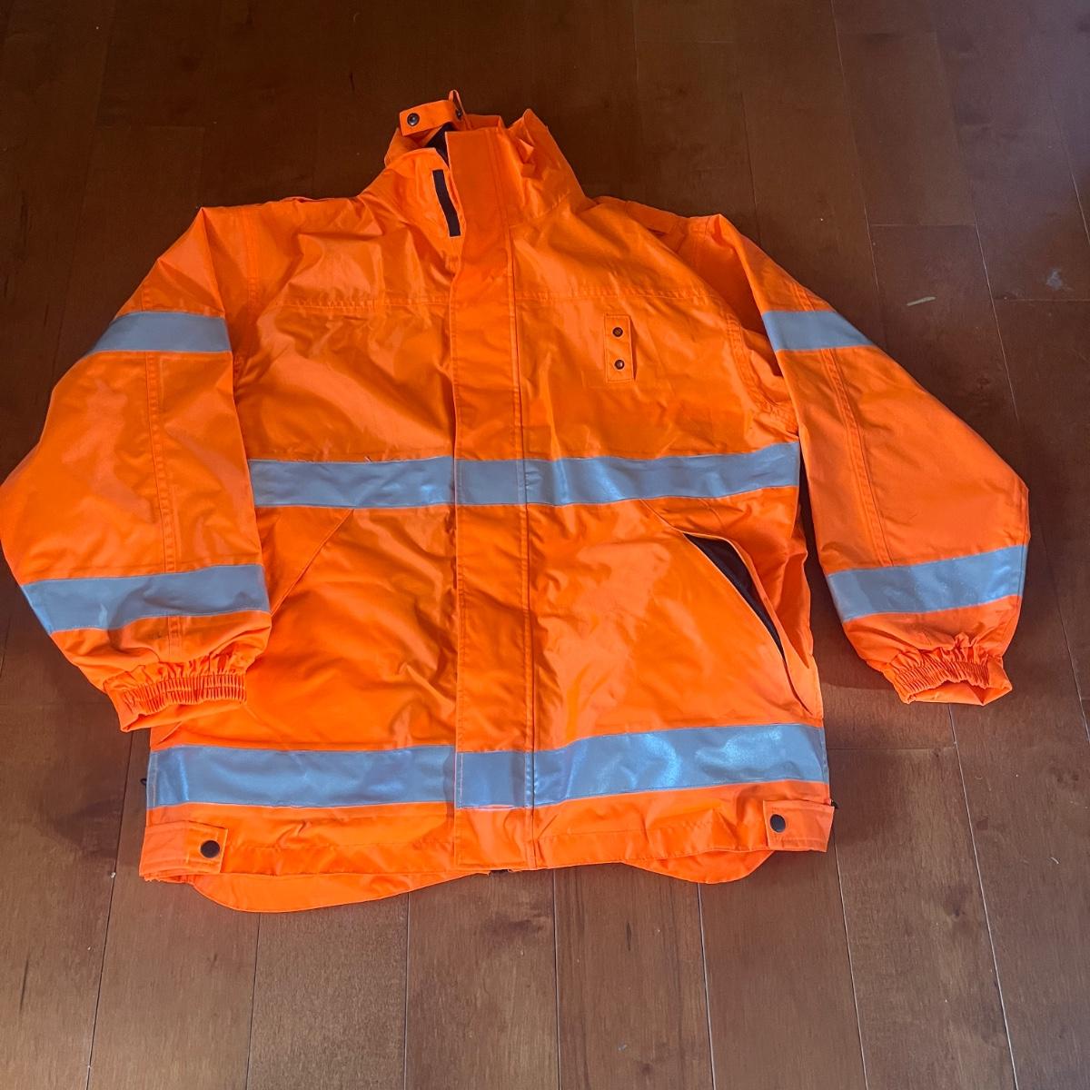 Lot includes a Wearguard high visibility jacket and a Wearguard quilted black jacket both size large. Also includes a pair of Duluth work pants size 34 x 28.