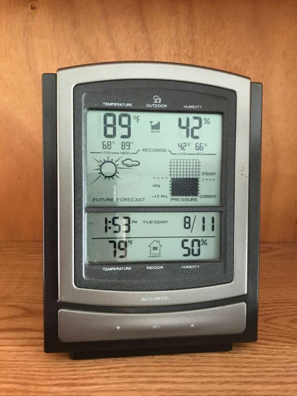 Digital indoor/outdoor Weather Tracker Clock. Displays temperature, time, and date.
