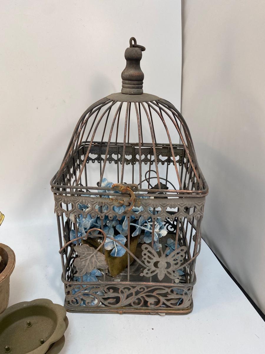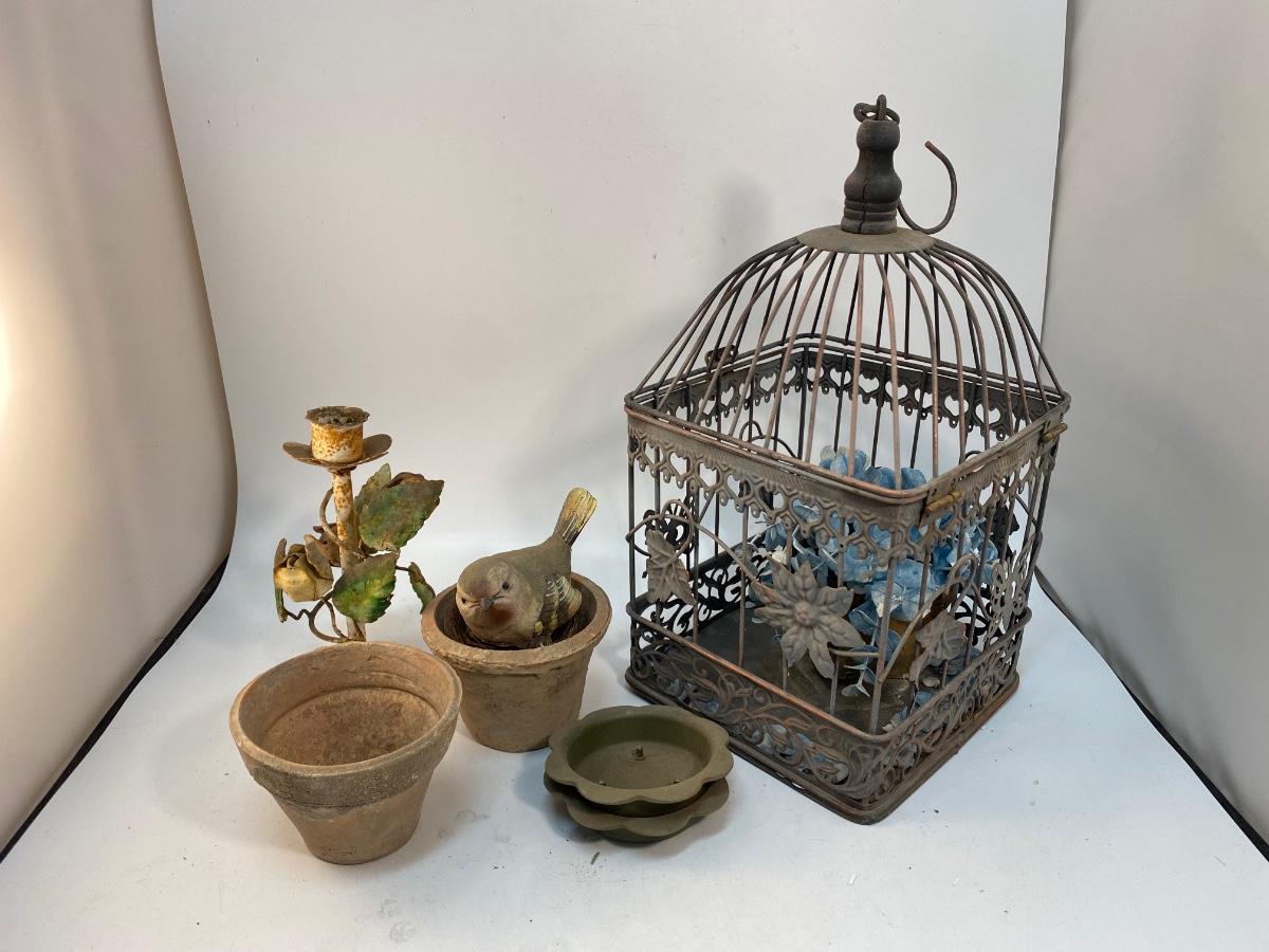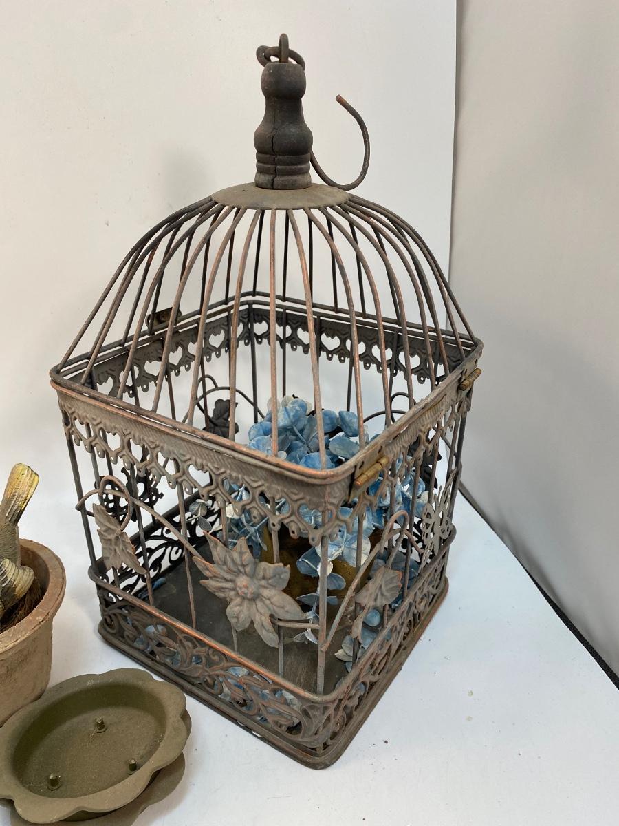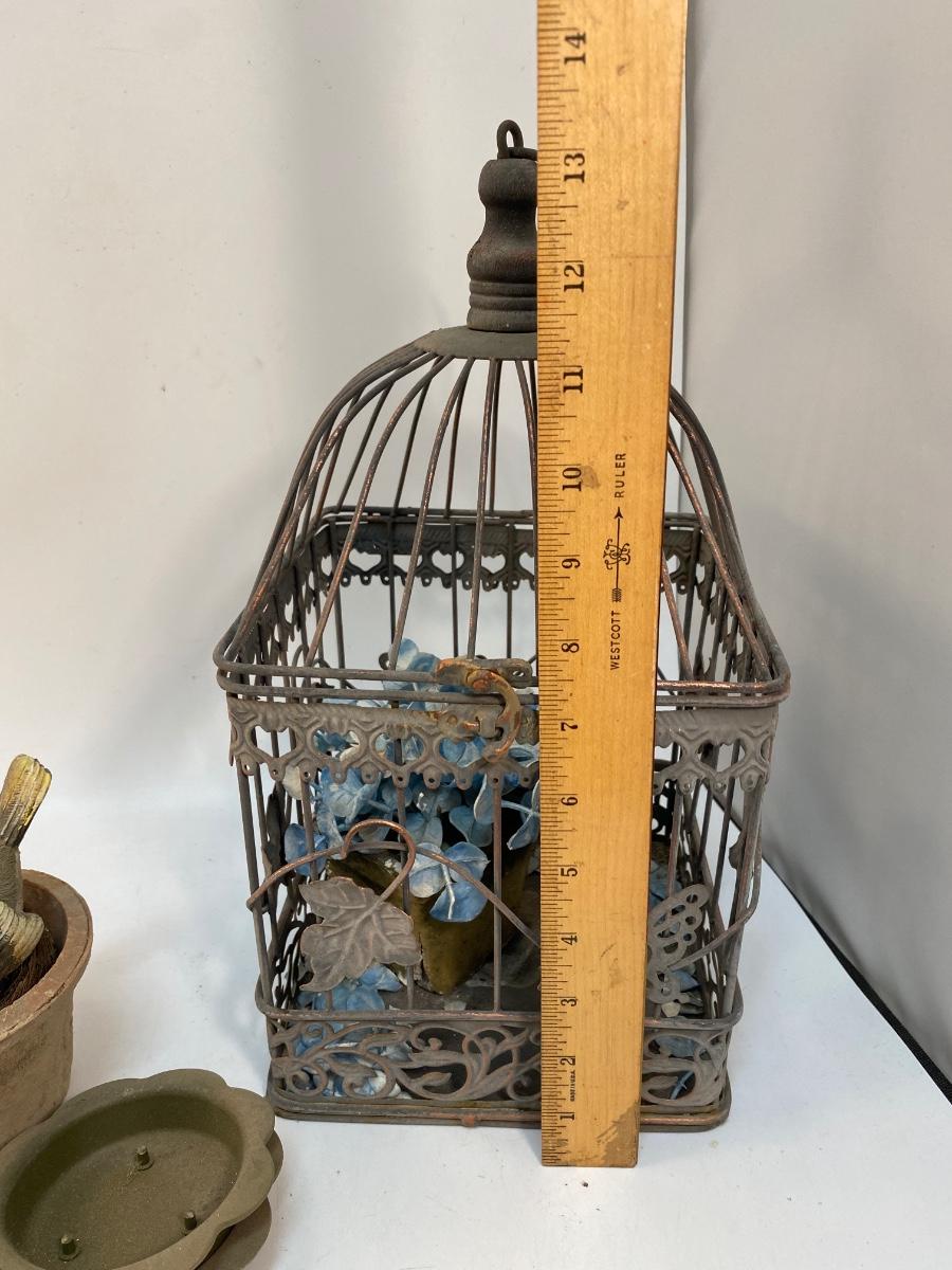 Weathered Birdcage Pots Garden Yard Art Shabby Chic Cottagecore Decor. Everything is in weathered condition but display nice. The fake plant in birdcage is brittle.