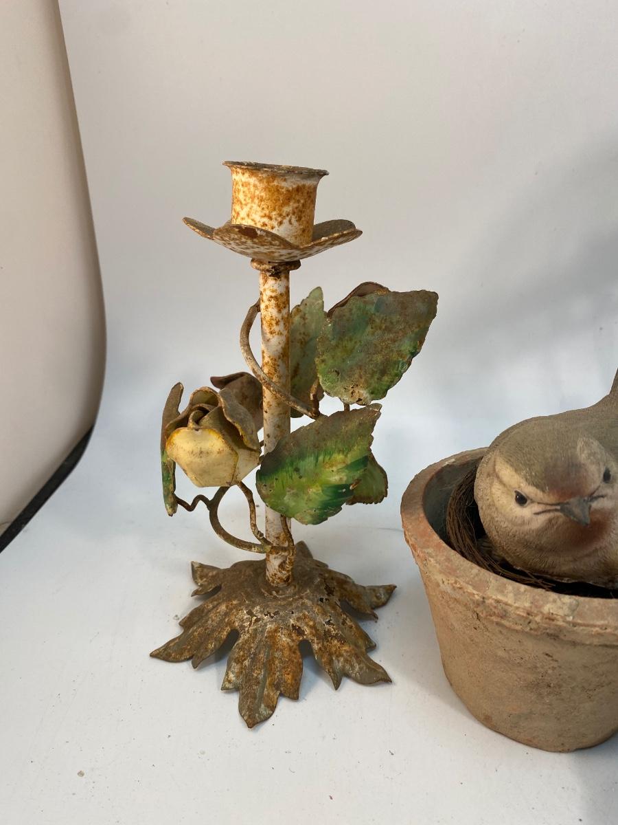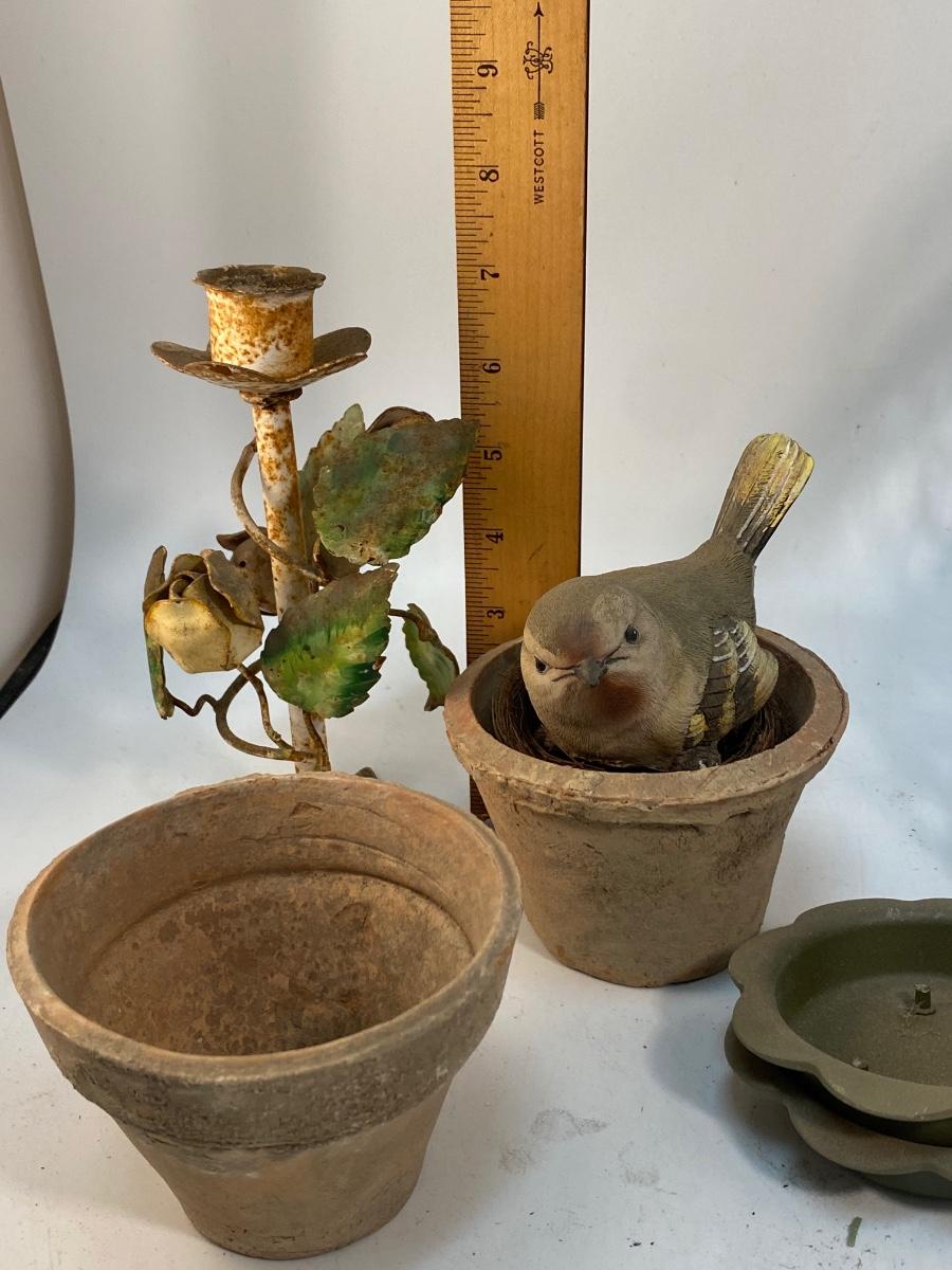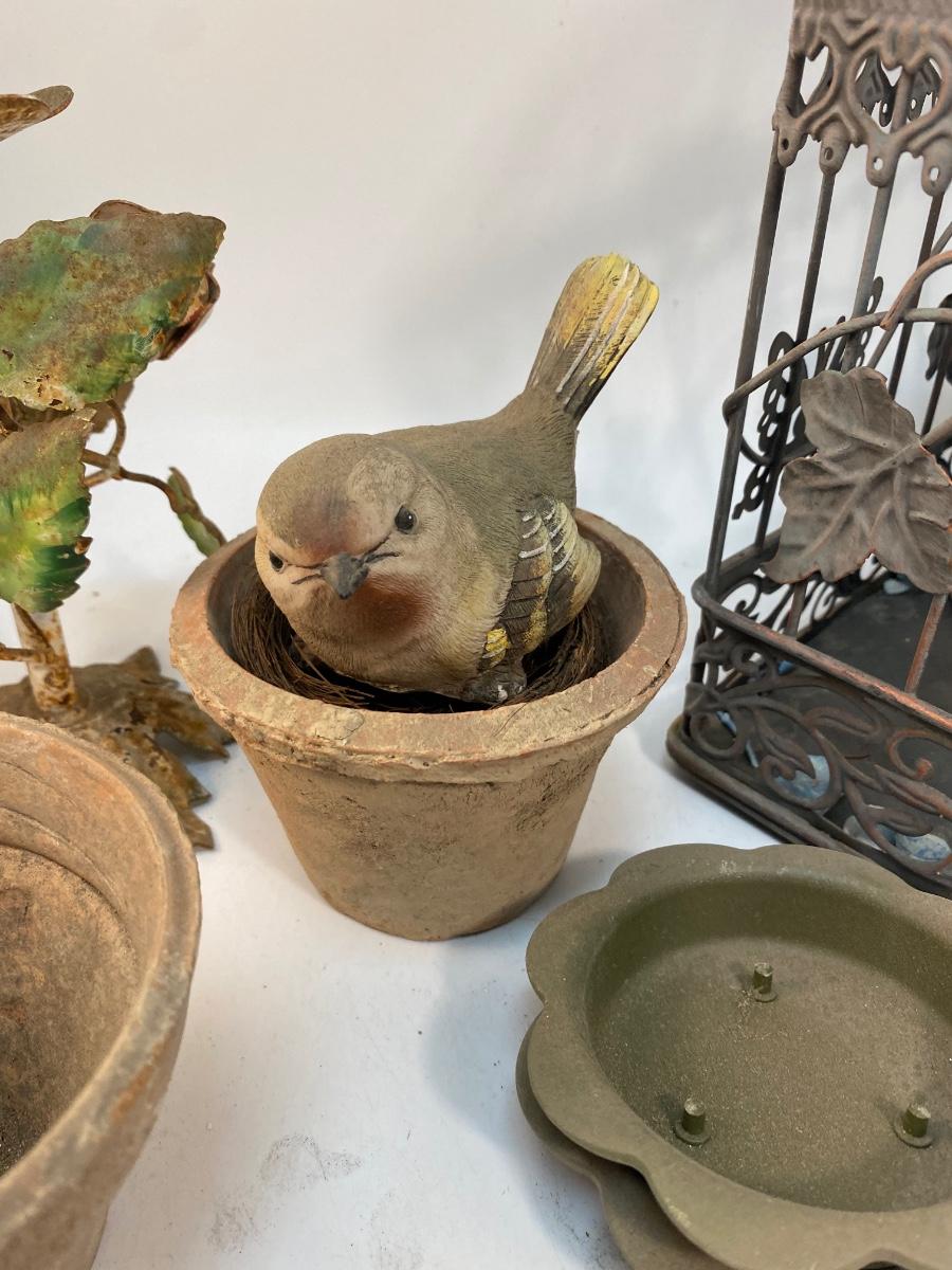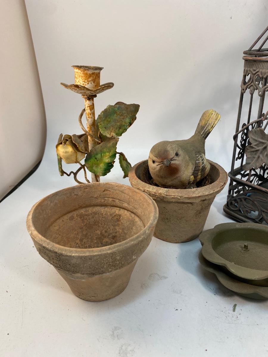 Weathered Birdcage Pots Garden Yard Art Shabby Chic Cottagecore Decor. Everything is in weathered condition but display nice. The fake plant in birdcage is brittle.