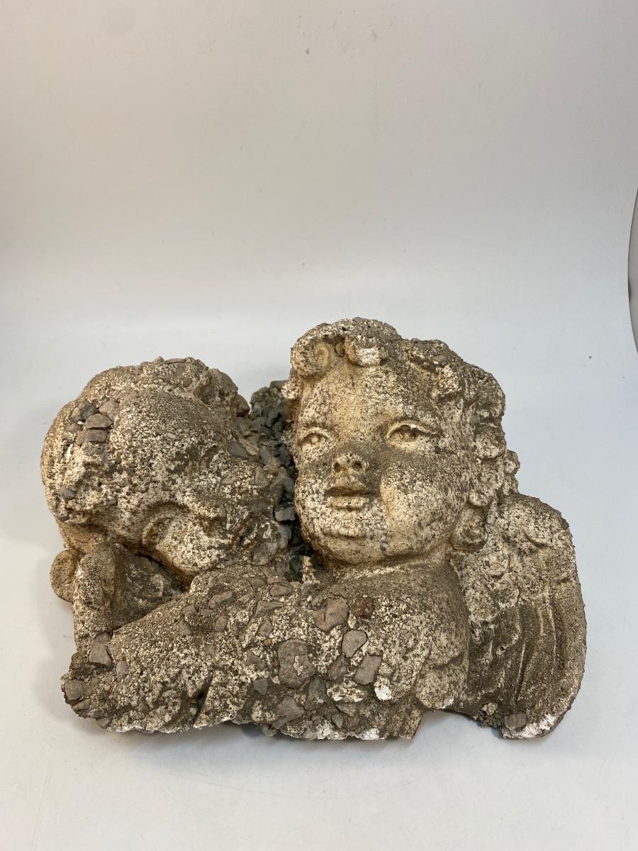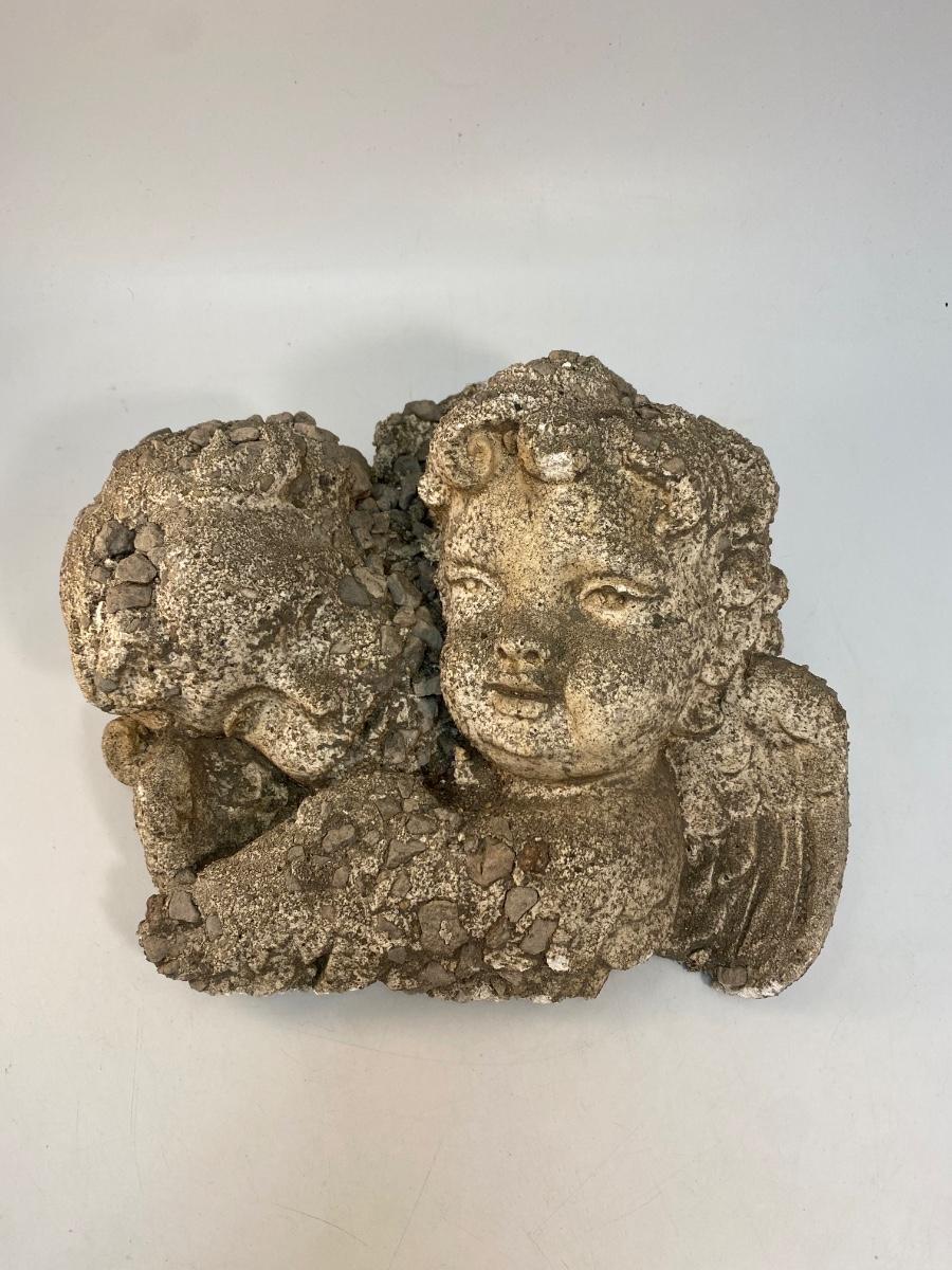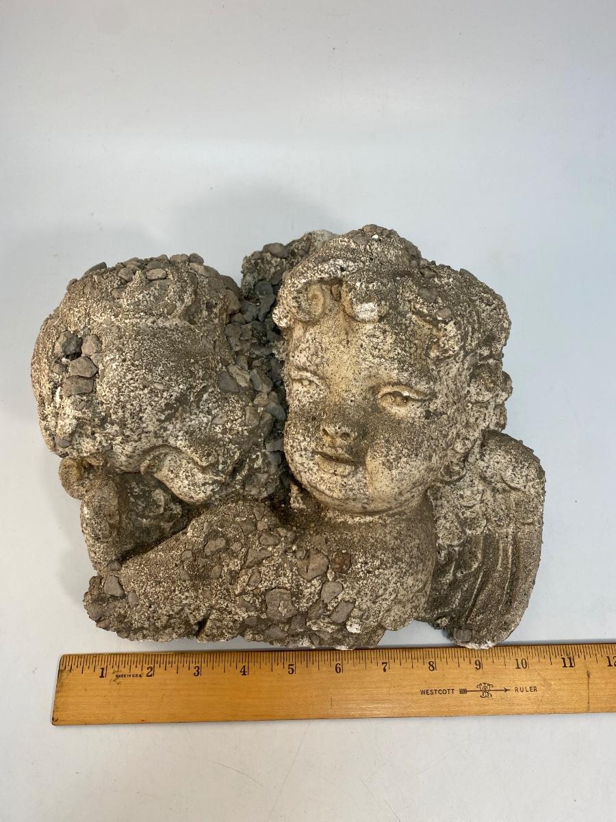 Weathered Concrete Stone Angel Cherub Garden Yard Art. Heavy. Nicely weathered. Does have a hook for hanging. About 11" size.