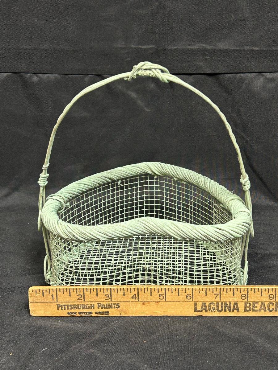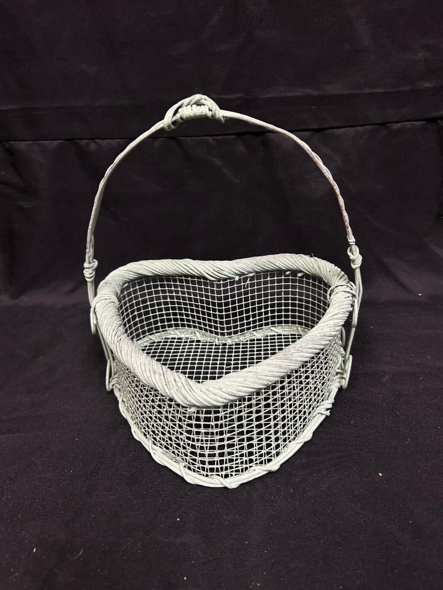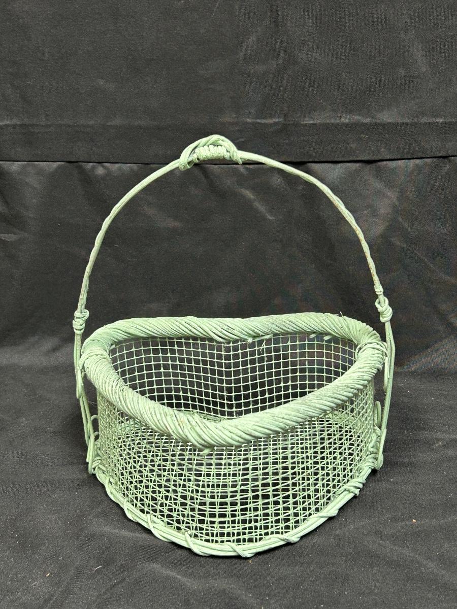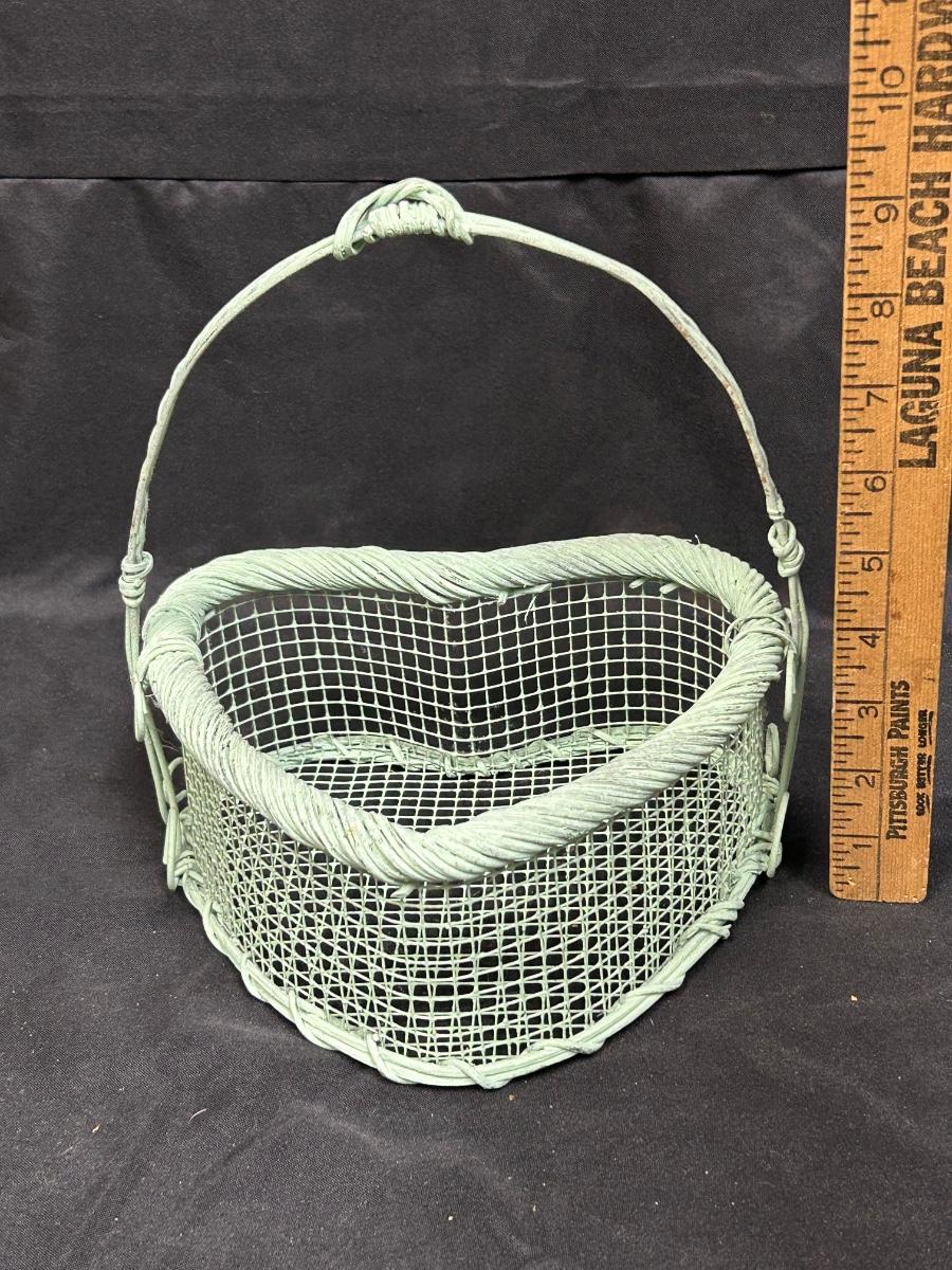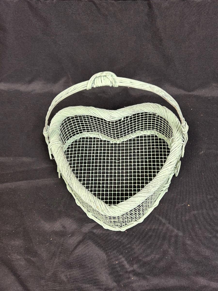 Weathered Cottasgecore Shabby Chic Mint Green Heart Shaped Basket. In good condition. Great for repurposing and display.