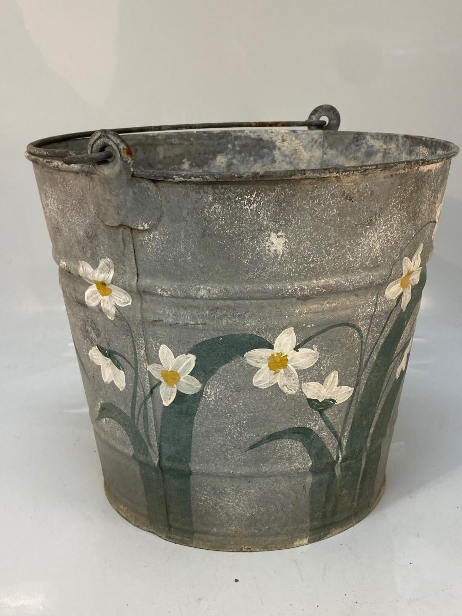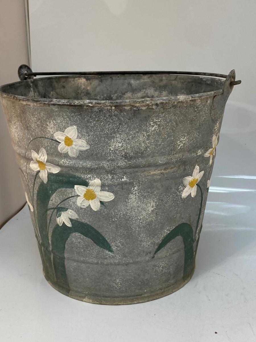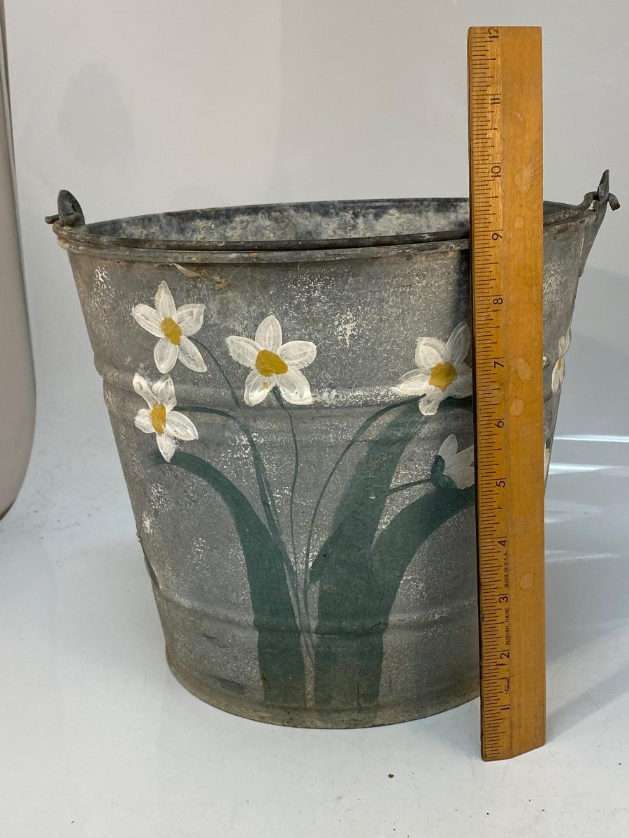 Weathered Galvanized Metal Water Pail with White Painted Daisy Flower Design. In good, weathered condition.