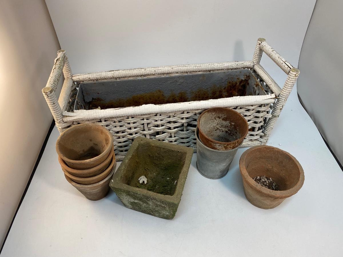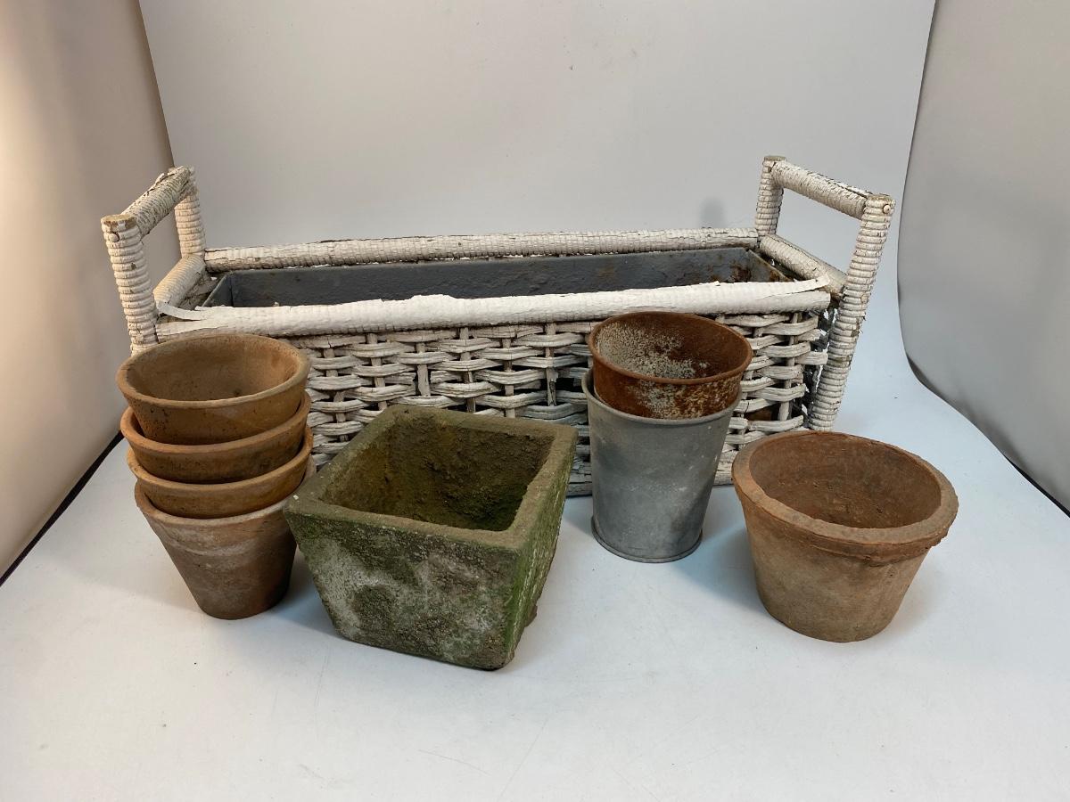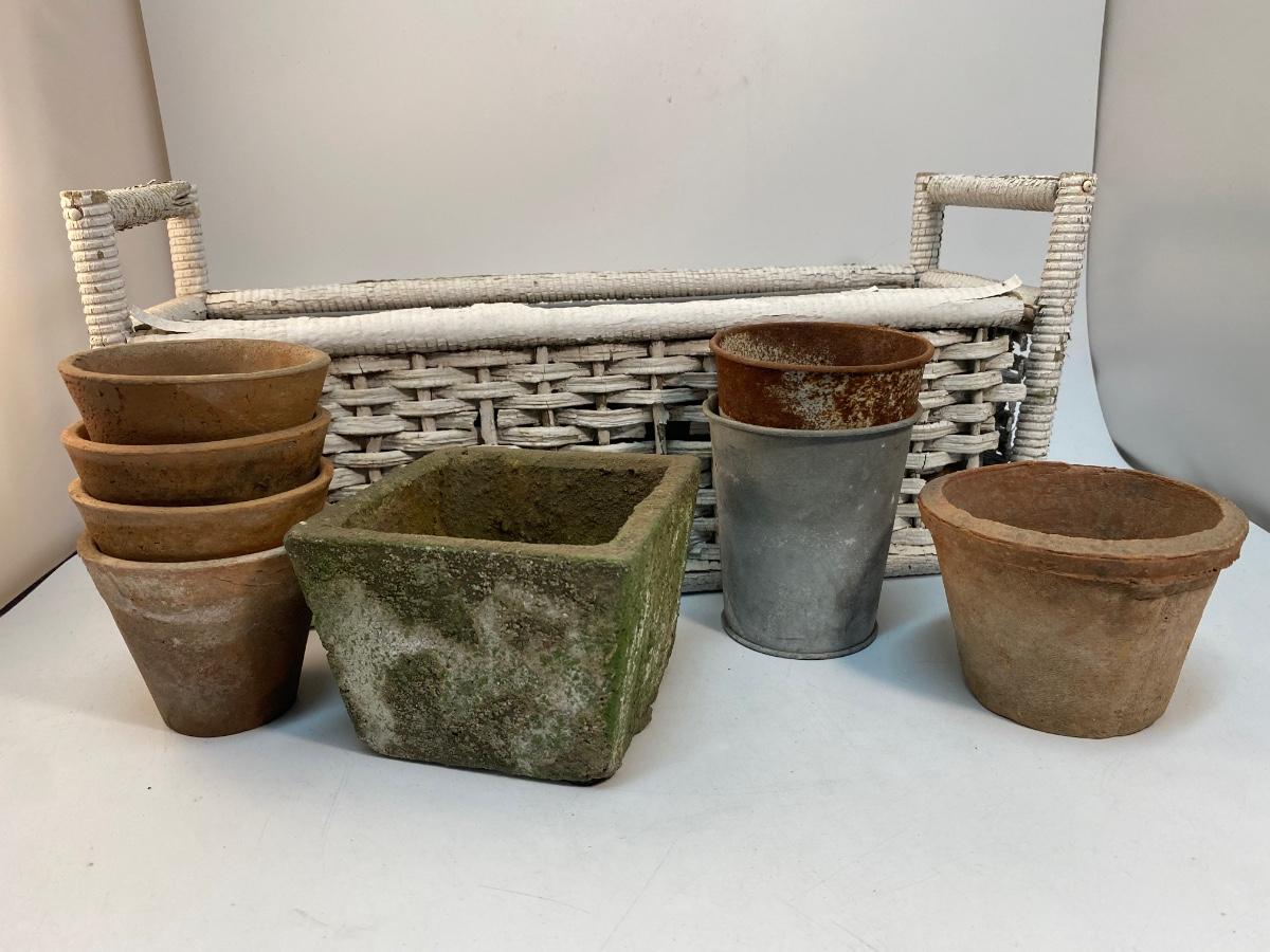 Weathered Small Planter Pots and Wicker Basket Garden Yard Patio Decor Lot. Everything is weathered from being outside but in useable condition.