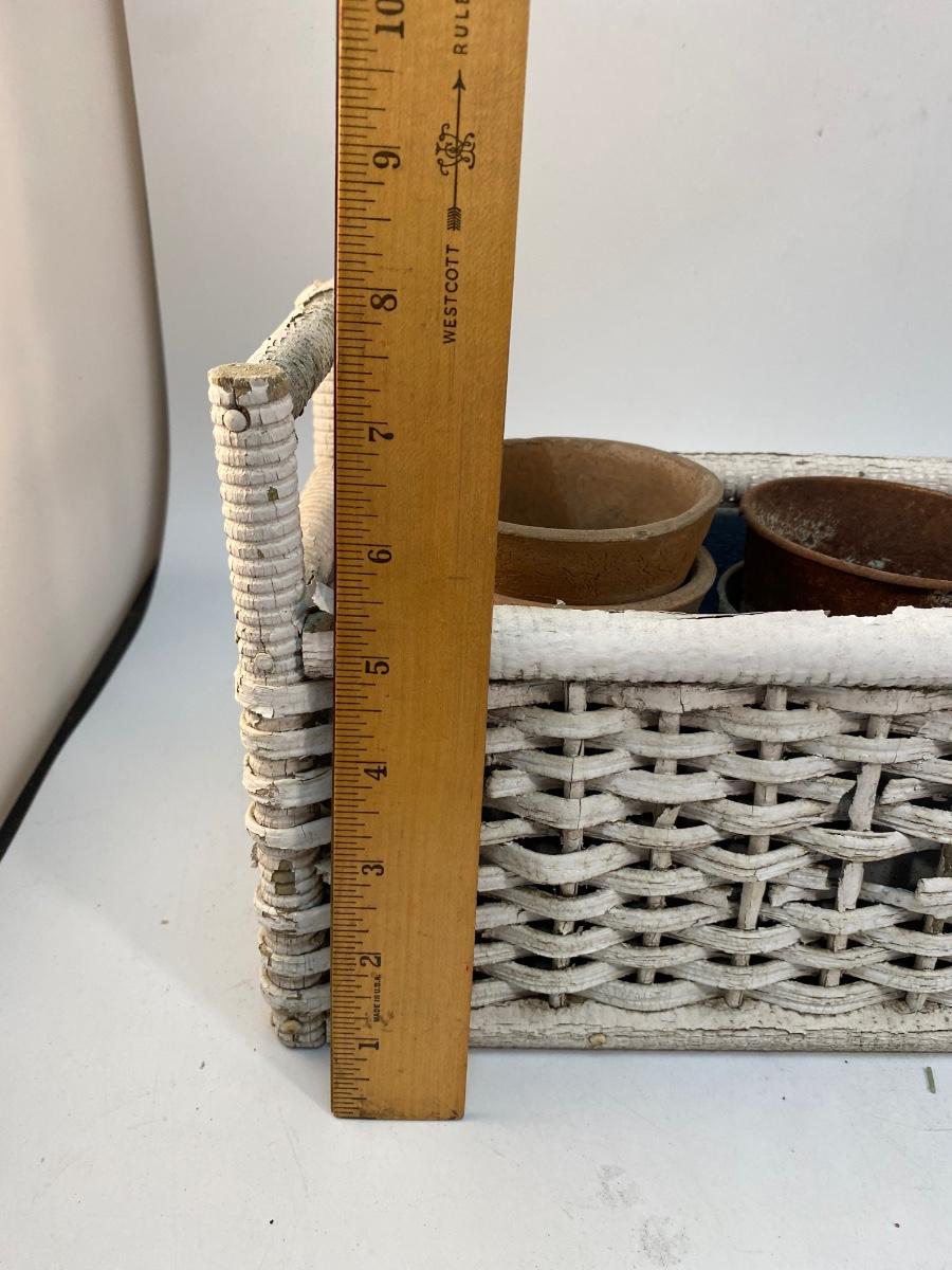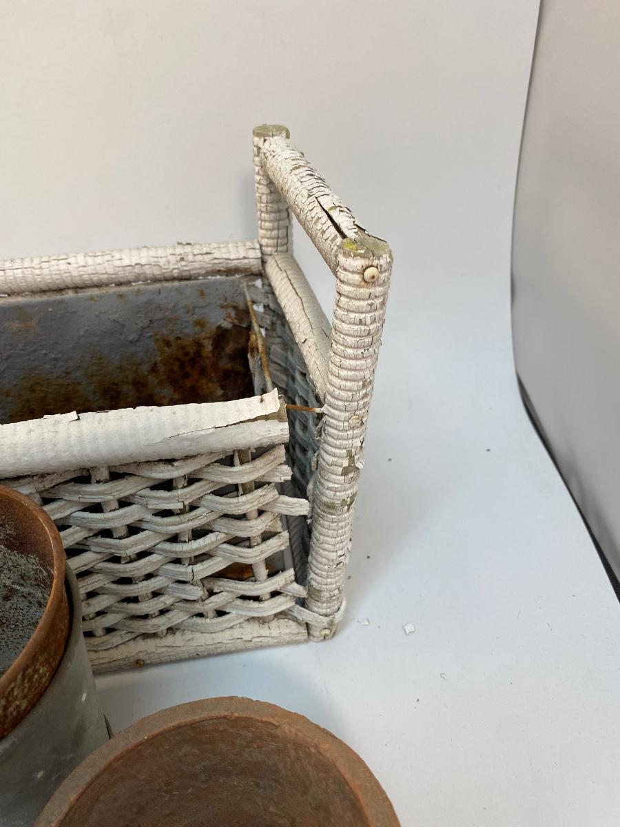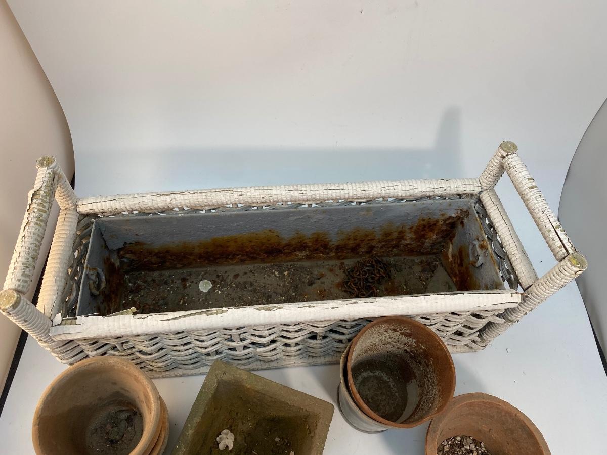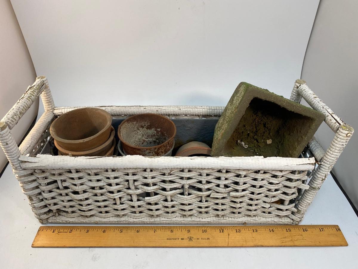 Weathered Small Planter Pots and Wicker Basket Garden Yard Patio Decor Lot. Everything is weathered from being outside but in useable condition.
