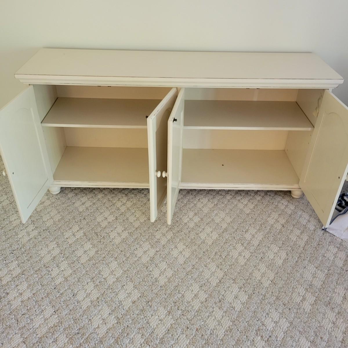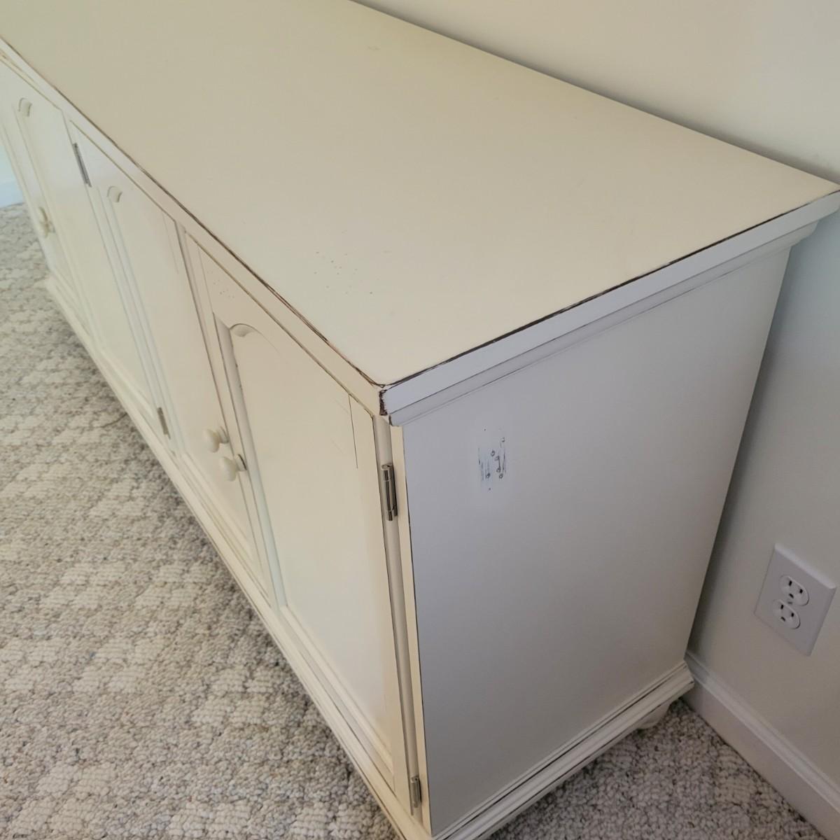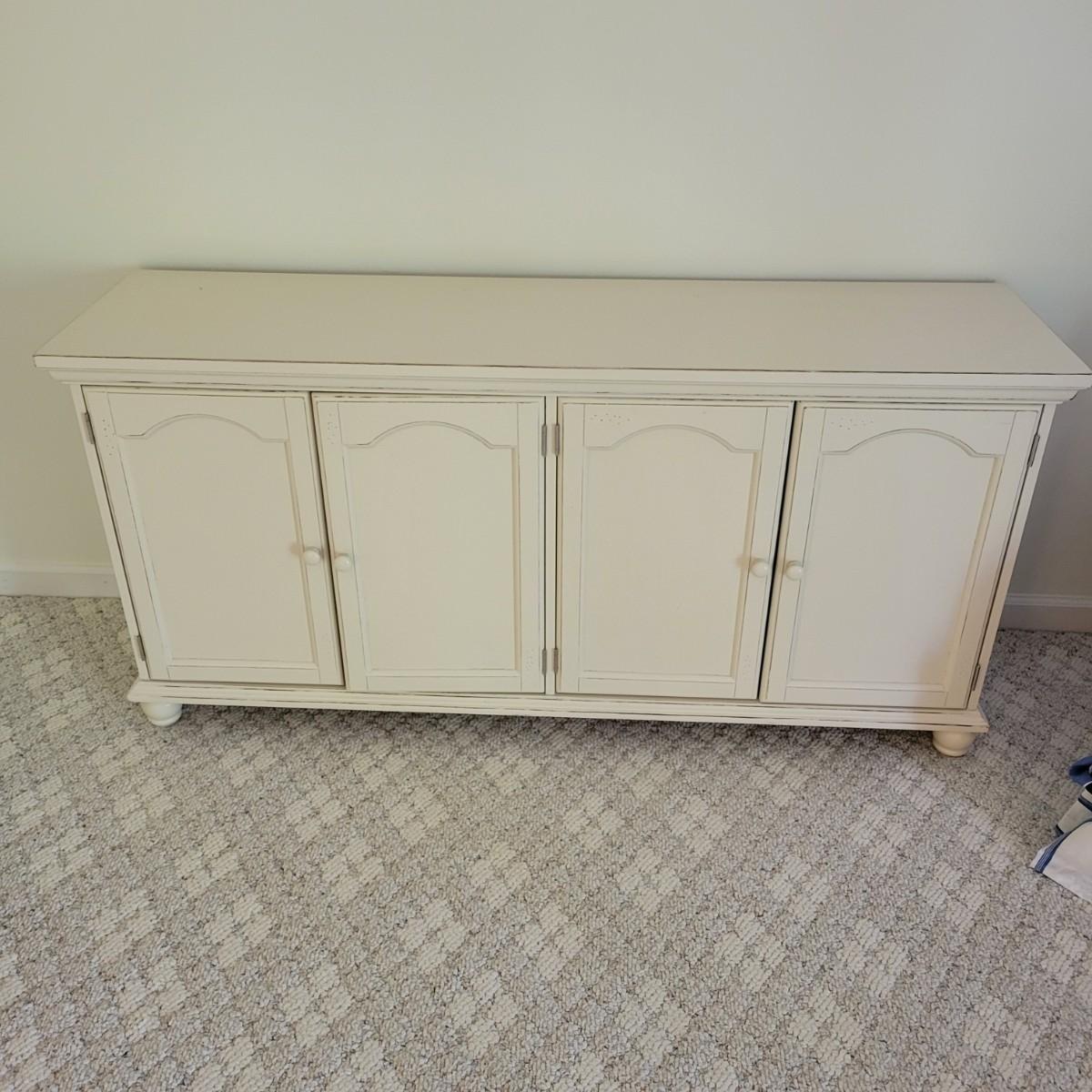A rustic white cabinet with four doors that has been intentionally distressed. Measures approximately 60" x 16" x 29"H. Local pickup only. Winning bidder must bring assistance to help move and load this item due to its weight and/or size.