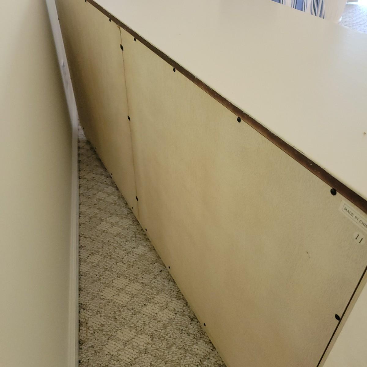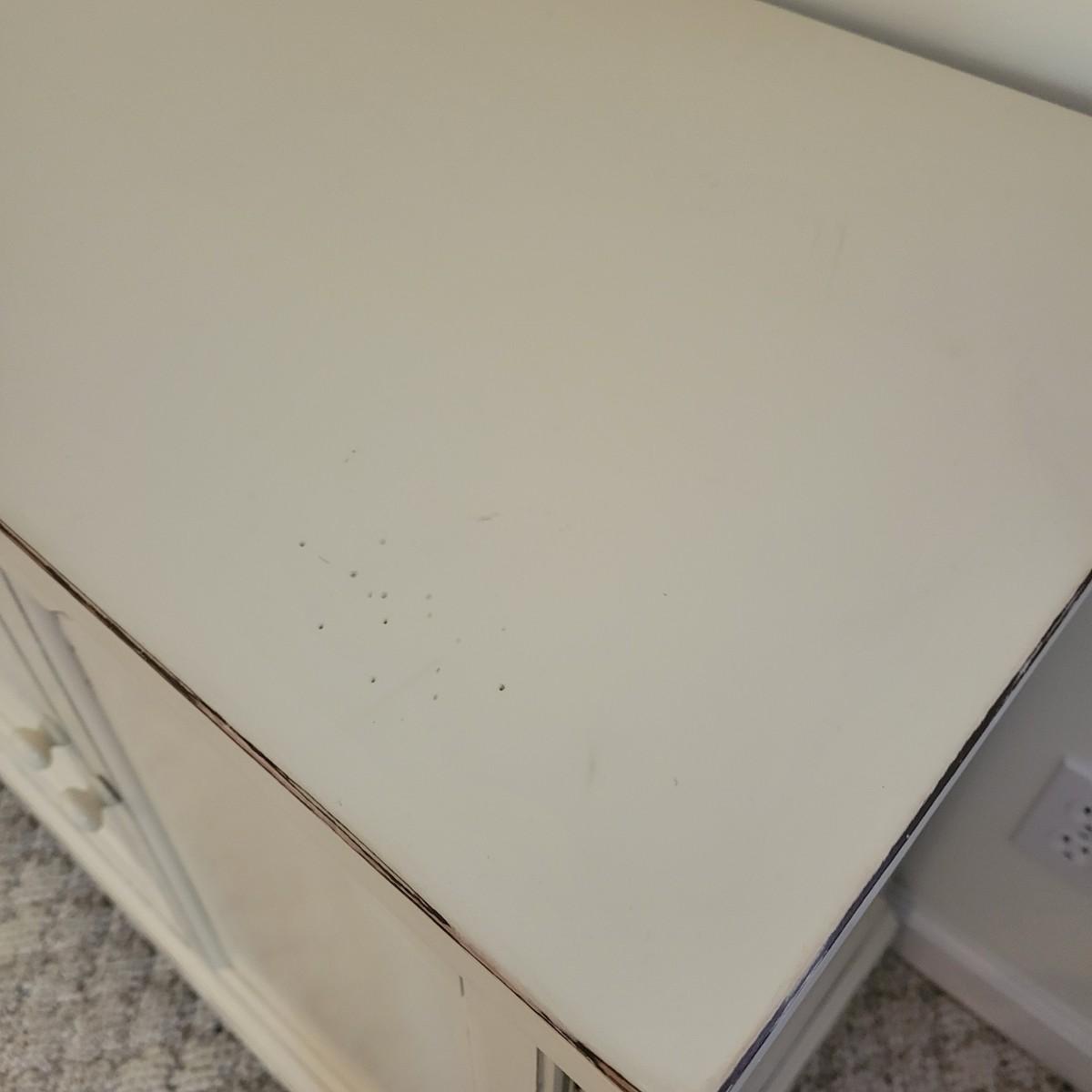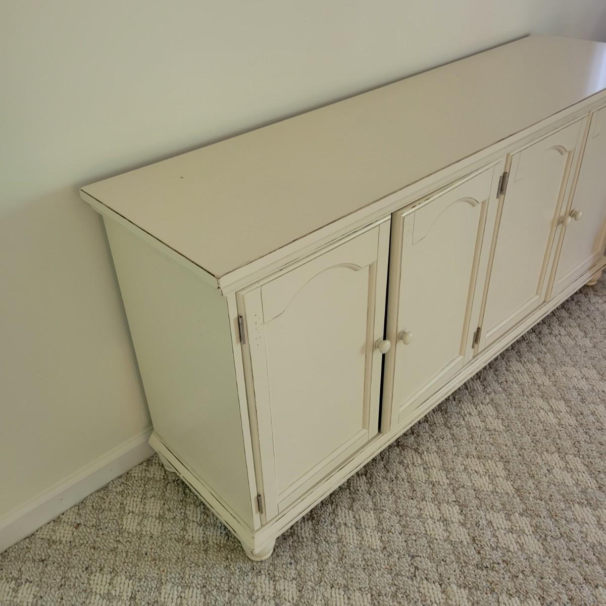 A rustic white cabinet with four doors that has been intentionally distressed. Measures approximately 60" x 16" x 29"H. Local pickup only. Winning bidder must bring assistance to help move and load this item due to its weight and/or size.