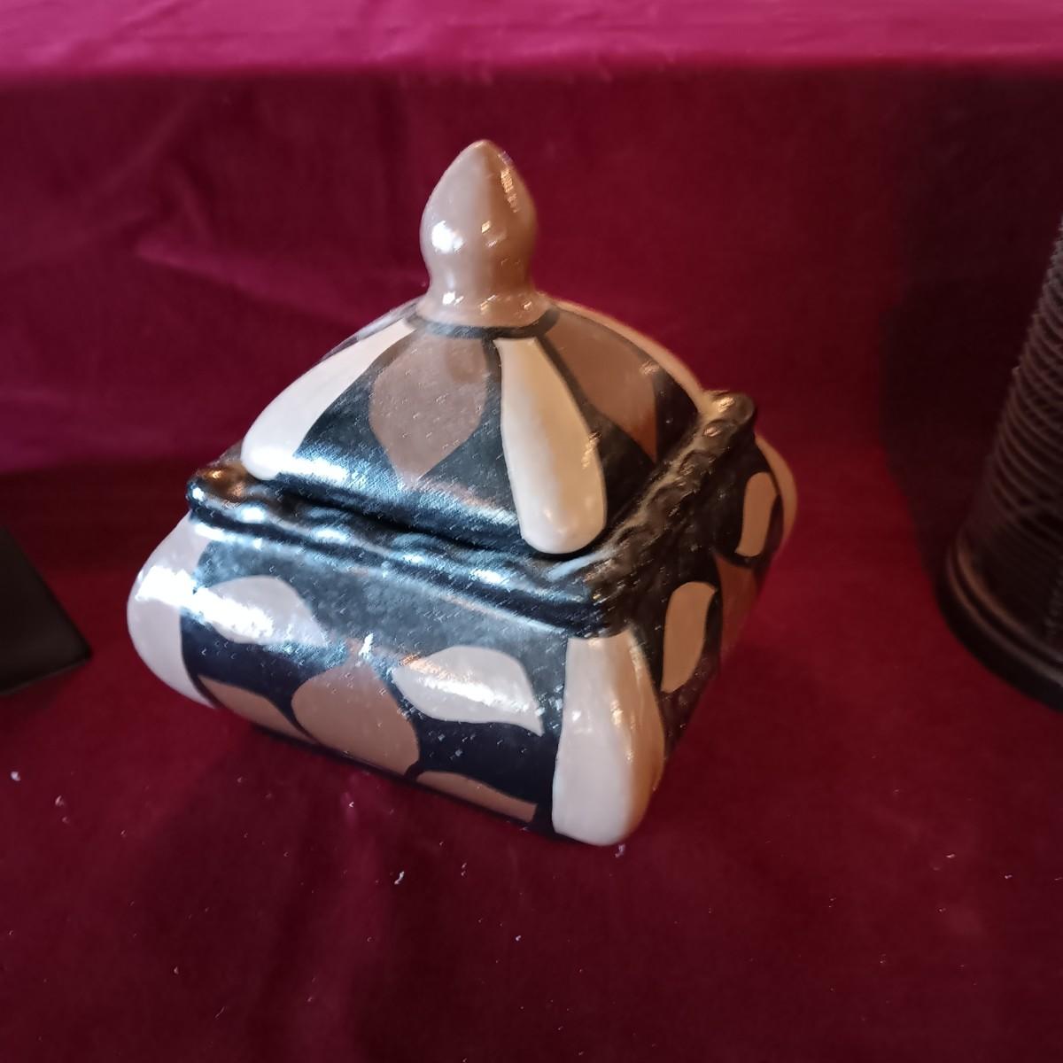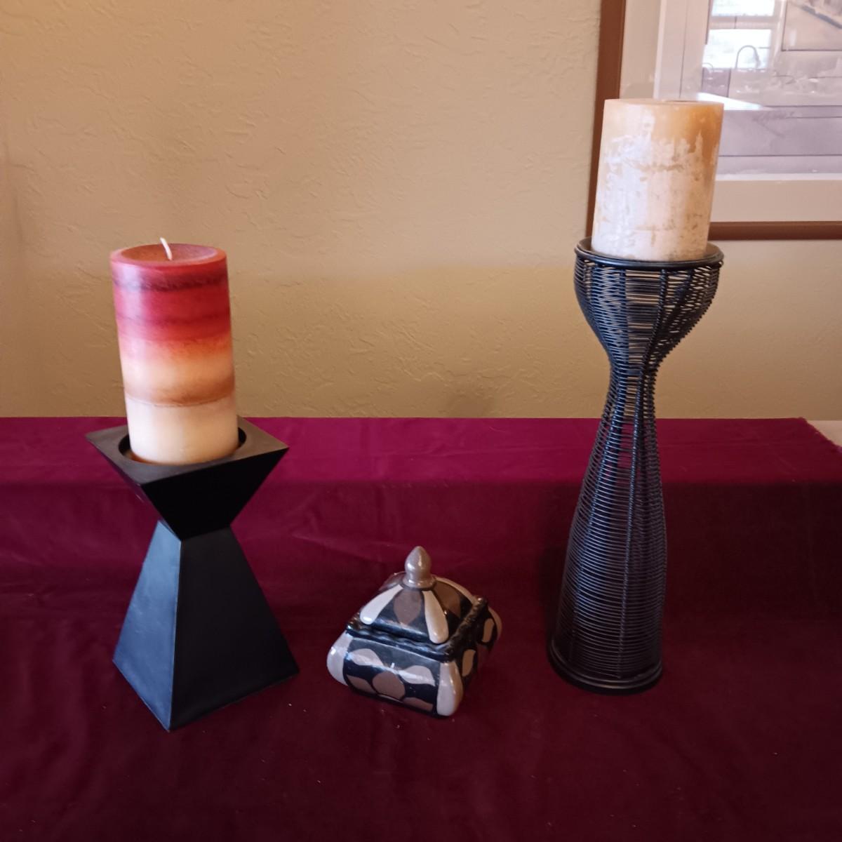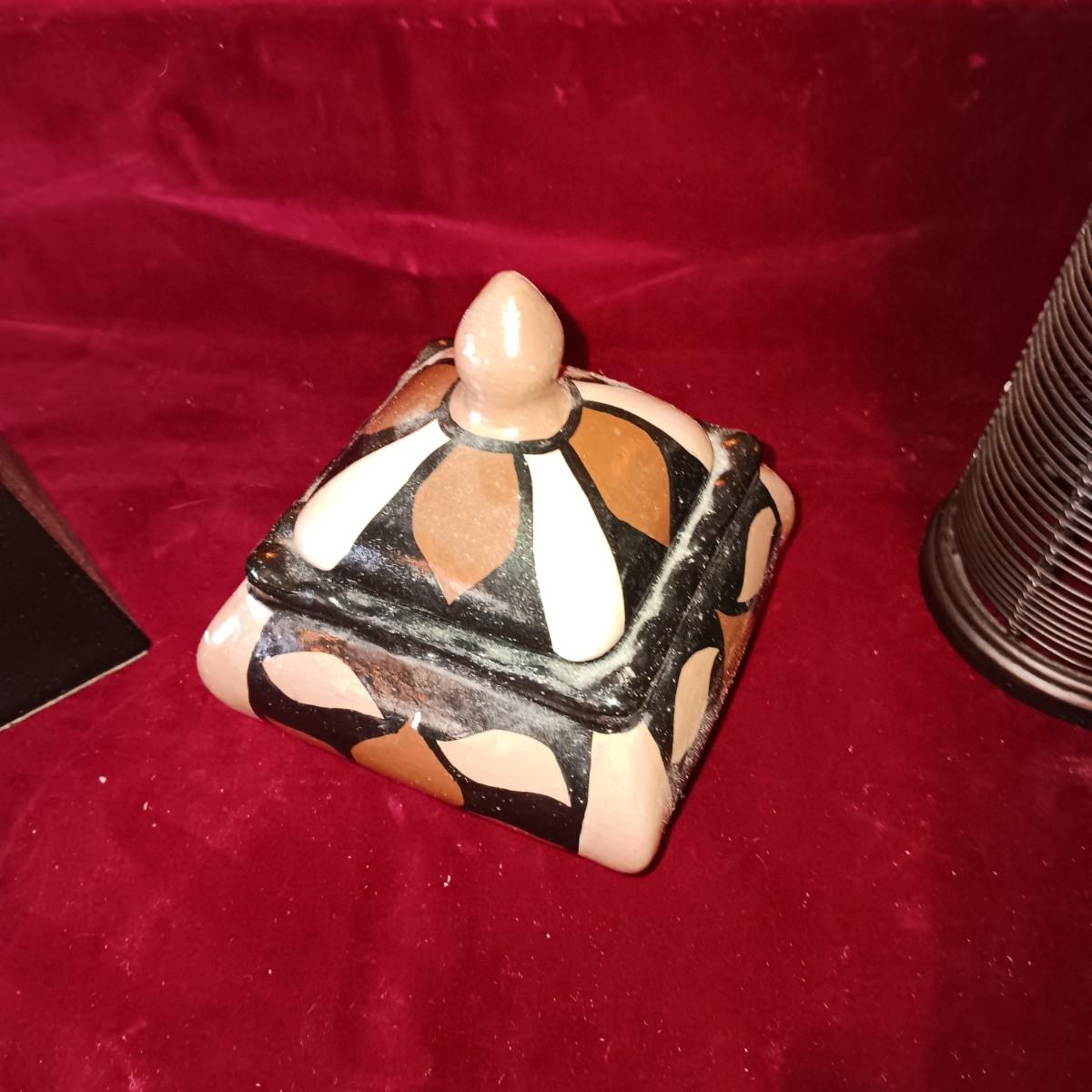 WEAVED METAL AND CERAMIC CANDLE HOLDERS PLUS CLAY TRINKET BOX