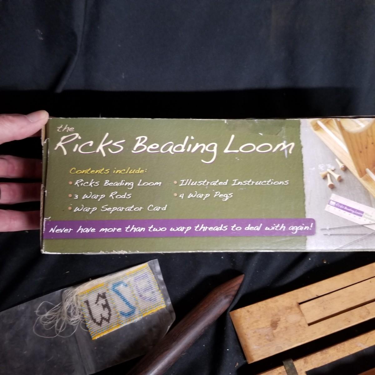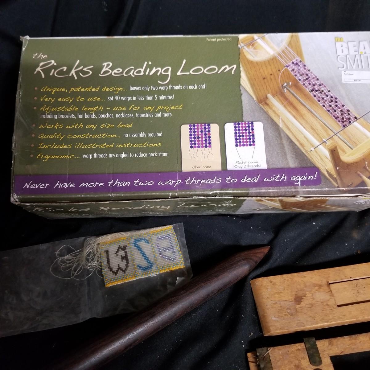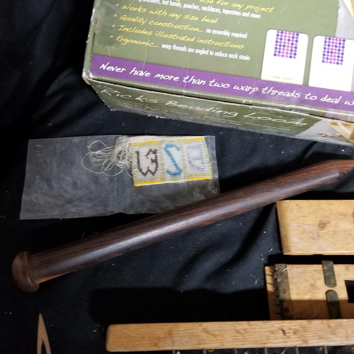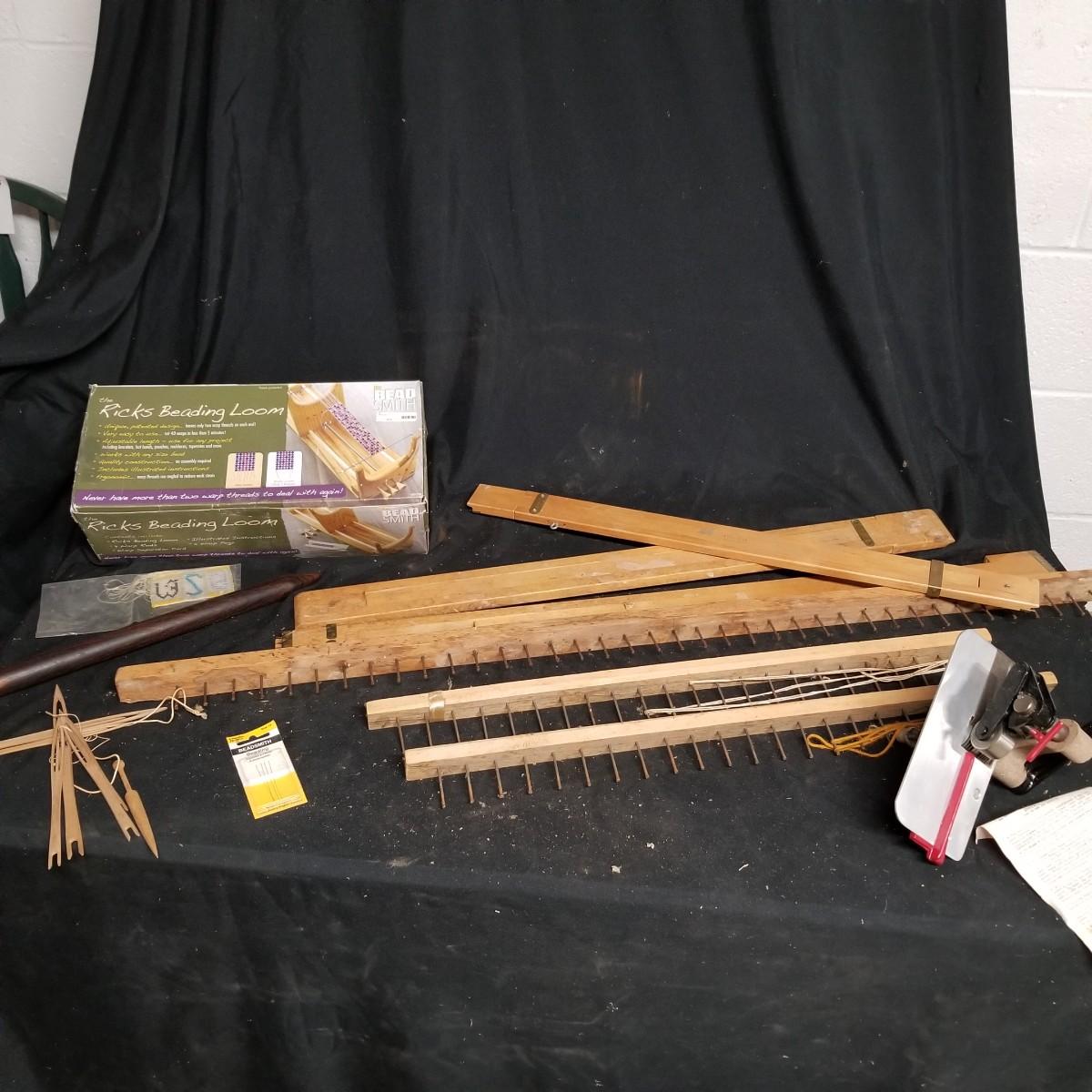 Various items for weaving.   New Rick's beading loom +needles, a Rigby cloth stripping machine, table mount, and several warp stretching items, some handmade and one Glimakra made in Sweden. Also a walnut knitting needle, 14" x1" d.  And #3, #5,and #8 netting or knife shuttles. Shipping available.